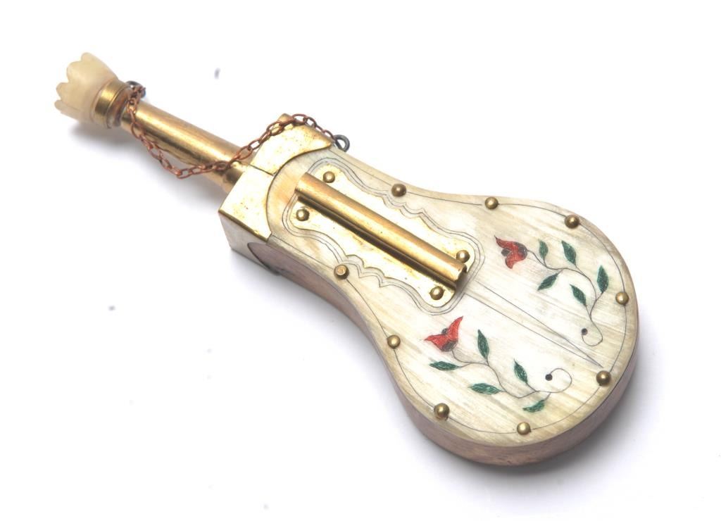 Outstanding handmade folk art flask constructed of carved horn on hardwood with a brass nipple pick container. The late 19th to early 20th Century piece is ornately crafted with a Pennsylvania Dutch look to it, in fine overall condition. A neat piece. Est.: $250-$500.