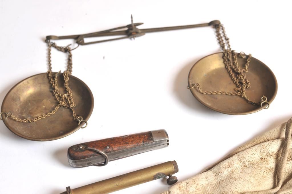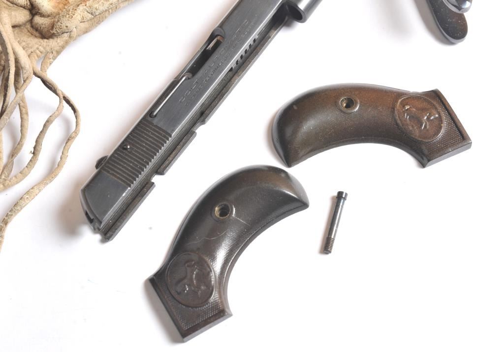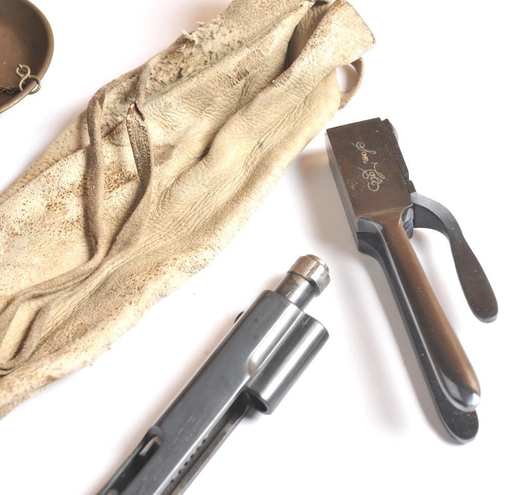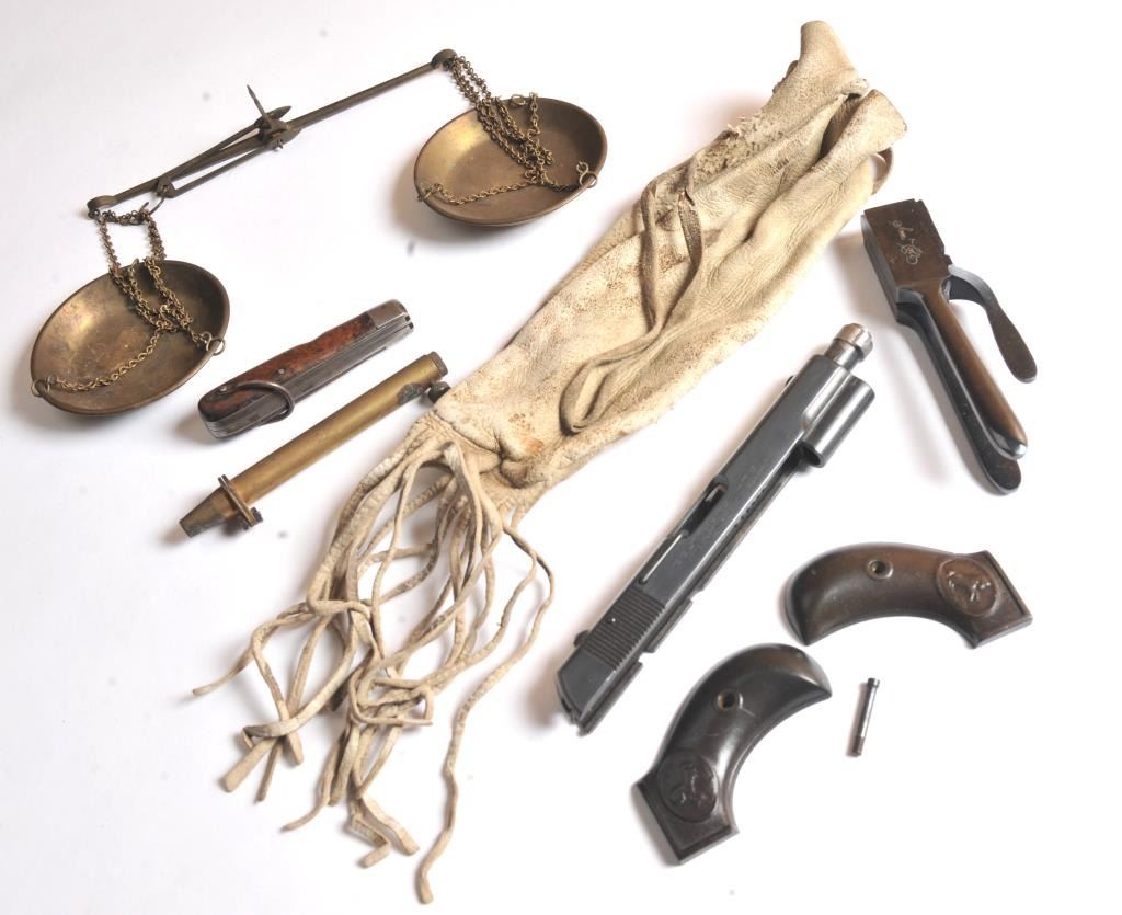 Bonanza lot of miscellaneous items including a slide and barrel assembly for a 1903 Colt, a brass powder spout, tanned leather fringe bag, vintage gold scale, set of checkered hard rubber bird head Colt grips, Samuel Colt marked Dragoon sized bullet mold and a vintage Ka-Bar marked folding knife with wooden scales. Est.: $150-$300.