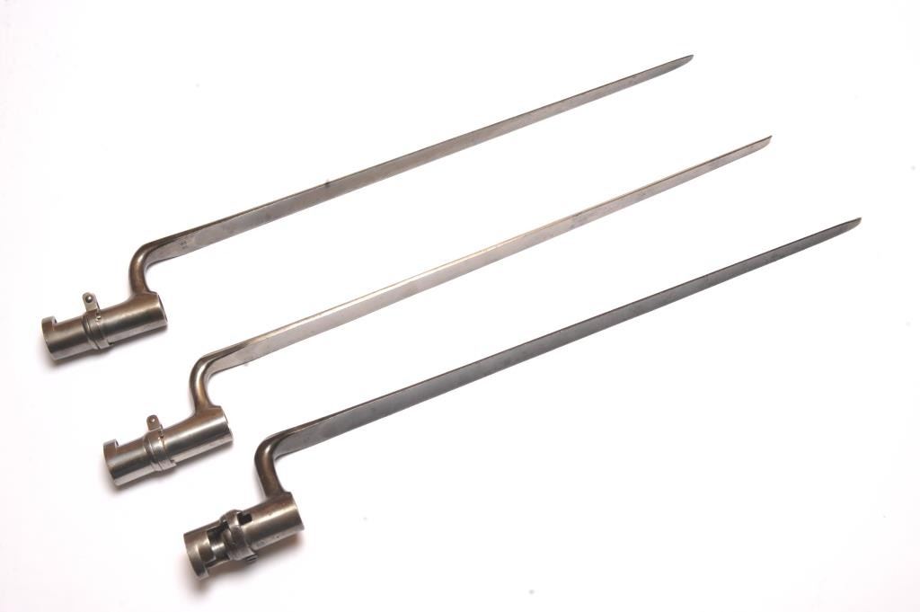Lot of three U.S. marked Civil War socket bayonets. The lot includes two Model 1855 bayonets for the .58 caliber musket and a Model 1840 for the .69 caliber. All three are in good to very good condition. Est.:$150-$300.