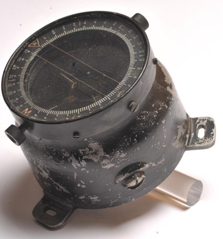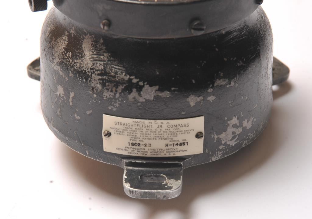 WWII era fighter plane compass with a 1941 patent date marked, “STRAIGHTFLIGHT J.R. COMPASS”. From Pioneer instrument, a division of Bendix Aviation in good condition. Est.: $150-$300.