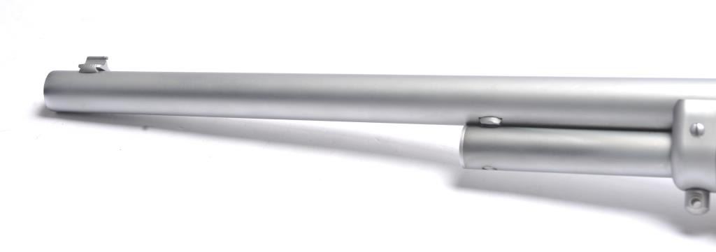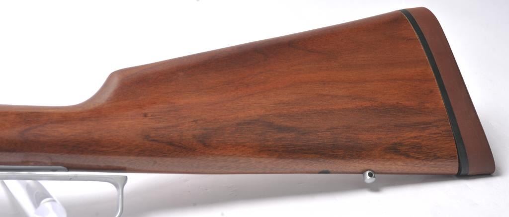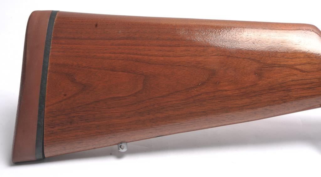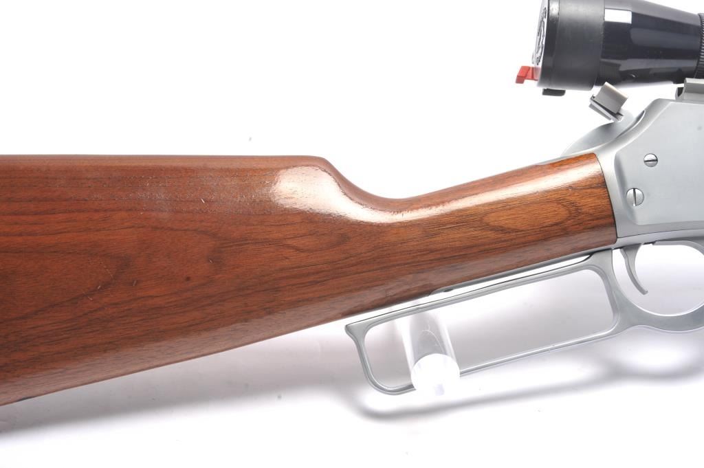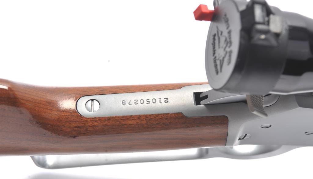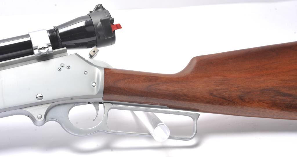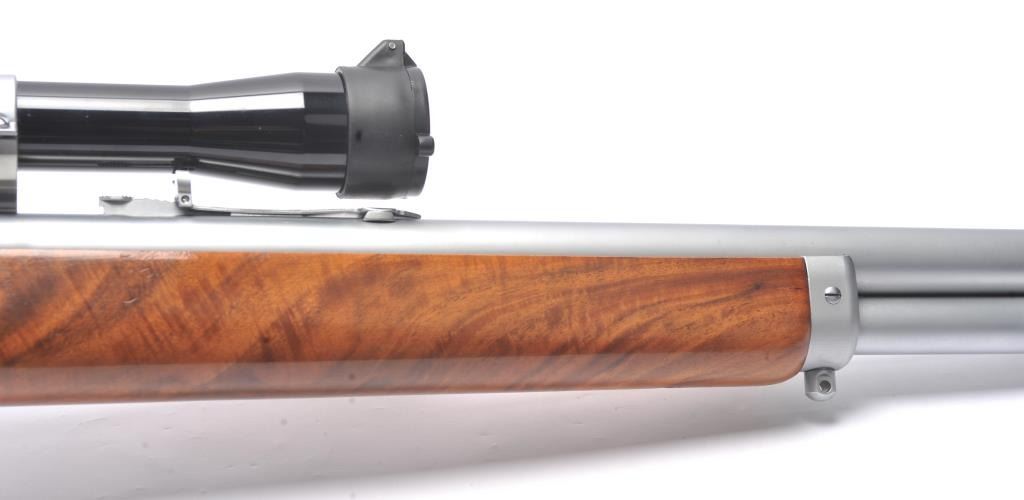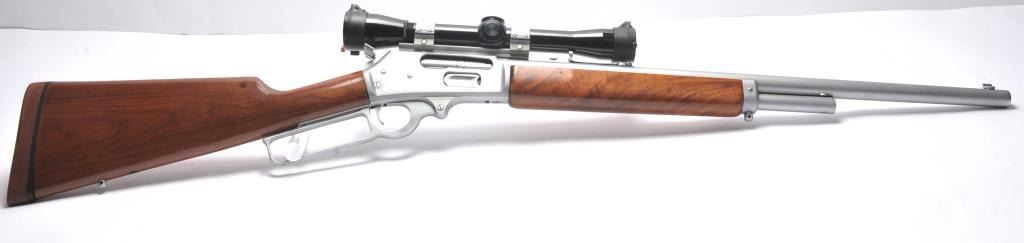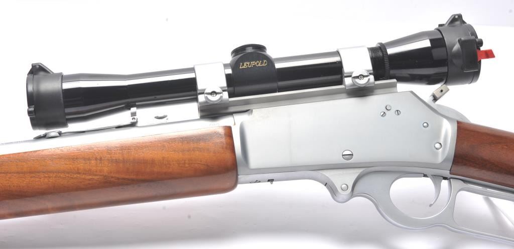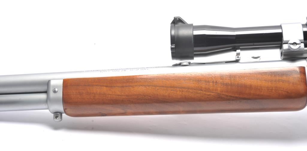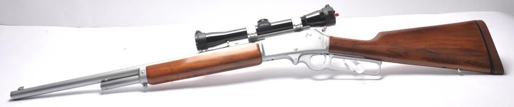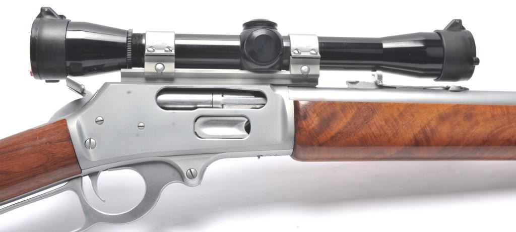 Custom Marlin Model 1895 lever action rifle, .45-70 caliber, Serial #21050278. The rifle is in fine overall condition with a 22” barrel and half magazine. The metal surfaces have been hard chromed with a matte finish. The smooth wood stock has been refinished and a solid rubber recoil pad added providing a 14 ½” LOP. The rifle is topped with a Weaver base, rings and a Leupold fixed 4x rifle scope. The bore is good, the action is crisp and the markings are sharp on this custom Marlin lever gun. Est.: $400-$800. (Modern/PPT).