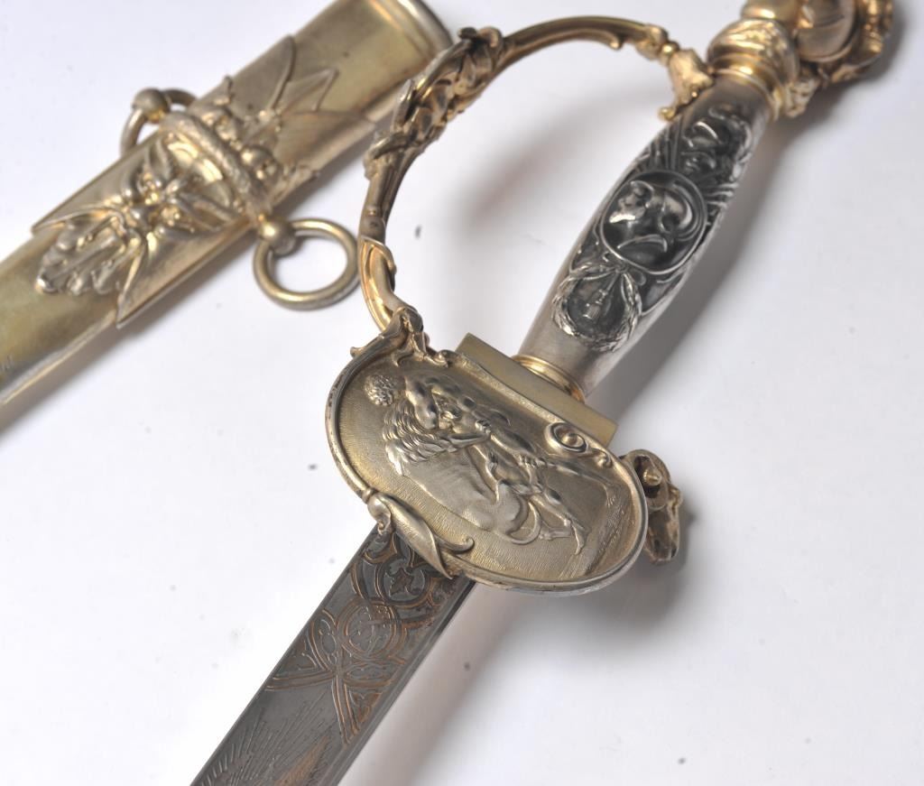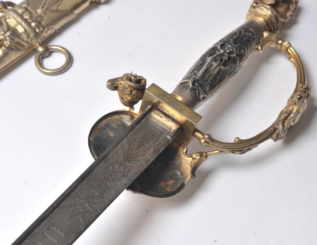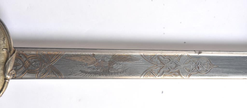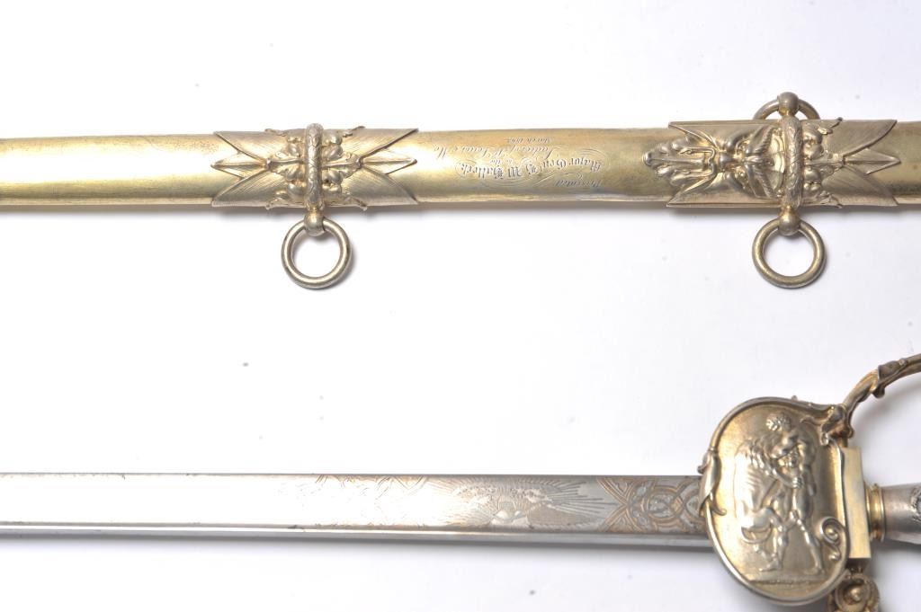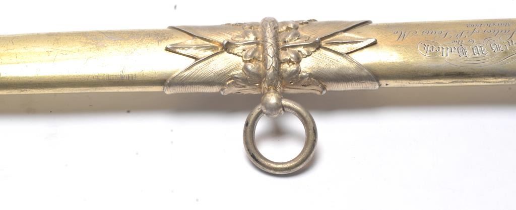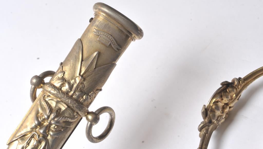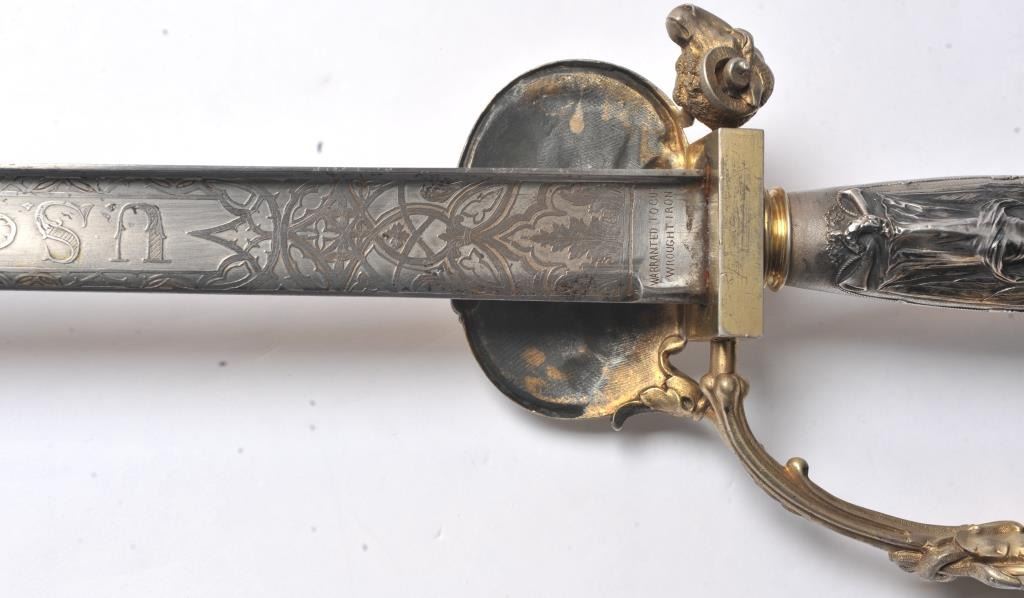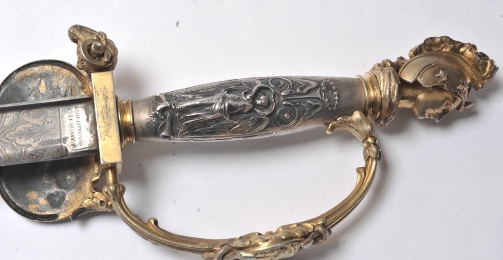 Physical Description: The sword measures 41” overall with a 32 ¾” blade marked on the left “Warranted to cut iron”, “E. Plurbus Unum” and “Tiffany New York”. The scabbard and hilt are silver decorated in relief with a bust of Columbia on the hilt. The balance of the sword is decorated in ancient figural motifs being the best of Tiffany’s quality and signed also on the scabbard “Tiffany & Co. Quality 925-1000 (Sterling Silver)”. The sword is in fine condition showing minor dents and creases in the scabbard and just normal aging. The over $500 original cost underscores the finity of this masterpiece by Tiffany as great pairs of cased engraved Colts were about $100 at this time! Also a period violin shaped blue velveteen lined case is included.