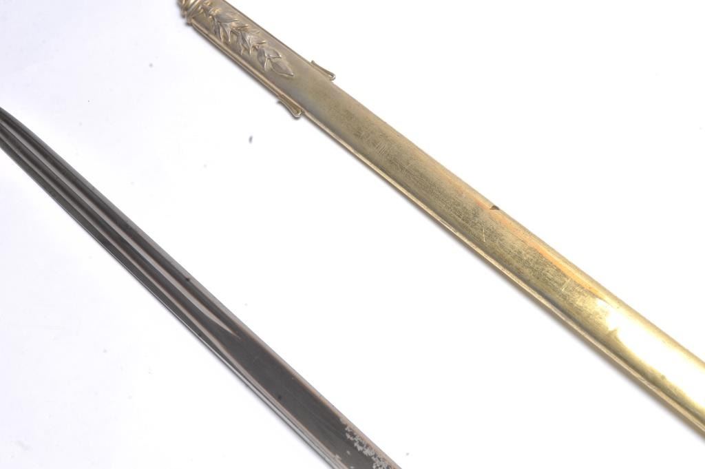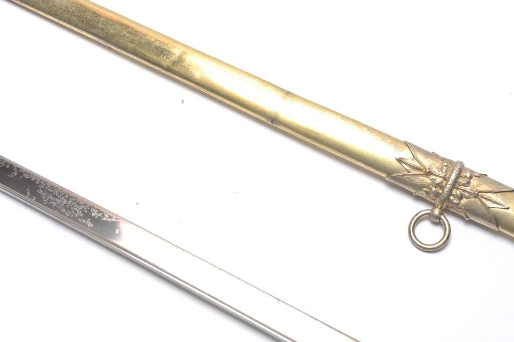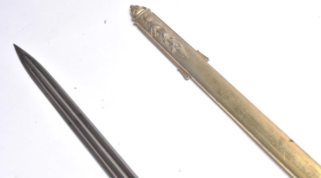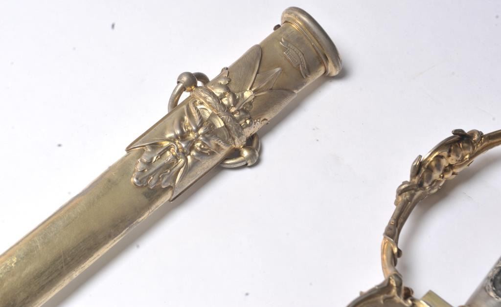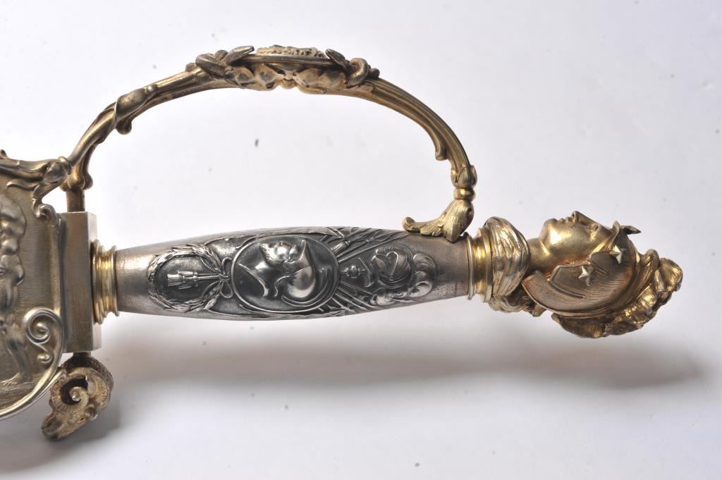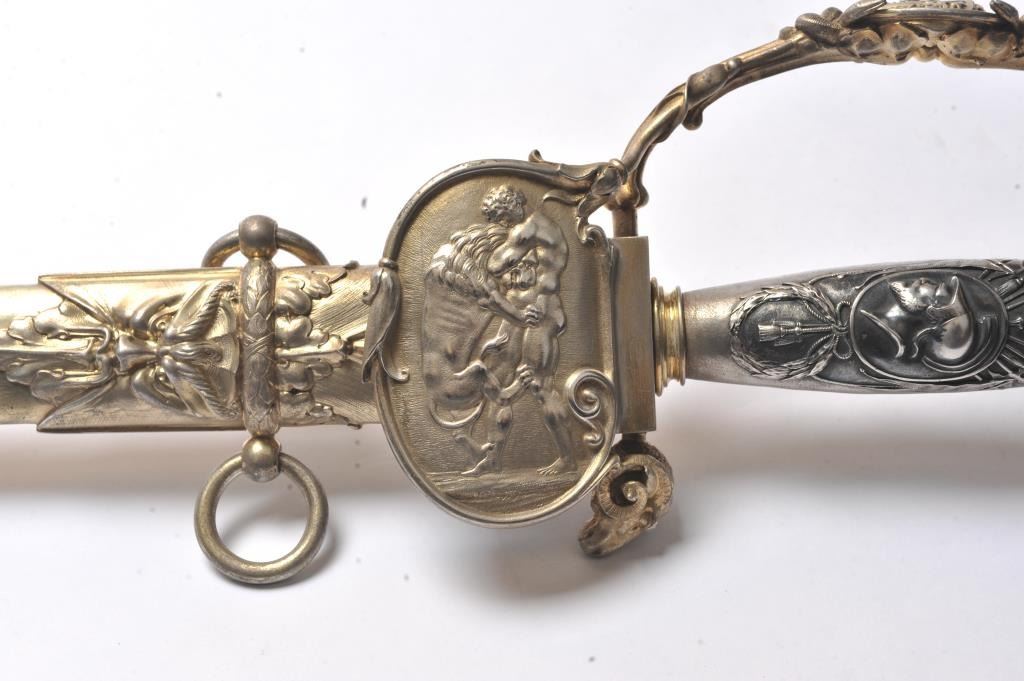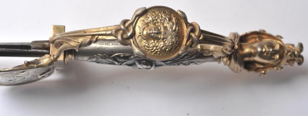 Physical Description: The sword measures 41” overall with a 32 ¾” blade marked on the left “Warranted to cut iron”, “E. Plurbus Unum” and “Tiffany New York”. The scabbard and hilt are silver decorated in relief with a bust of Columbia on the hilt. The balance of the sword is decorated in ancient figural motifs being the best of Tiffany’s quality and signed also on the scabbard “Tiffany & Co. Quality 925-1000 (Sterling Silver)”. The sword is in fine condition showing minor dents and creases in the scabbard and just normal aging. The over $500 original cost underscores the finity of this masterpiece by Tiffany as great pairs of cased engraved Colts were about $100 at this time! Also a period violin shaped blue velveteen lined case is included.