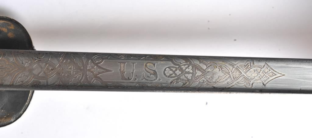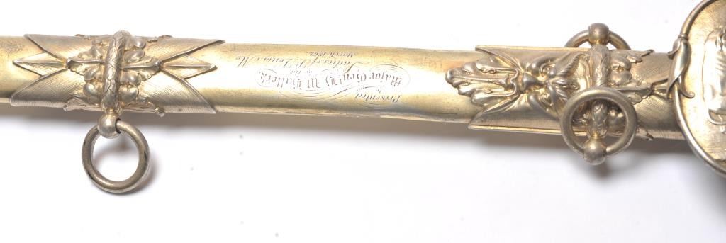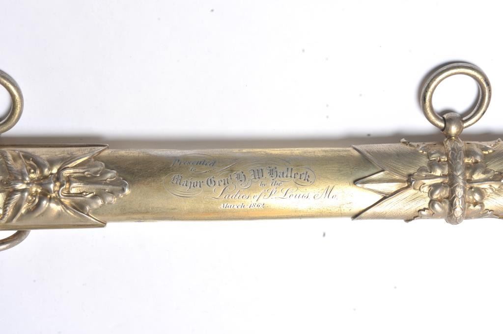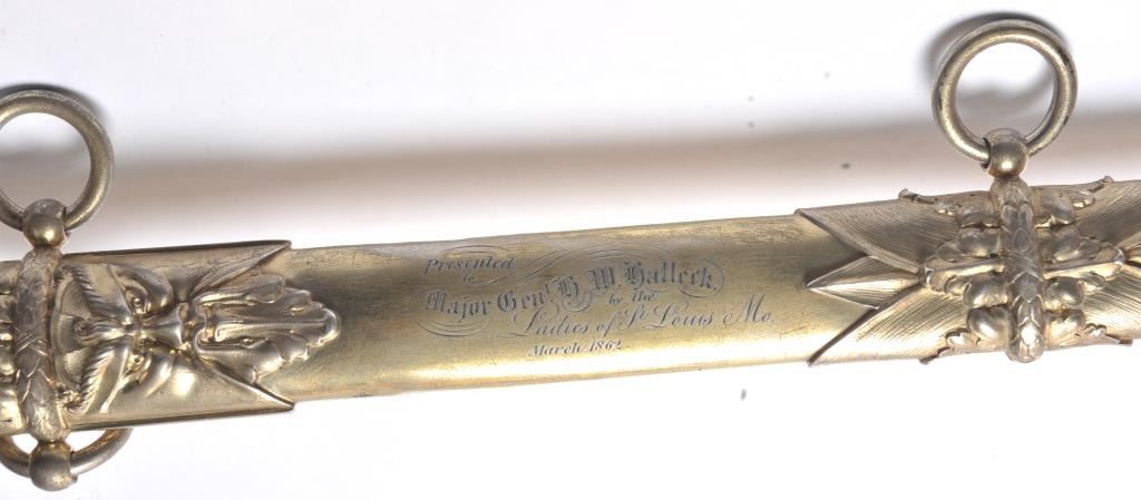 Incredible Civil War Presentation Sword by “Tiffany New York” in sterling silver and inscribed ‘Presented to Major Gen’L H.W. Halleck, By the Ladies of St. Louis Mo, March 1862”. This iconic sword was presented in response to fall of confederate strong hold Ft. Donaldson by the grateful ladies of St. Louis and is illustrated and mentioned in period articles and texts about this historic event that gave the republic its first significant victory over confederate forces. General Halleck is pictured in period photographs (1 included) wearing this exact sword and also it is illustrated in other periodicals and catalogs of the period Including Schyuler, Hartley and Graham catalog. It has recently been featured on the cover of the Civil War magazine. An identical Tiffany sword was presented to Gen. U.S. Grant in 1884 by the sanitary commission which now resides in the Smithsonian institution. General Halleck needs no introduction to students of Civil War history as he was 1 of 4 Major Generals of the U.S. Army preceding Grant. He served as General in chief of all Union Armies from 1862-1864. Nick named “Old Brains” he was considered a military expert and scholar but his predictable tactics allowed General Robert E. Lee to out fox and defeat him. Halleck was maligned for disputes with other High ranking Generals and his hesitation to attack or be aggressive allowed the confederate Army of Tennessee that was badly outnumbered and out gunned to escape at the battle of Corinth, Miss. Grant was made General in Chief of the Armies by Lincoln in March 1864 and Halleck was moved to Chief Staff where he served out the remainder of the war and excelled. He was pall bearer at Lincoln’s funeral. At the close of the war he was made commander of the division of the Pacific and later moved to Louisville, Kentucky in 1872 where he died at his post.