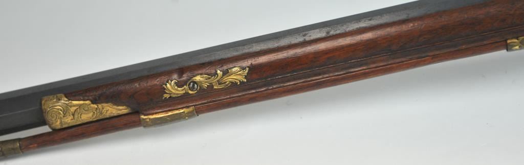 Percussion Target Type Schutzen Rifle with Wheelock style and reverse percussion hammer signed “Neuman” on the lock and “V. Neuman a Leoben” on the barrel. Fancy gilt mounts with exceptional pierced and figural sideplate.47 ¾” “swamped” octagonal barrel in .50 caliber deeply rifled bore. Nicely carved stock. Royal crest removed from cheek piece. Considerable original blue on the barrel and “Out of the Attic” condition probably a G.I.bring back in WWII. The stock has been set back at the fore end about 6”-8”. The action needs adjustment as not quite working properly. An interesting arm that would improve with T.L.C. (Antique) Est.:$1500-$3000