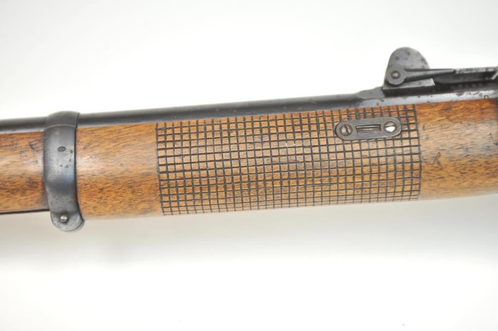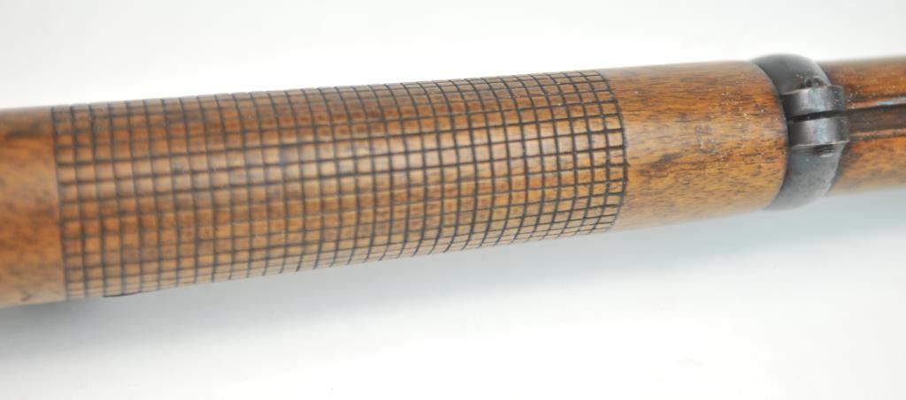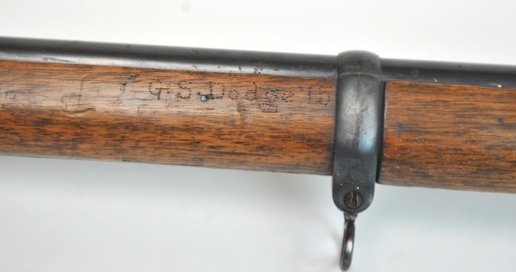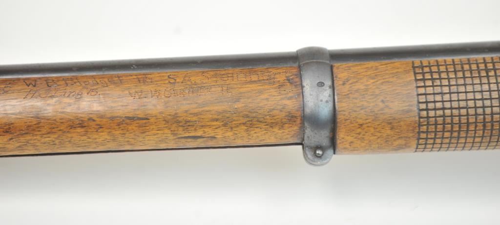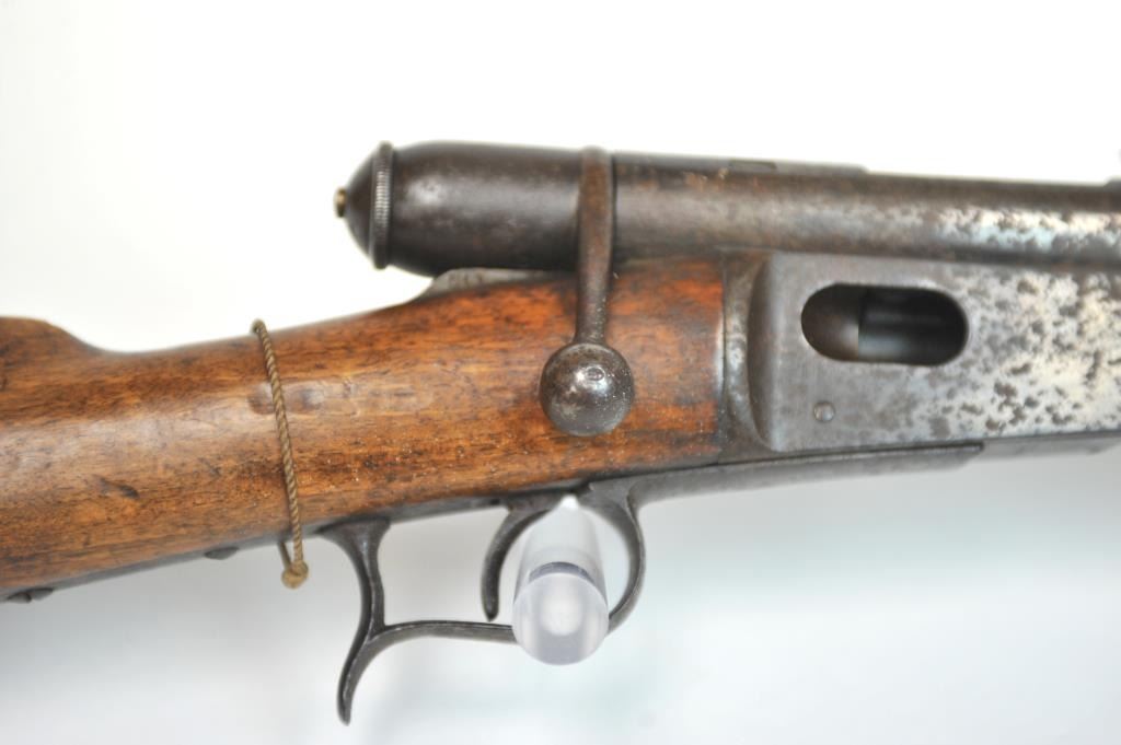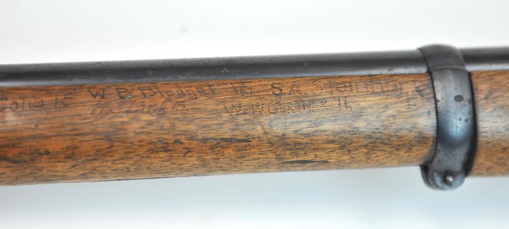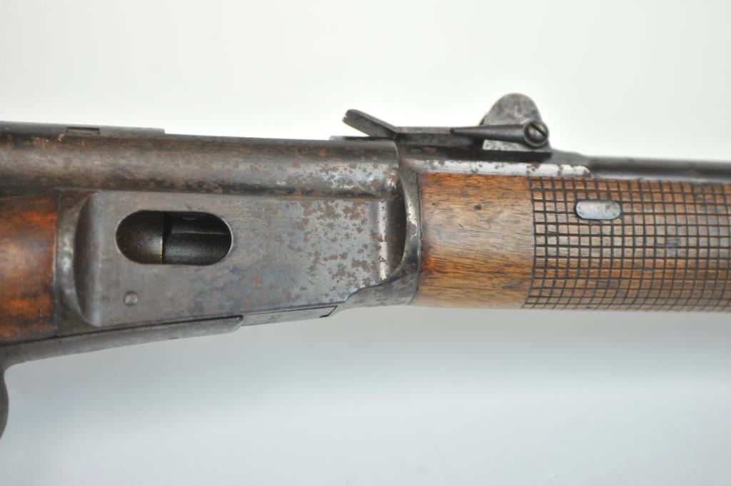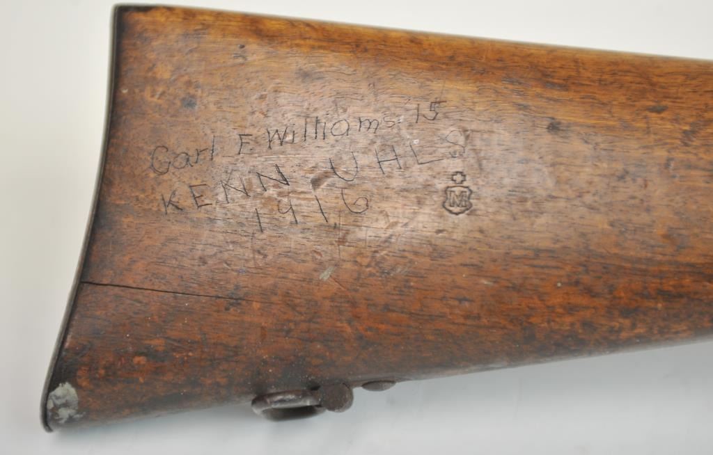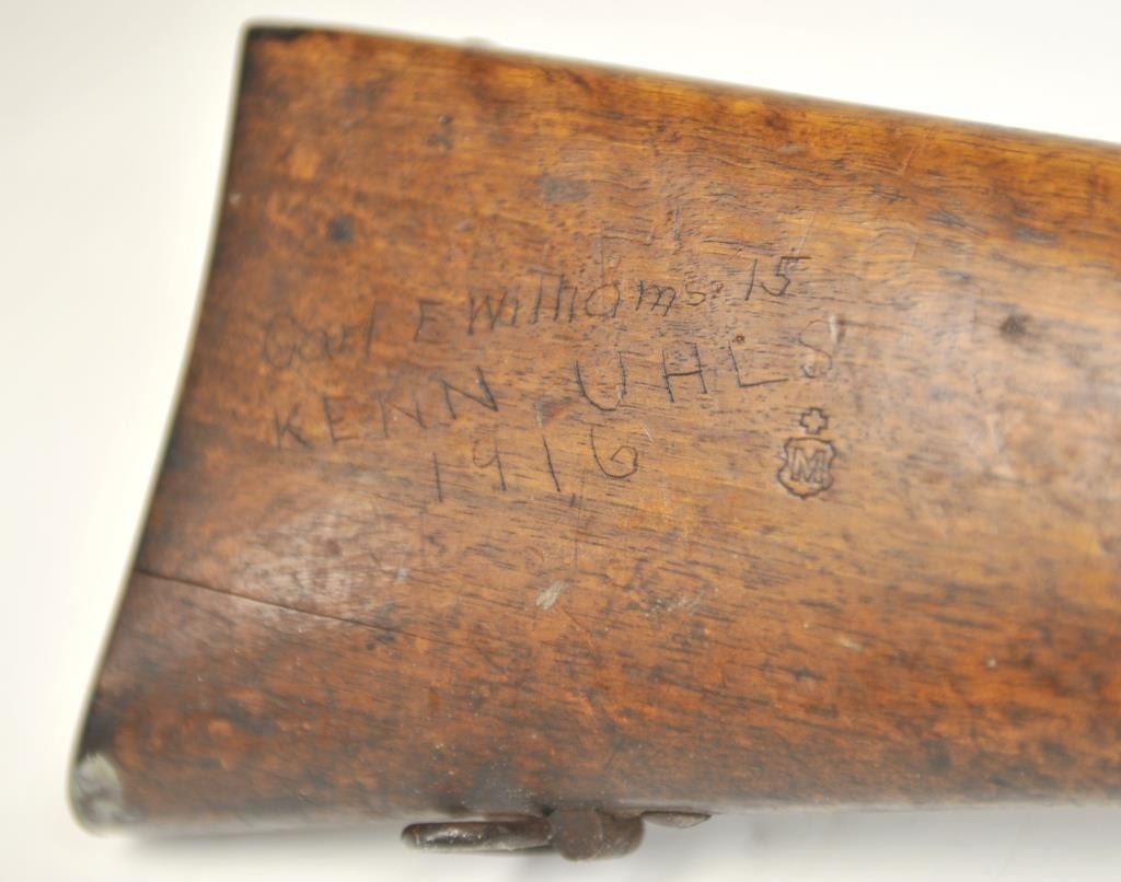 Swiss Vetterli Model 1869 bolt action rifle, 10.4 x 38 rimfire caliber, Serial #82162. The rifle is in fair overall condition with a 33” barrel with a blade front and military tangent style rear sights. The metalsurfaces retain significant toning blue finish drifting to dark patina with areas of light to moderate surface rust, primarily on the receiver. The checkered wood stock shows considerable use with dents andcompressions. Interestingly, there are a number of names crudely etched into the stock with dates which correspond with WWI. The bore is dark and the action functions. Est.: $200-$400. (Antique).