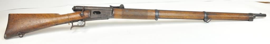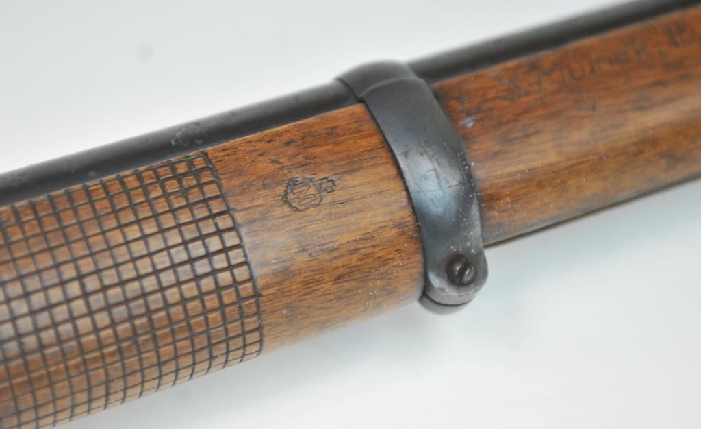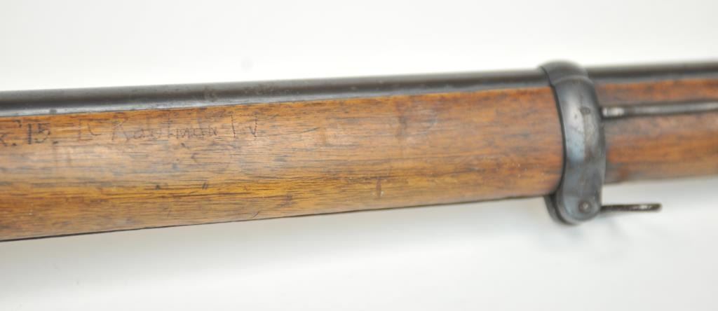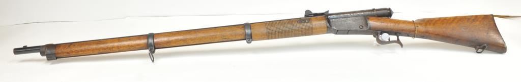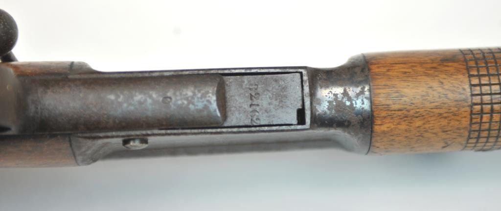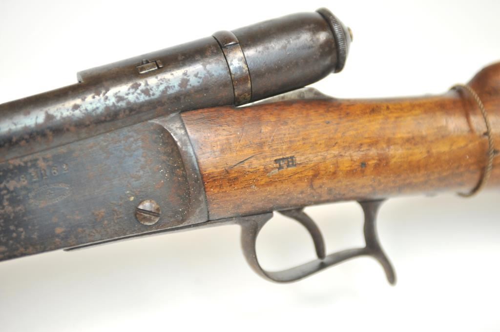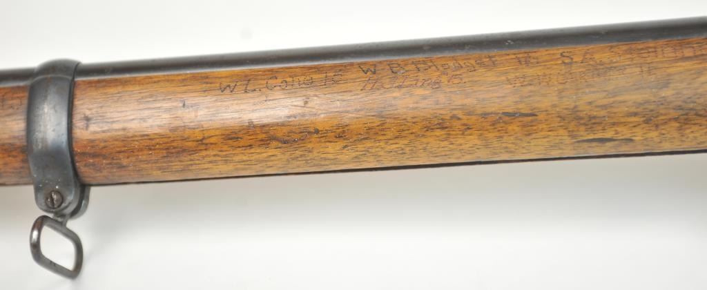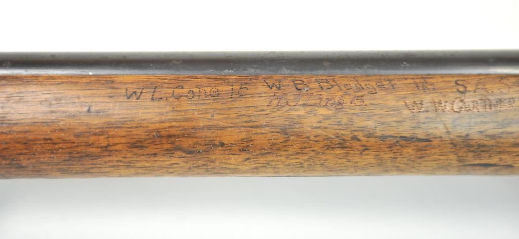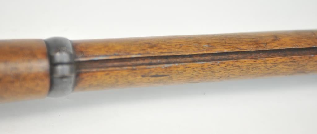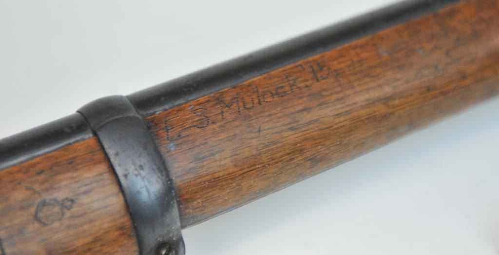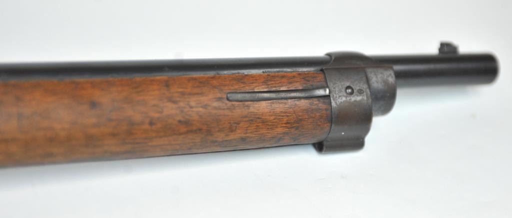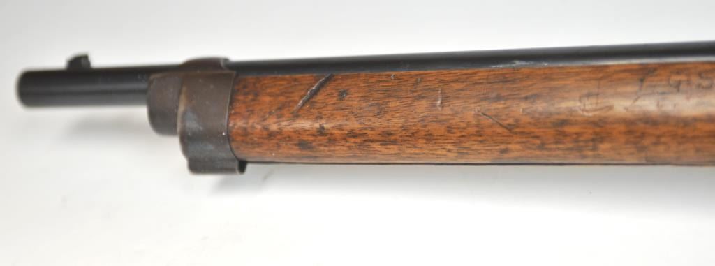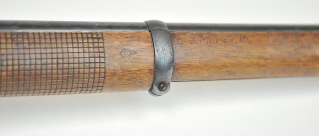 Swiss Vetterli Model 1869 bolt action rifle, 10.4 x 38 rimfire caliber, Serial #82162. The rifle is in fair overall condition with a 33” barrel with a blade front and military tangent style rear sights. The metalsurfaces retain significant toning blue finish drifting to dark patina with areas of light to moderate surface rust, primarily on the receiver. The checkered wood stock shows considerable use with dents andcompressions. Interestingly, there are a number of names crudely etched into the stock with dates which correspond with WWI. The bore is dark and the action functions. Est.: $200-$400. (Antique).