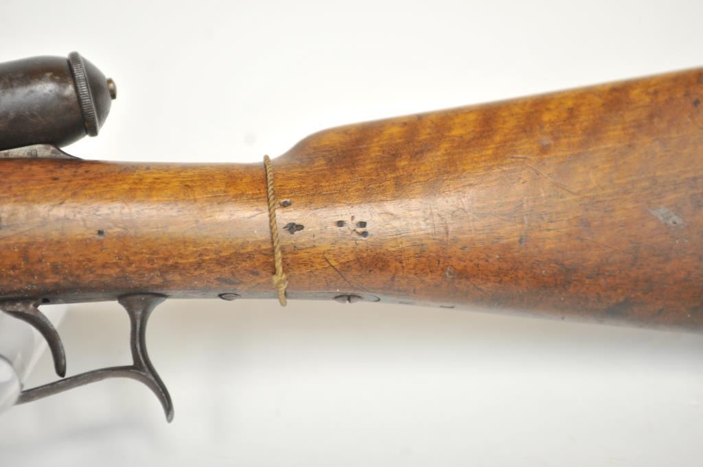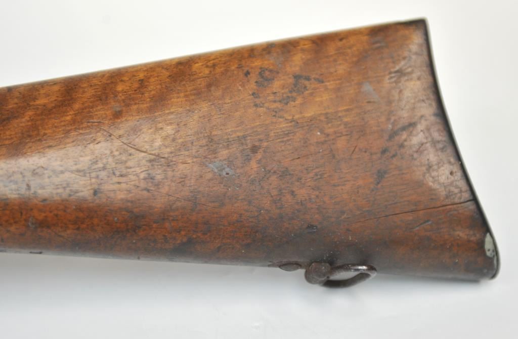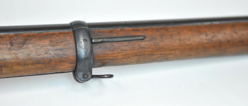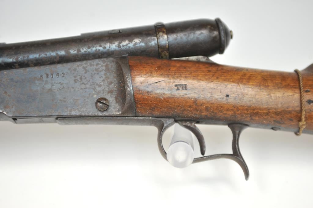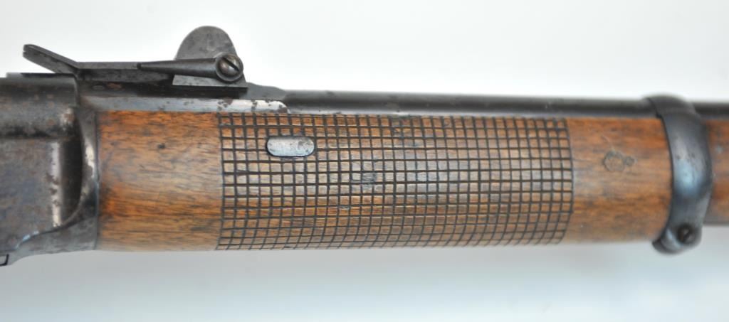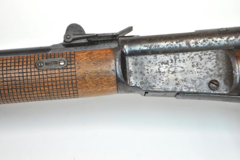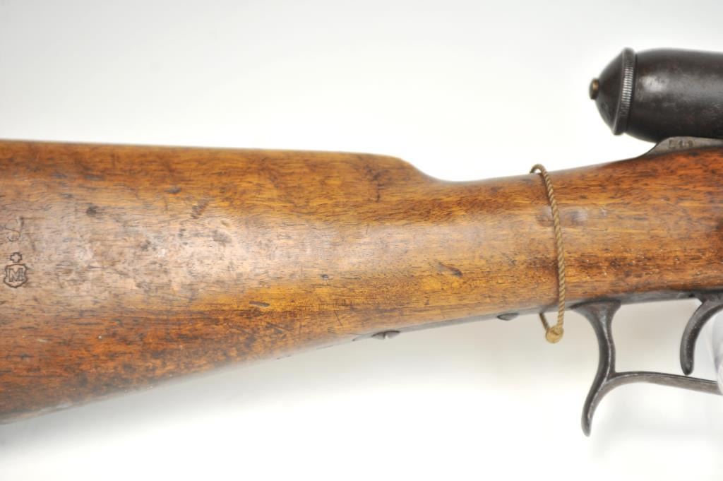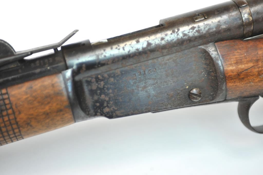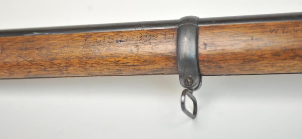 Swiss Vetterli Model 1869 bolt action rifle, 10.4 x 38 rimfire caliber, Serial #82162. The rifle is in fair overall condition with a 33” barrel with a blade front and military tangent style rear sights. The metalsurfaces retain significant toning blue finish drifting to dark patina with areas of light to moderate surface rust, primarily on the receiver. The checkered wood stock shows considerable use with dents andcompressions. Interestingly, there are a number of names crudely etched into the stock with dates which correspond with WWI. The bore is dark and the action functions. Est.: $200-$400. (Antique).