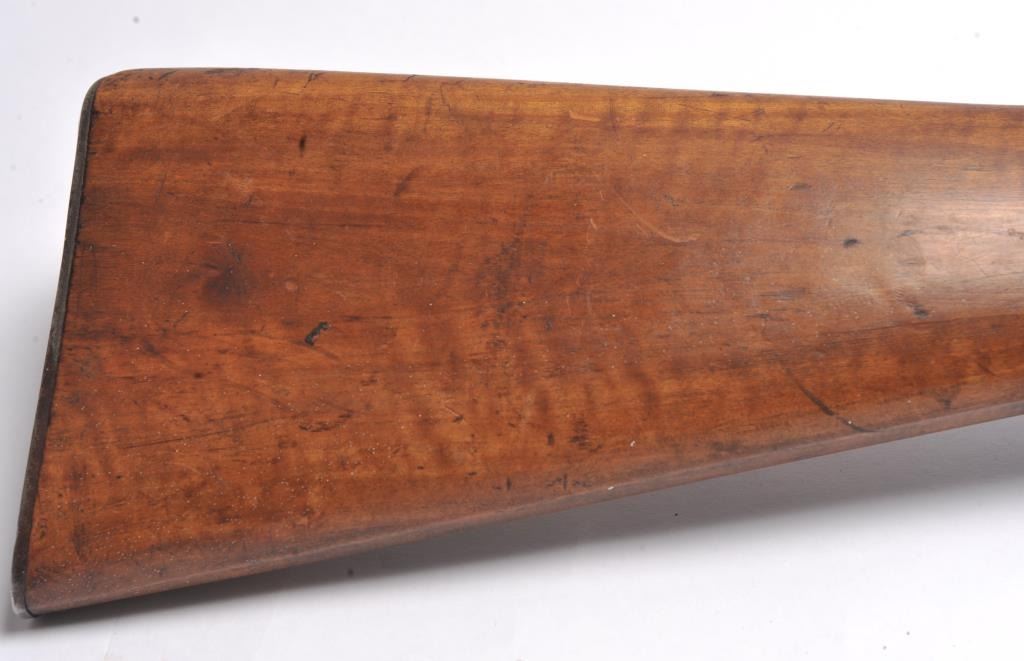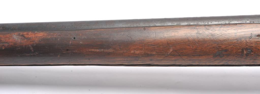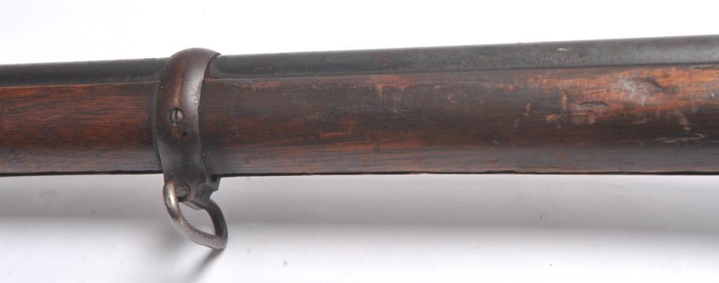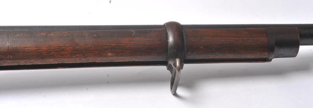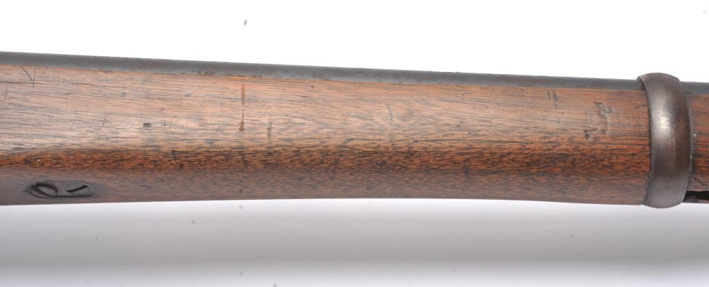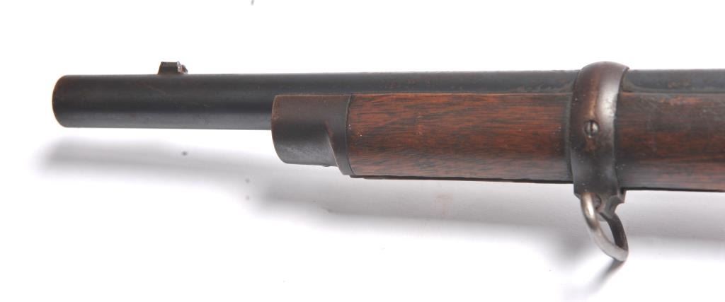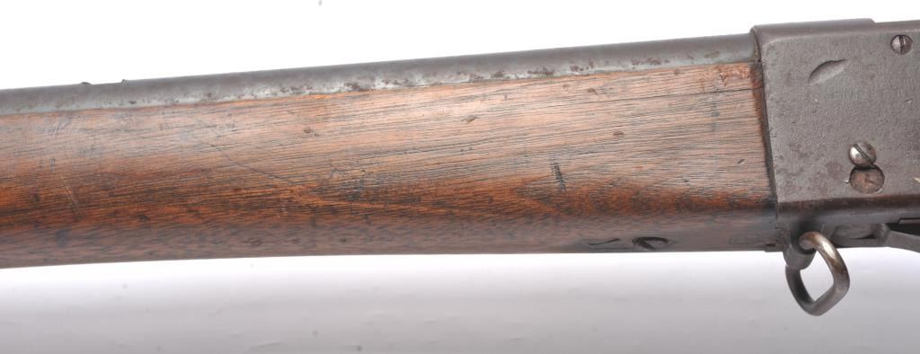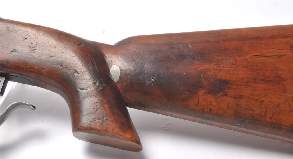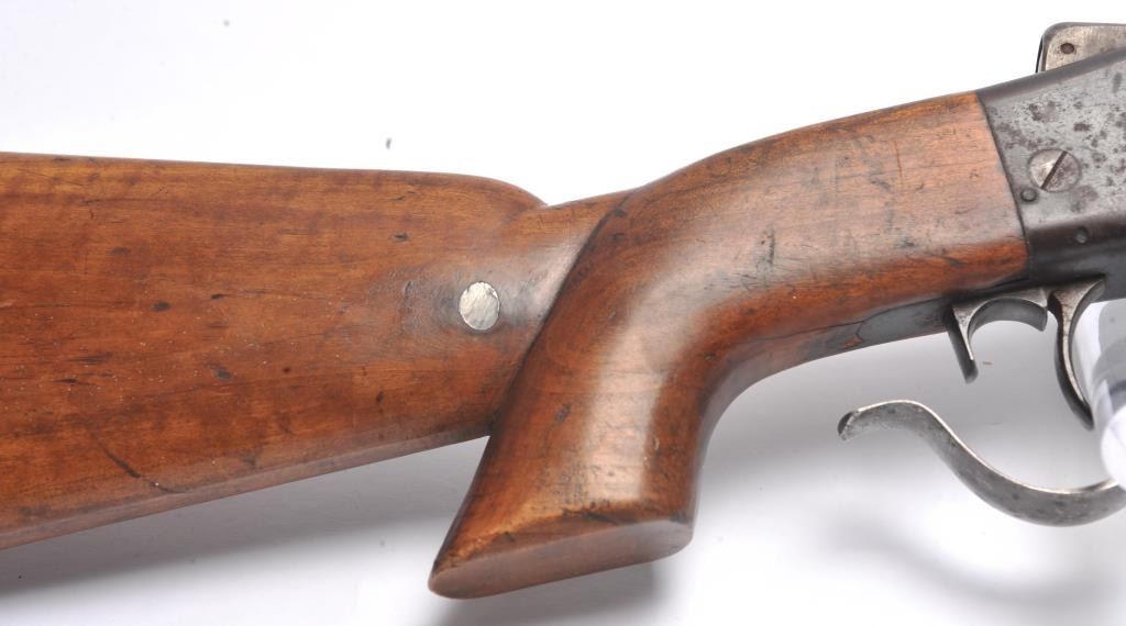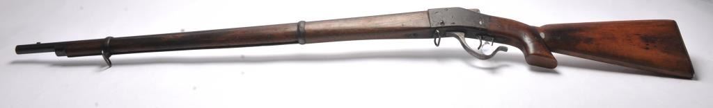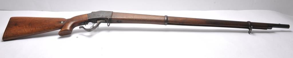 Sharps Borchardt single shot rifle, .45 caliber, Serial #15735. The rifle is in good overall condition with a 32” barrel. The metal has gone to an overall dark patina with light surface rust and erosion. The frontand rear sights are removed, the ramrod is missing and the sling swivels are retained. The breech block and trigger guard show muted case hardening. The wood is in good condition with mars and compressions showingmoderate to heavy use. The buttstock is a hand carved replacement with an exaggerated pistol grip, repair behind the wrist and a lateral crack at the tang. The rifle descended from a 3rd generation pioneerfamily in the Carson City/Reno area of Nevada and was used on the family ranch. The bore is dark, the action functions and the markings are legible on this neat old Sharps Borchardt with a Sierra Nevada history.Est.: $700-$1,400. (Antique).