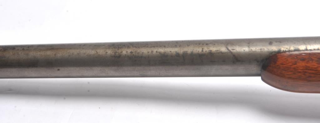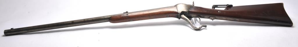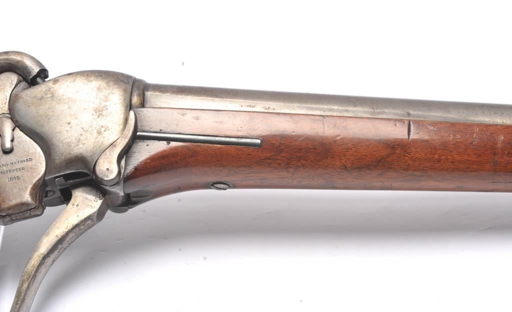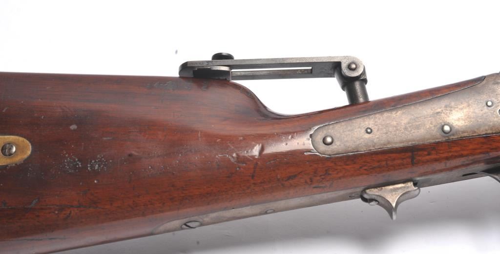 Sharps Model 1851 Percussion Round Barrel Sporting Rifle in .36 caliber with 28” barrel, Maynard tape priming device, tang sight and brass mounts, S/N 1969. 1 of only approximately 400 produced and these goldrush arms were highly prized by Mormon pioneers, 49ers and early frontiersman. The metal surfaces show a light gray and brown patina finish with just minor erosion and pinprick pitting. Sharp markings and patentdates. The wood is very good with some minor dings, scratches and small imperfections but at least 80% original varnish remains with pleasing color and great wood to metal fit. There is writing in the finish remaining onthe barrel in block letters that we can not decipher. The action is tight and the bore is very good with well-defined rifling and fairly bright. Also minor erosion and sign of some use. Refer Flayderman 5F-004. Est.:$5,000-$10,000