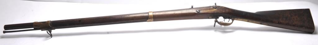 Robbins & Lawrence Model 1841 Mississippi rifle, .58 caliber, dated 1851 with an 1848 Peace flask by Batty and a period bullet mold. The rifle is in good overall condition with a 33” barrel, full-length iron ramrod,brass barrel bands, steel barrel band retaining springs and a mottled brown patina on the barrel. The side plate is marked, “WINDSOR VT 1851” and “ROBBINS & LAWRENCE US” under the hammer. The smooth wood stock isin good condition showing heavy use with dents and mars, brass hardware and an old crude repair behind the side plate. Sling swivels, brass patch box and a brass butt plate. The action is good and the bore isdark. The gun is complete with Western or Gold Rush changes, issued by Western Forts to wagon trains by order of Jefferson Davis, with double set triggers and Western sights. The flask is in good condition with a nicepatina, small dents and tight seams. The iron mold has good cavities and a brown patina. The lot was found together in a Salt Lake City collection. Est.: $1,250-$2,500. (Antique).