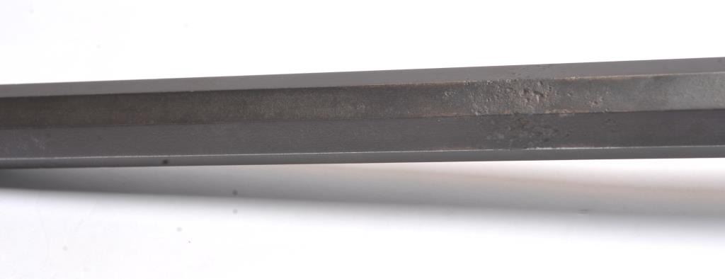 Sharps Model 1853 single shot rifle, .52 caliber, Serial #20753. The rifle is in good overall condition with a 26” octagon barrel with a German silver blade front and ladder style rear. The rear ladder sight is missing the elevator and cracked on one side. The metal surfaces have gone to dark patina with some light pinprick pitting on the barrel and areas of light surface erosion noted. The barrel flat is marked, “SHARP’S RIFLE MANUFG. CO. HARTFORD, CONN.”. The side plate is marked, “SHARP’S PATENT 1852”, single trigger with the serial number on the tang. The smooth wood stocks are in good condition showing mars and compressions with a metalcap on the fore end, patch box on the right side of the stock and smooth steel butt plate. The rifle has a good bore, crisp action and legible markings. One of only 295 manufactured in this caliber, the rifleweighs a respectable 9.2 pounds. Est.: $3,000-$6,000. (Antique).