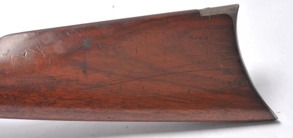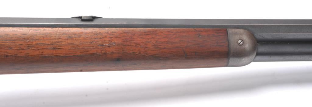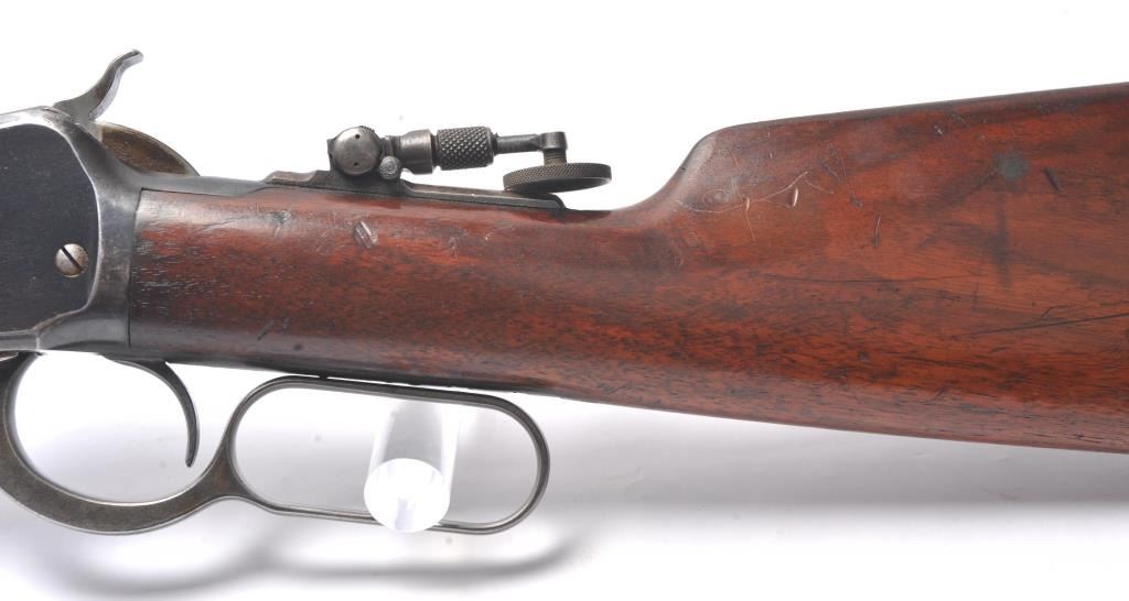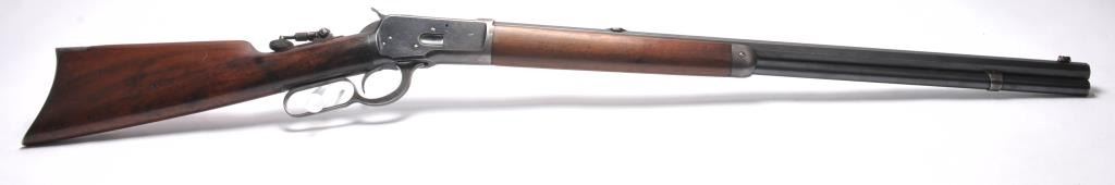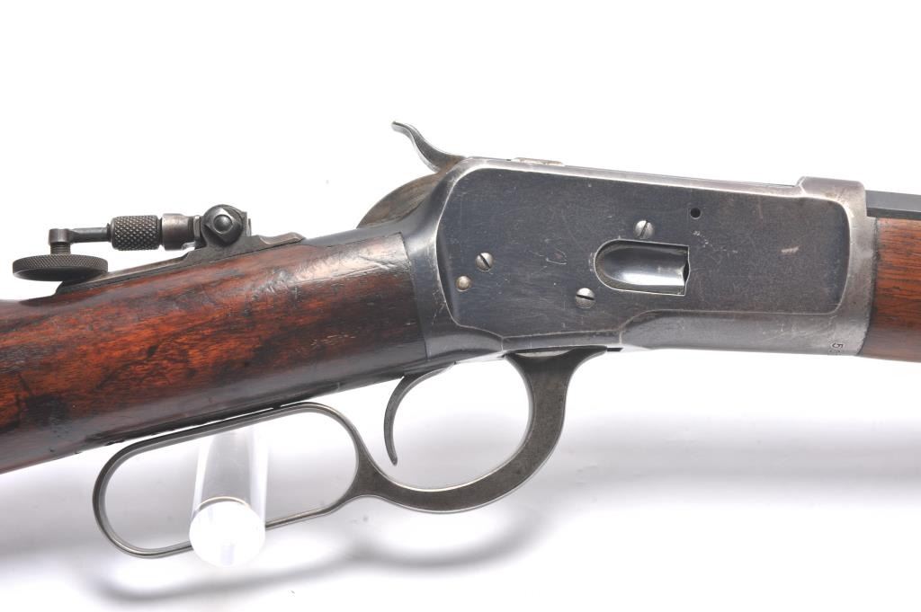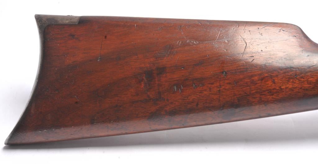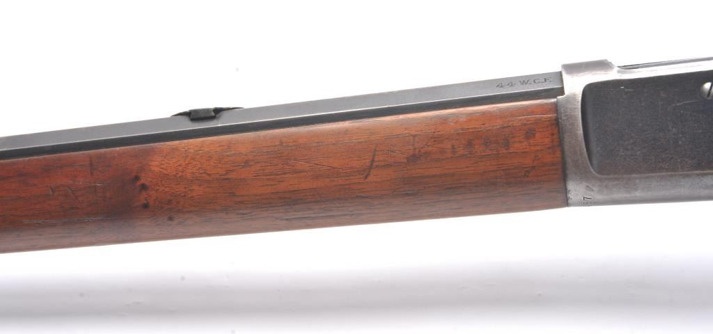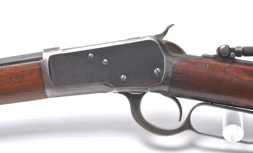 Winchester Model 1892 lever action rifle, .44 WCF caliber, Serial #503487. The rifle is in near fine overall condition with a 24” octagon barrel and full-length magazine tube. The rifle retains approximately 85-90% ofthe muted blue finish with sharp edges, a Beeches folding front sight and the rear sight removed with the dovetail filled. There are light scratches and small mars, primarily on the barrel. The hammer, trigger and lever assembly show muted, original case hardening. A period Lyman tang sight has been added during the period of use. The smooth wood stock is in very good condition with compressions and scratches consistentwith field use and ends with a smooth steel crescent butt plate. The bore is fine, the action is crisp and the markings are sharp on this outstanding Model 1892 circa 1909, in .44 WCF with special sights. Est.:$3,000-$6,000. (C+R/PPT).