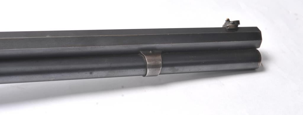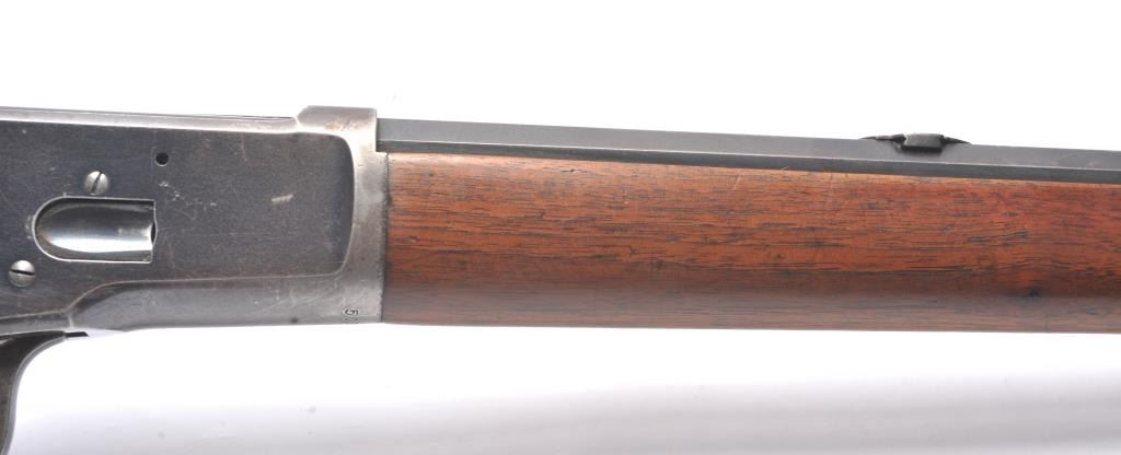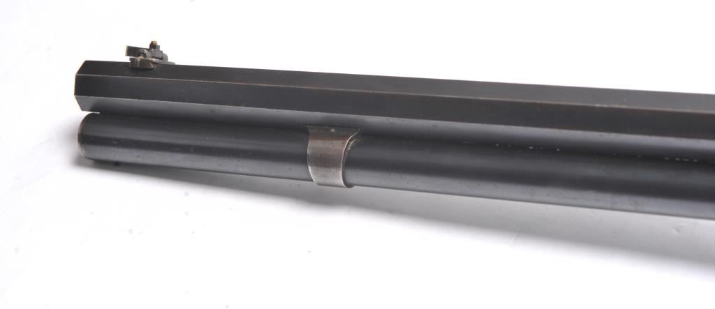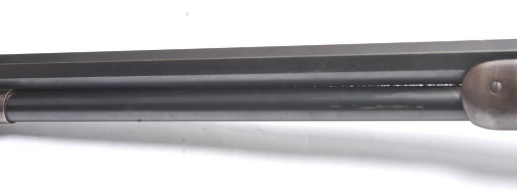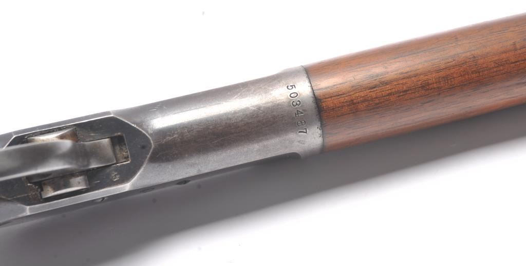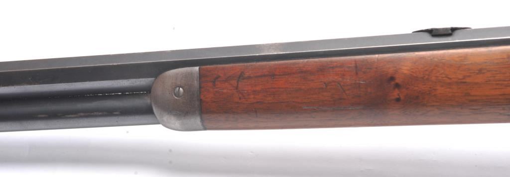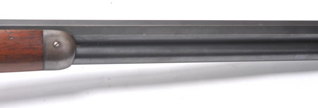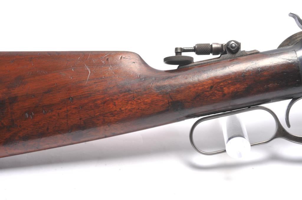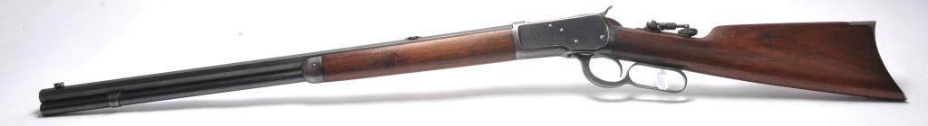 Winchester Model 1892 lever action rifle, .44 WCF caliber, Serial #503487. The rifle is in near fine overall condition with a 24” octagon barrel and full-length magazine tube. The rifle retains approximately 85-90% ofthe muted blue finish with sharp edges, a Beeches folding front sight and the rear sight removed with the dovetail filled. There are light scratches and small mars, primarily on the barrel. The hammer, trigger and lever assembly show muted, original case hardening. A period Lyman tang sight has been added during the period of use. The smooth wood stock is in very good condition with compressions and scratches consistentwith field use and ends with a smooth steel crescent butt plate. The bore is fine, the action is crisp and the markings are sharp on this outstanding Model 1892 circa 1909, in .44 WCF with special sights. Est.:$3,000-$6,000. (C+R/PPT).