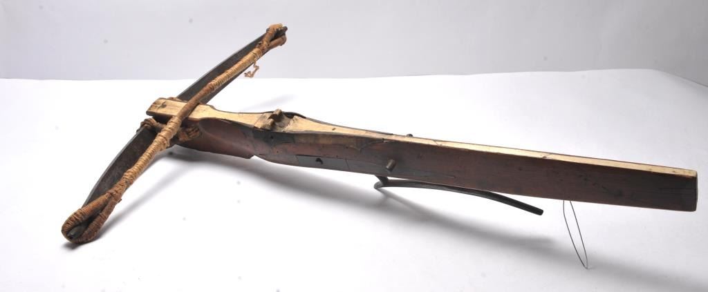 A 17th Century (or earlier) German Crossbow With White Staghorn Inlays. The fruitwood shaft of Renaissance form with pronounced swelling in center is 28 inches in length. The heavy forged iron bow is 20 inches wide.Finely forged wrought iron tiller of early form. This rare crossbow retains original flax cords tender with age and iron bow is loose. One large stag horn inlay missing on underside of shaft. The form of this bow isalmost Gothic in style. Small imperfections on fruitwood shaft. A very handsome early crossbow made for use with a crannequin showing its great age but retaining a most attractive and displayable appearance. Wouldlook great with a suit of period armour, wheel locks, or European matchlock. Estimate: 1000-2000