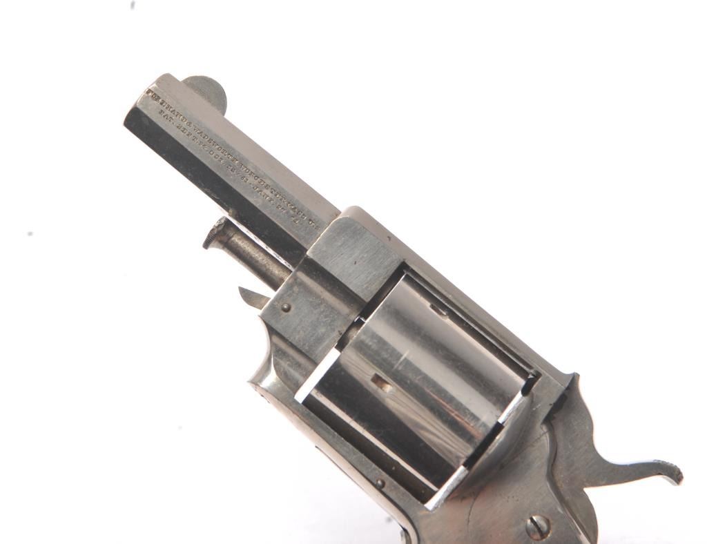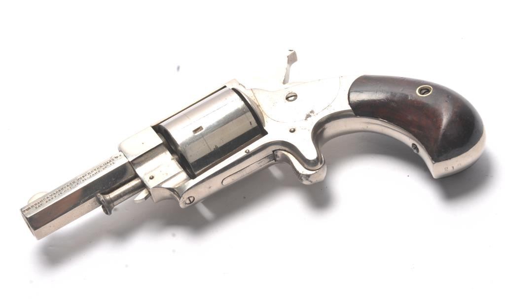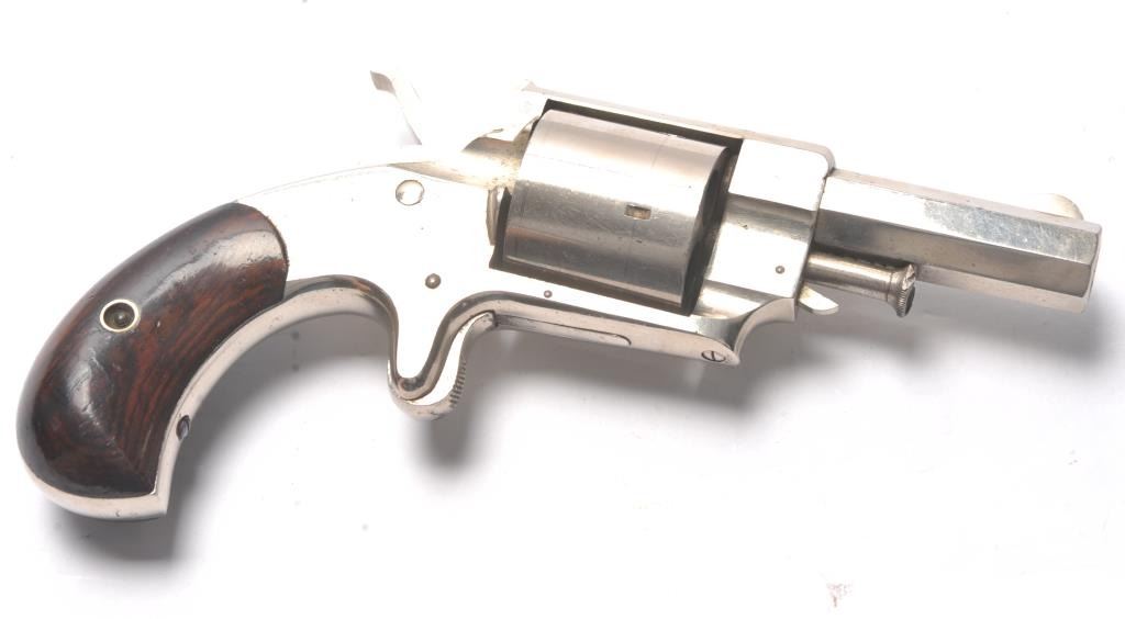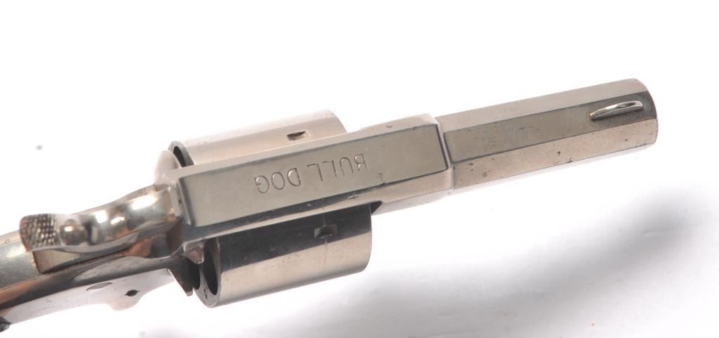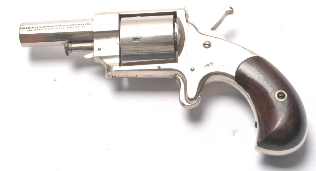 A Near Mint Antique Forehand And Wadsworth Center Hammer .38 Rimfire “BULLDOG” Revolver. Serial # 213. This super condition Western expansion period revolver retains nearly 100% bright original nickel finish. Perfectmarkings. Original rosewood birds head grips have most original varnish with a few minor marks. Revolver does not cock which explains its fantastic condition. Mainspring is strong so just needs adjustment.Estimate: 300-600