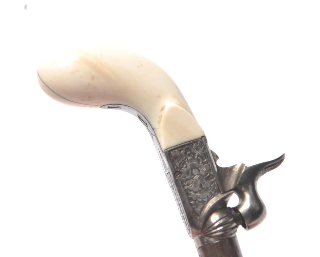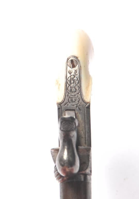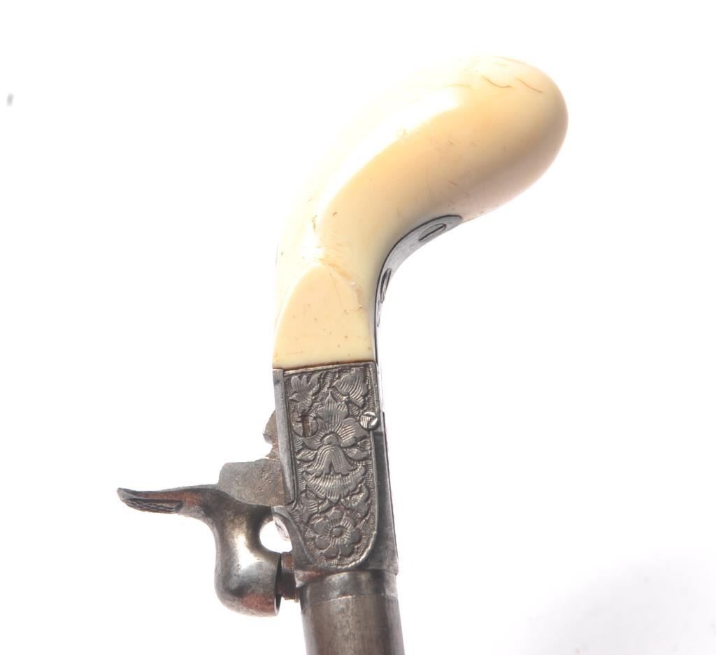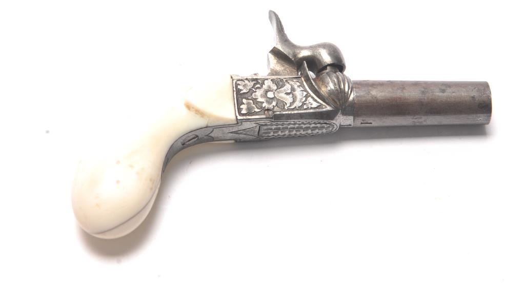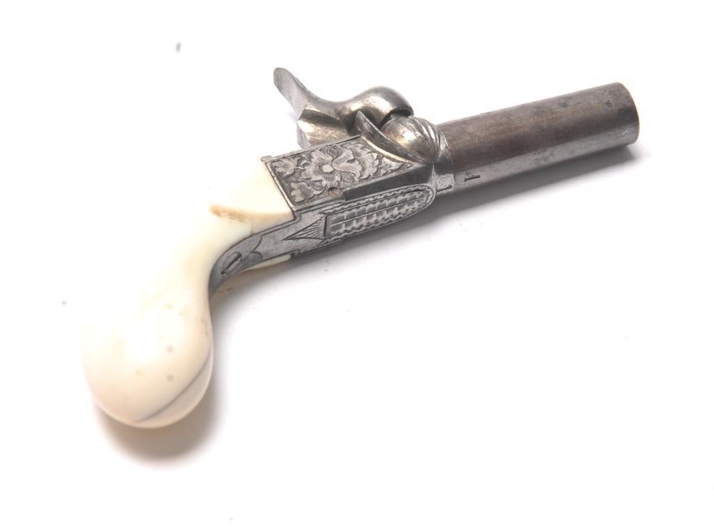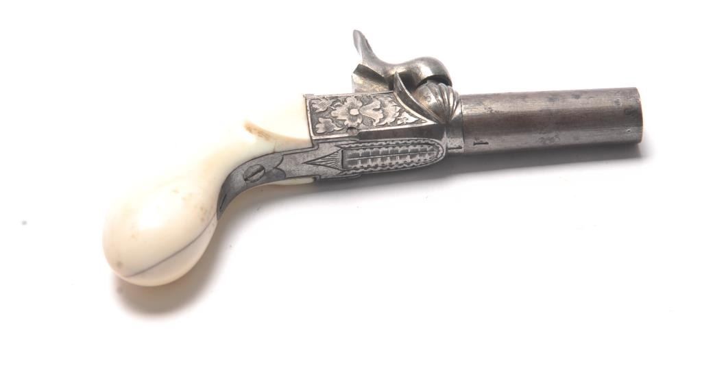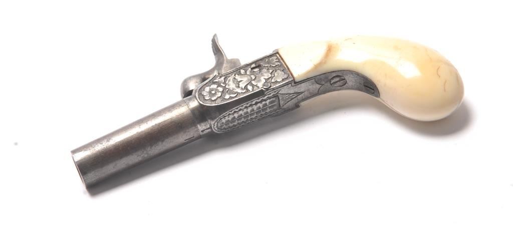 A Fine And Rare Working Miniature Ivory Gripped French Single Shot Rifled Percussion Pistol With Folding Trigger Circa 1850. This little gem has a 1 and 1/4 inch fully microgroove rifled round barrel stamped “1”.The frame is beautifully chiseled in low relief with blossoms and leaves. The folding trigger is engraved. The hammer is plain with checkered spur. Shaped ivory bag grip with lovely 170 year old mellow patina and onetight age crack. Only 4 inches overall. Action is fine. A perfect cabinet piece or gift for that special lady who likes guns. Estimate: 600-900