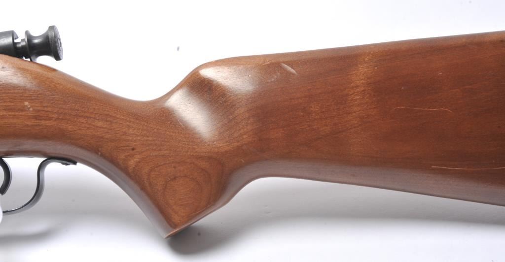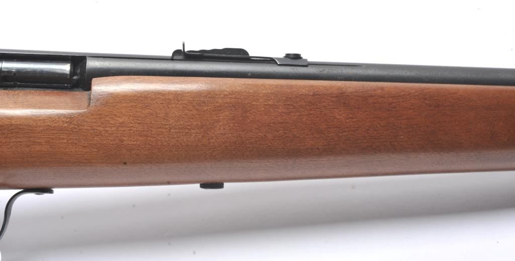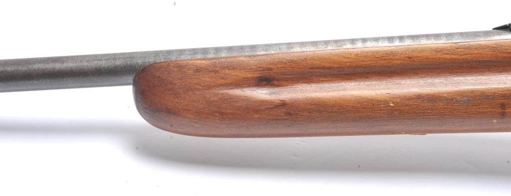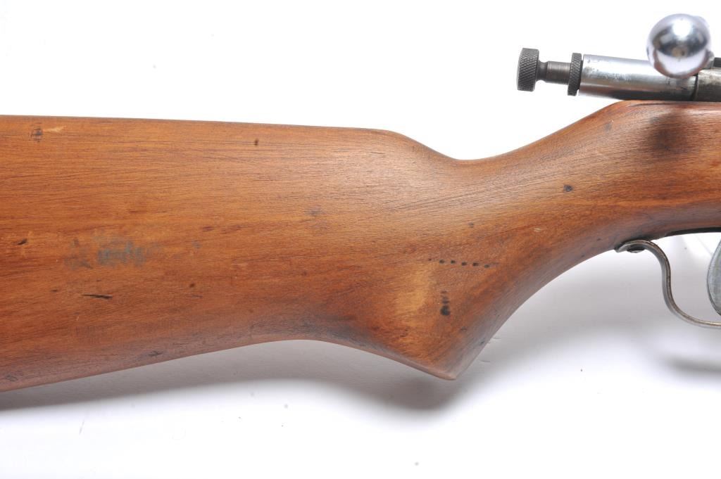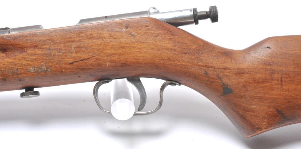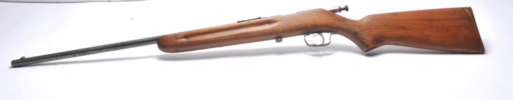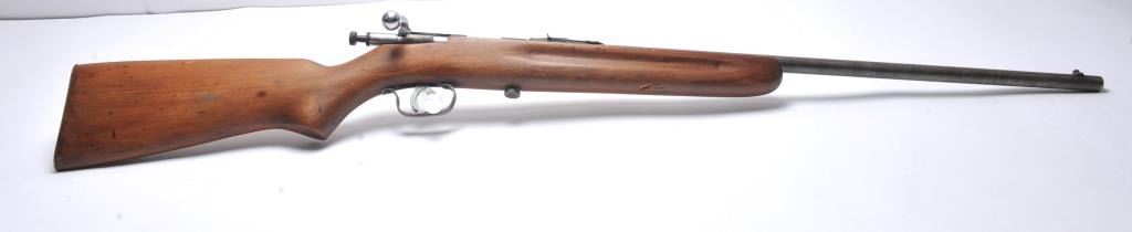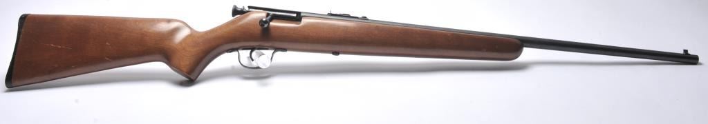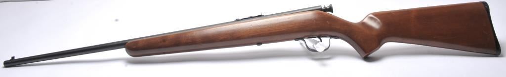 Lot of two bolt action .22 rifles. The lot includes a Wards Western Field Model 32-A bolt action rifle, .22 S., L., or LR caliber, Serial #NSNV. The rifle is in fair overall condition with a 24” barrel. The metalsurfaces are a grey patina with light surface rust. The wood is good, the action functions and the bore is fair. The 2nd rifle is a Springfield Model 120A single shot bolt action rifle, .22 S.,L., or LR caliber, Serial #NSNV. The rifle is in good overall condition with a 24” barrel. The metal surfaces retain the majority of the blue finish with some scattered freckling of surface rust. The bore is good, wood is very good and the action functions. Est.: $125-$250. (C+R/PPT).