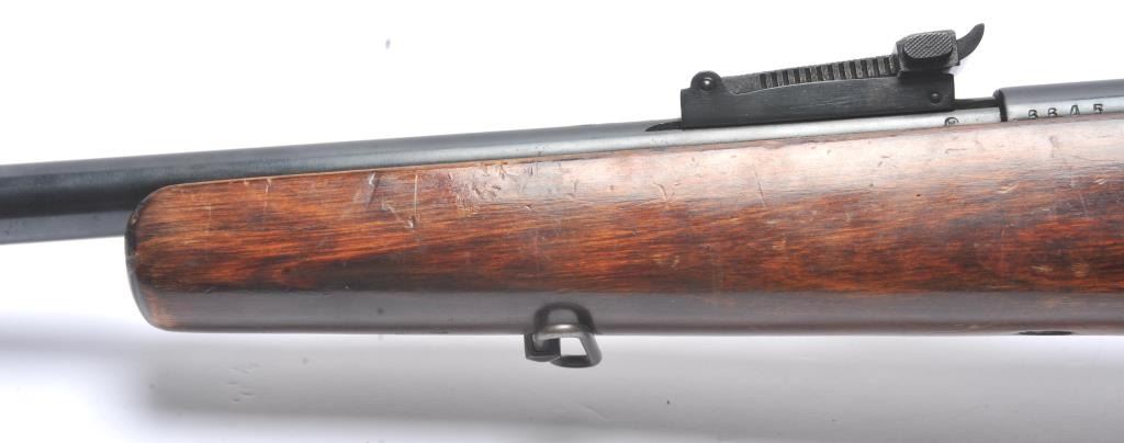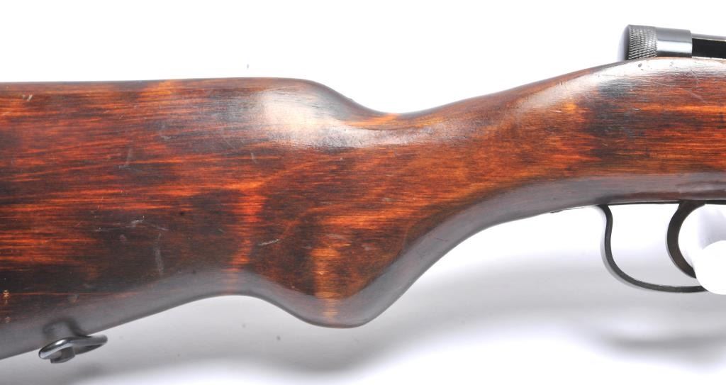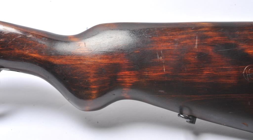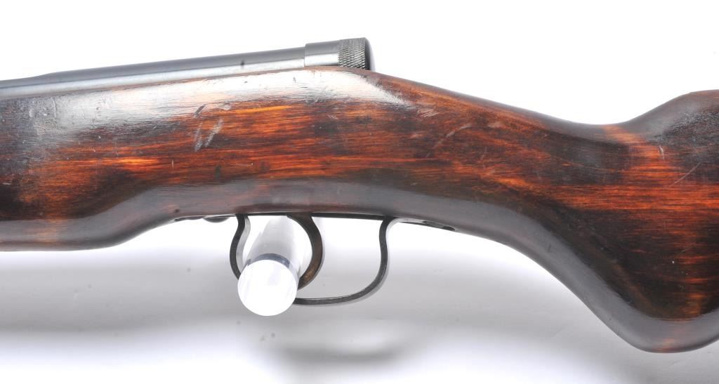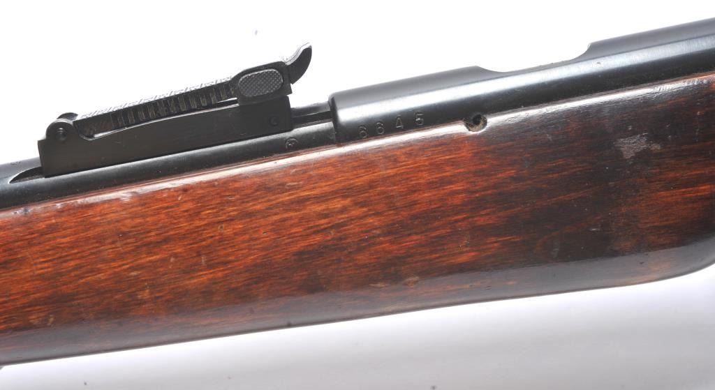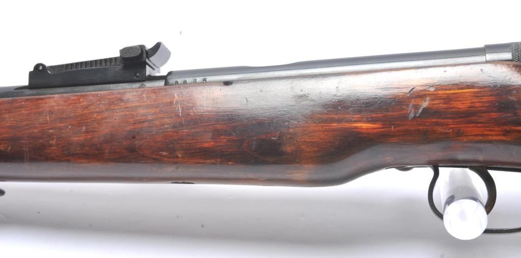 Scarce Russian 1950 Tula manufactured bolt action single shot target rifle, .22 caliber, Serial #6645. The rifle is in overall very good condition with a 24” heavy barrel with a hooded front and military tangent style rear sights. The barrel and action retain nearly all of their blued finish with only light surface freckling visible. The smooth wood laminate stock is in very good condition with small mars and scratches consistent withuse. The rifle has sling swivels and a smooth metal butt plate as well. The bore is very good, action crisp and markings sharp on this rifle. Est.: $200-$400. (C+R/PPT).