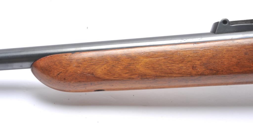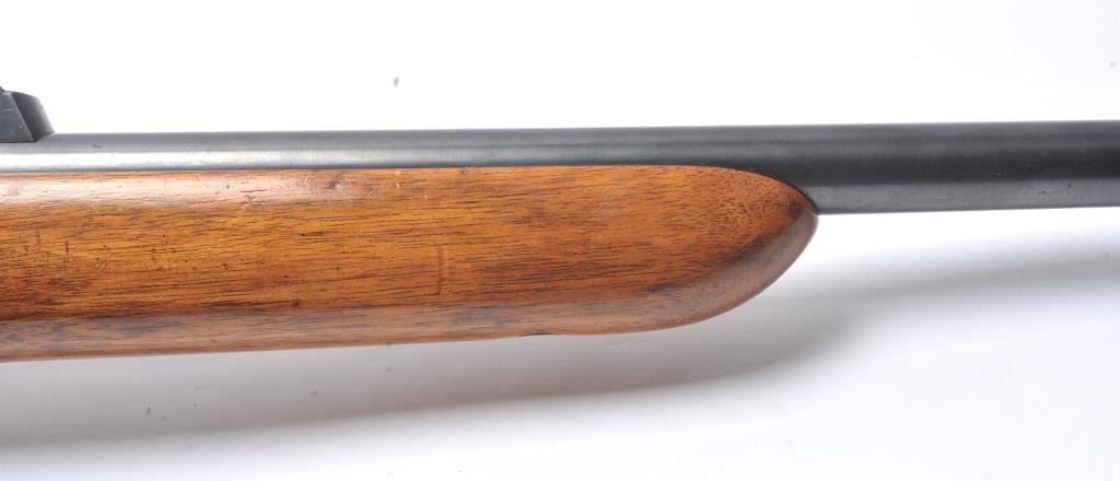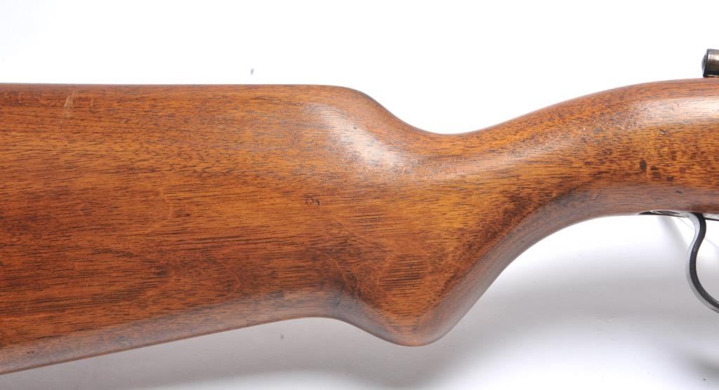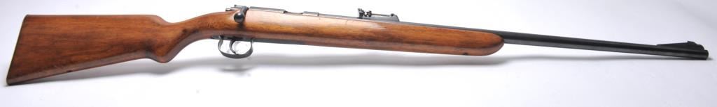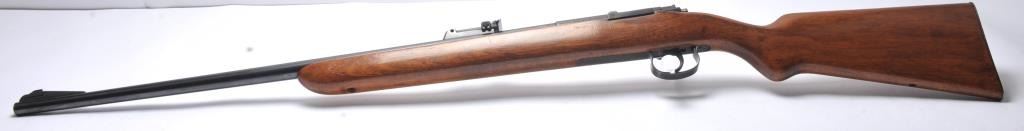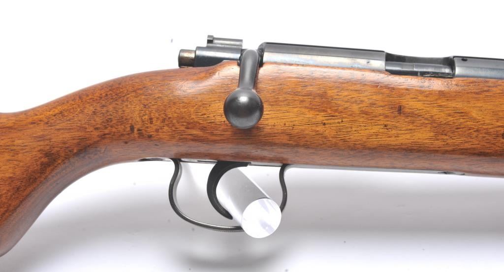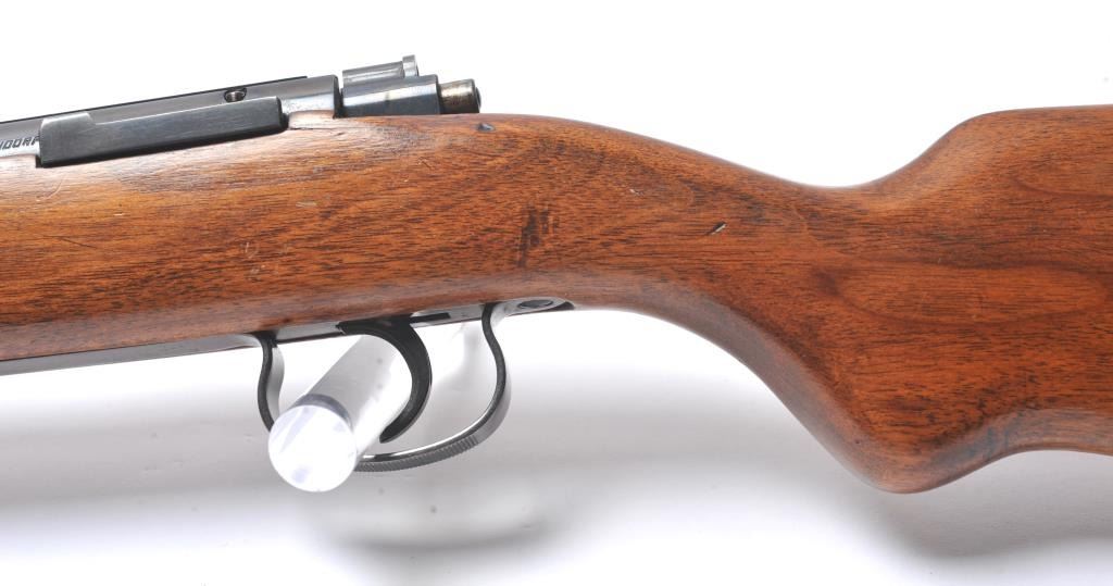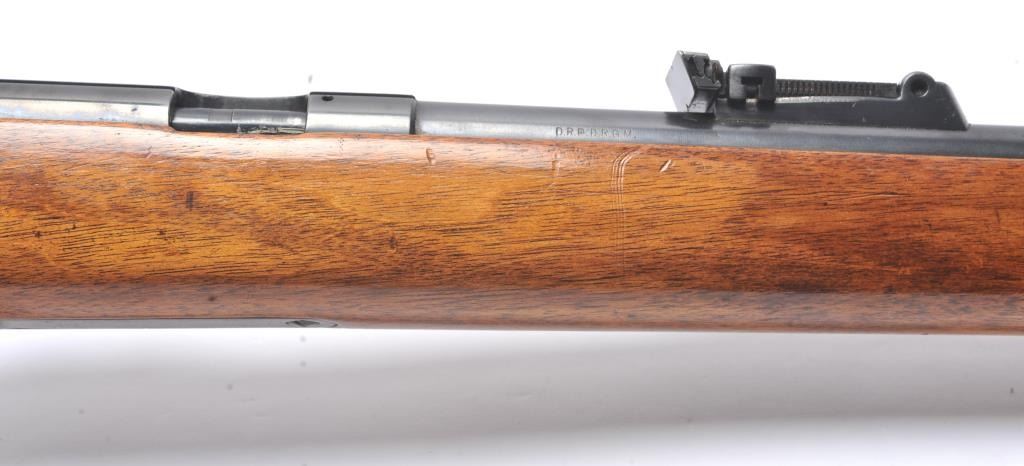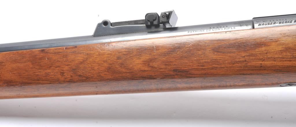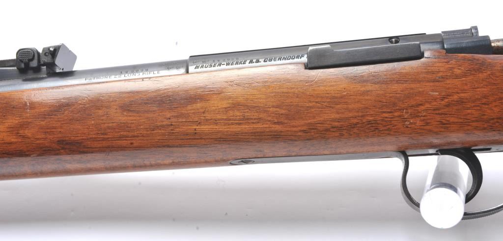 Pre-War Oberndorf Commercial Mauser Model ES 340B single shot bolt action training rifle, .22 Long Rifle caliber, Serial #149098 with B.U.G. proofs Pre-war manufacture circa 1937-1939, featuring a 27” heavy barrel withmilitary style adjustable tangent sight, 95%-98% original blue with near excellent metal surfaces and sharp markings, including numerous proofs and acceptance marks including an interesting, “459” on thebarrel. The right side of the barrel is marked, “D.R.P.D.R.G.M.”, the bore is very good and the action is crisp. The wood has been lightly refinished with Mauser banner outline barely visible on the right side ofthe butt stock. The trigger guard is checkered, the receiver is grooved and there is a Mauser Banner on both the front ring and butt plate. The flag safety has been removed and should be checked by a competentgunsmith. Est.: $400-$800. (C+R/PPT).