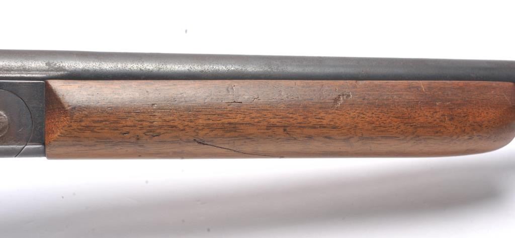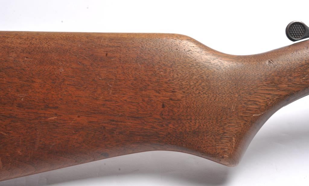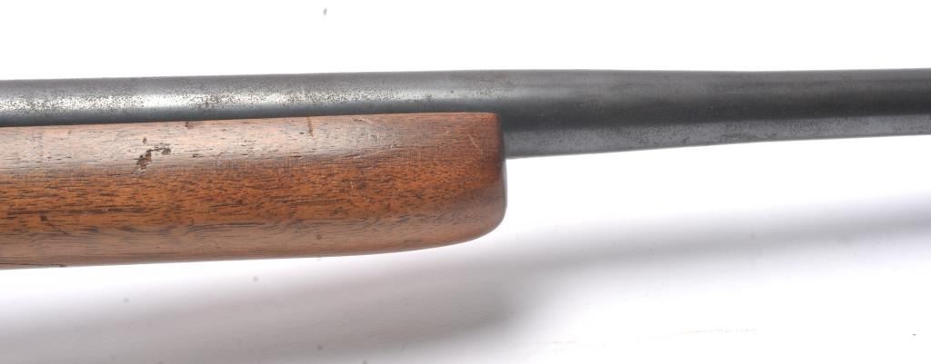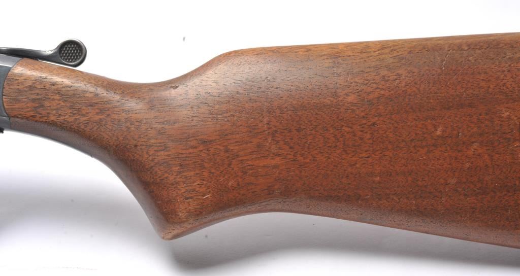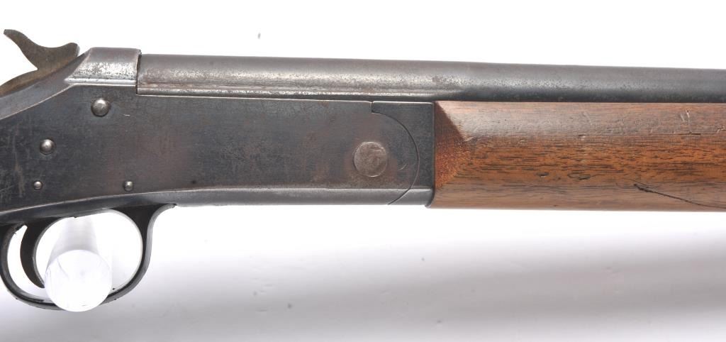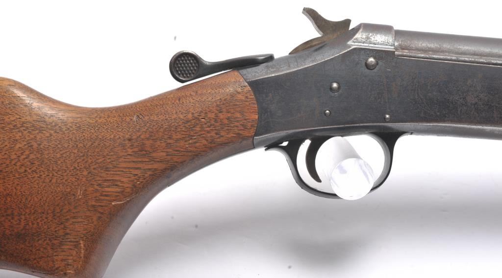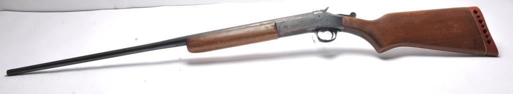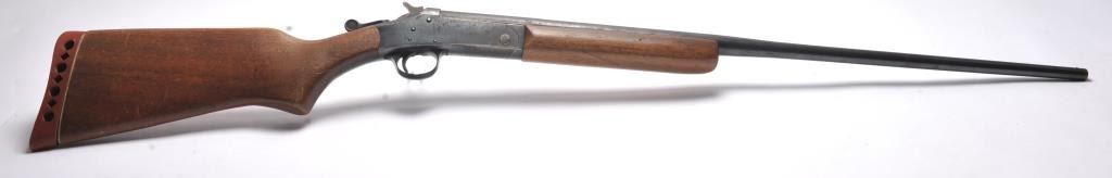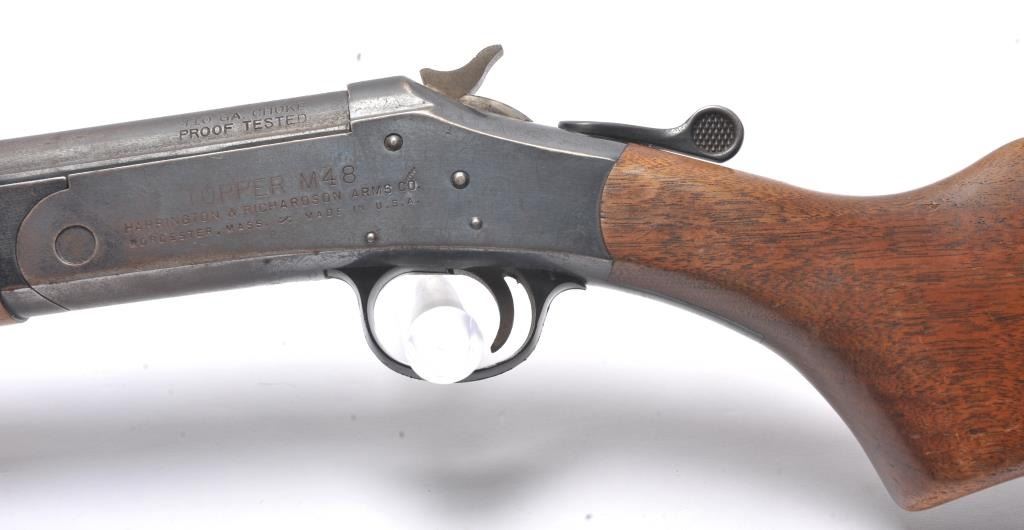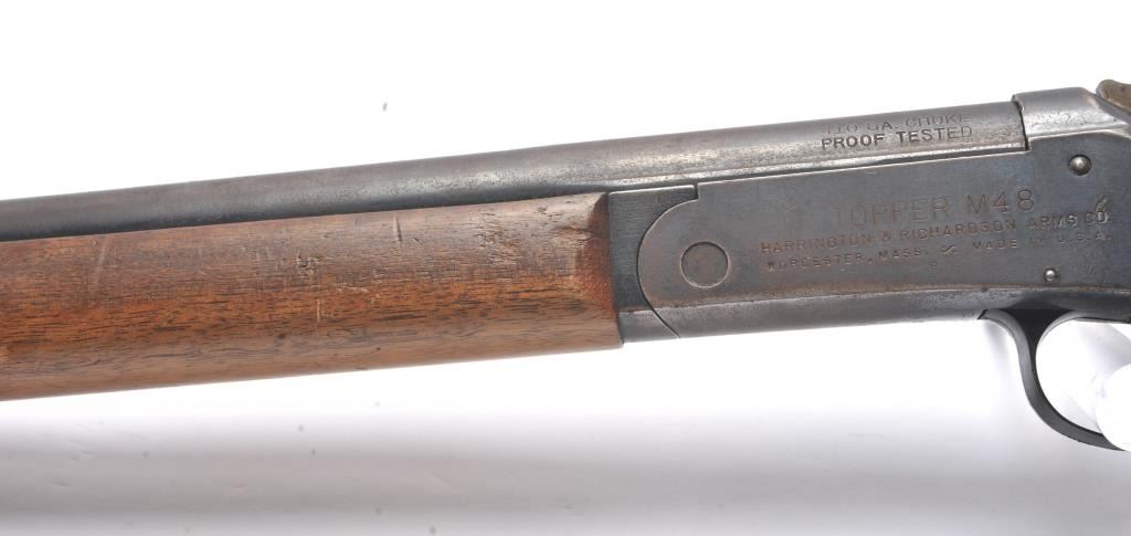 Harrington & Richardson Topper single shot shotgun, .410 gauge, Serial #NSNV. The shotgun is in good overall condition with a 28” barrel. The metal surfaces show considerable blue finish with moderate toheavy wear going to dark patina. The smooth wood stock is in good condition with a 14” LOP to a single trigger. The bore is fair and the action functions. Est.: $100-$200. (C+R/PPT).