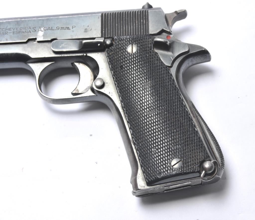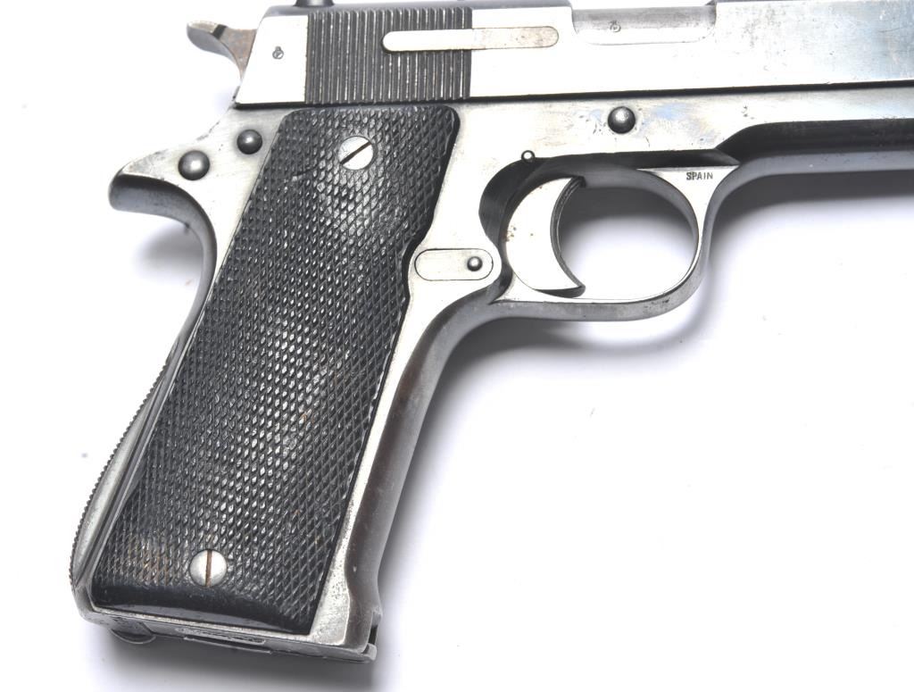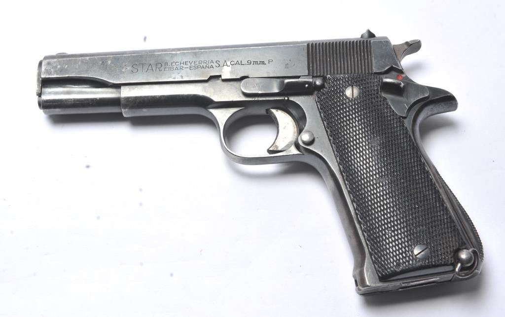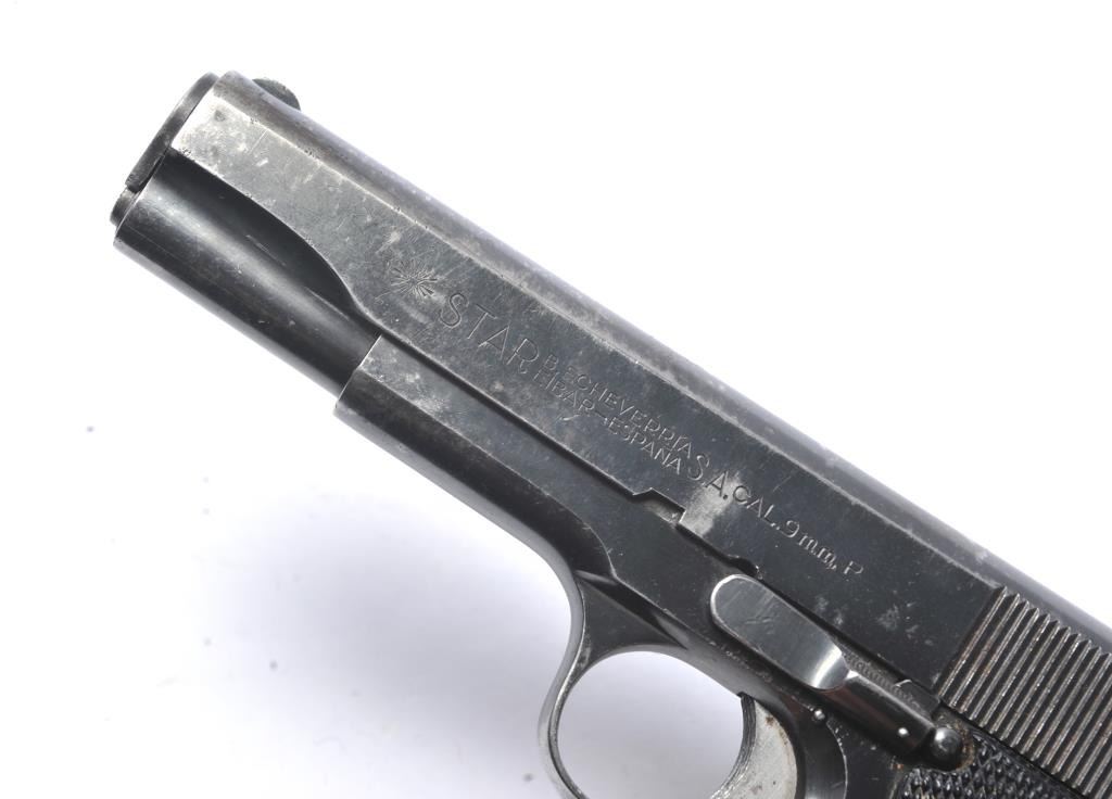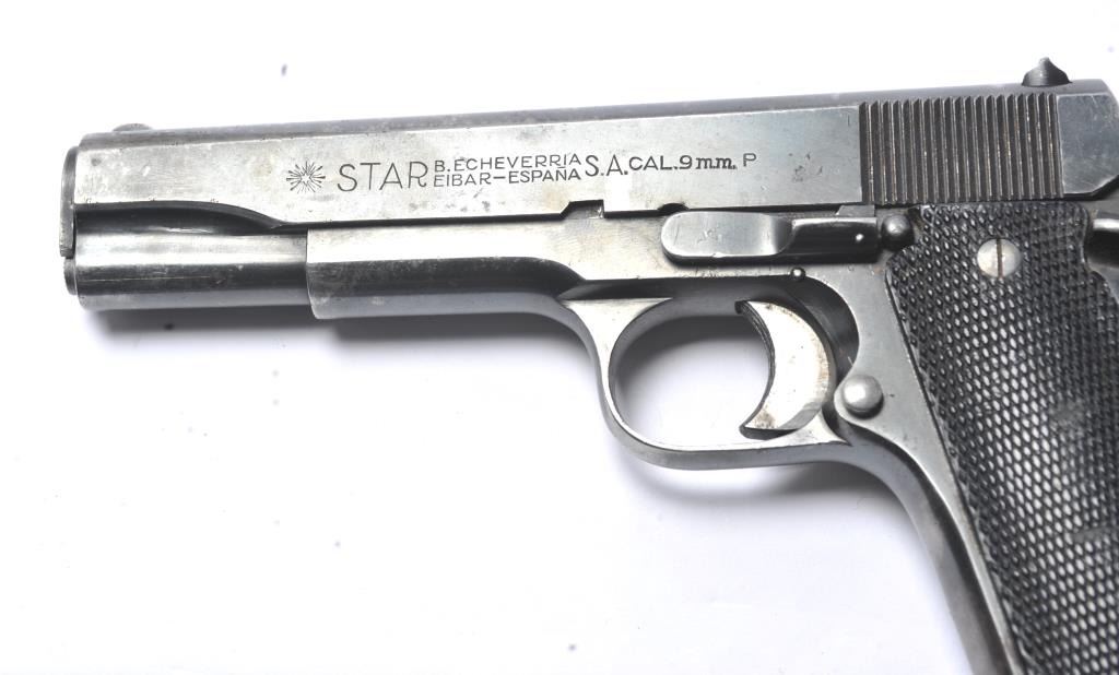 Rare Star Model BG SA semi-automatic pistol, 9mm caliber, Serial #BG864374. The pistol is in very good overall condition with a 4 ½” barrel. The pistol retains approximately 85-90% of the thinning blue finish withholster wear at the muzzle, high point edge wear and thinning finish on the slide. The checkered plastic grips are in good condition with wear consistent with carry and use. The lanyard ring is retained and the pistolincludes one correct Star marked magazine with moderate to heavy pitting. The bore is fair, the action functions and the markings are legible. According to the manufacturer, the Model BG is rare with only approximately2,000 manufactured during 1965-66. Est.: $300-$600. (C+R/PPT).