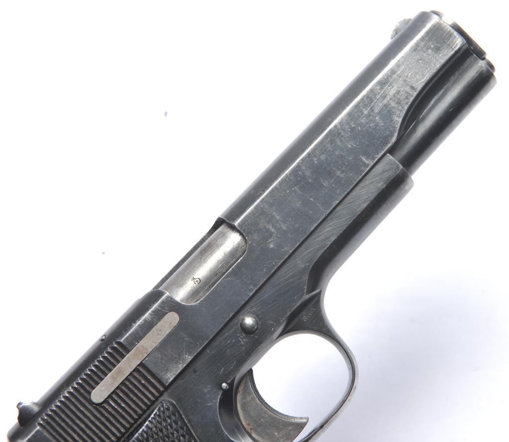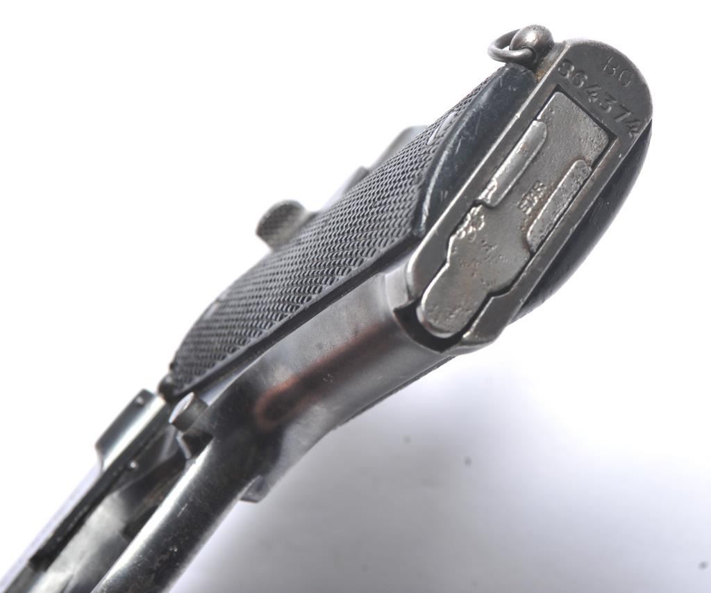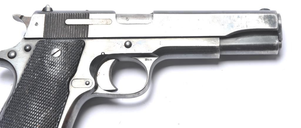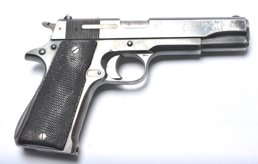 Rare Star Model BG SA semi-automatic pistol, 9mm caliber, Serial #BG864374. The pistol is in very good overall condition with a 4 ½” barrel. The pistol retains approximately 85-90% of the thinning blue finish withholster wear at the muzzle, high point edge wear and thinning finish on the slide. The checkered plastic grips are in good condition with wear consistent with carry and use. The lanyard ring is retained and the pistolincludes one correct Star marked magazine with moderate to heavy pitting. The bore is fair, the action functions and the markings are legible. According to the manufacturer, the Model BG is rare with only approximately2,000 manufactured during 1965-66. Est.: $300-$600. (C+R/PPT).