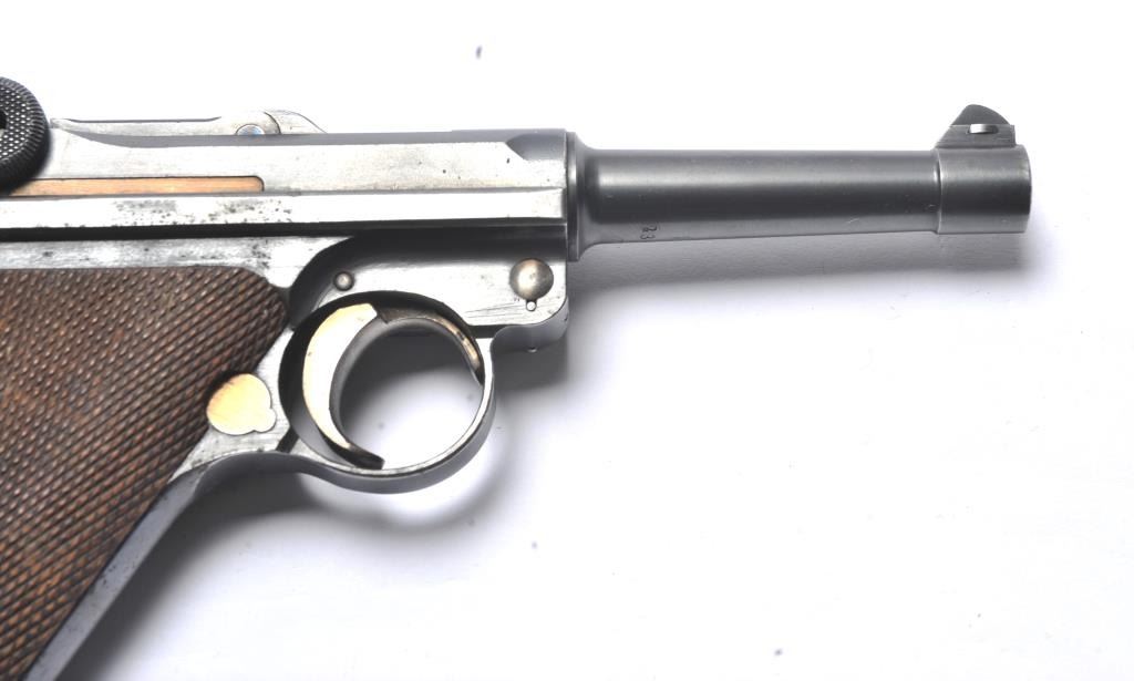DWM Commercial Luger semi-automatic pistol, .30 Luger caliber, Serial #2389A. The pistol is in fine overall condition with a 4” barrel. The pistol retains the majority of the toning blue finish with numerous proofsand acceptance marks. The pistol has all matching visible serial numbers and “GERMANY” on the frame. There is significant straw finish evident on the small parts. The checkered wood grips are in good conditionwith some flattening to the checkering. The magazine is correct with a wood base. The bore is good, the action is crisp and the markings are sharp on this desirable Luger. Est.: $600-$1,200. (C+R/PPT).