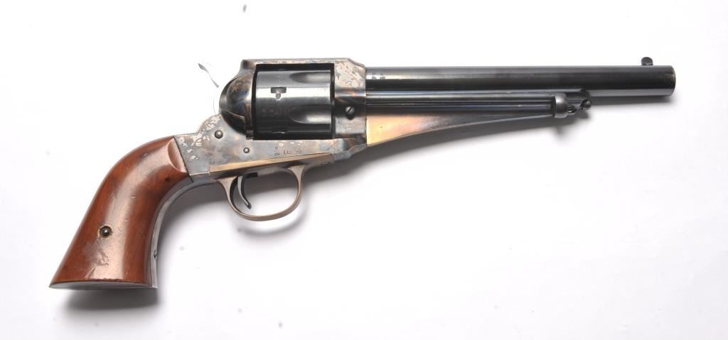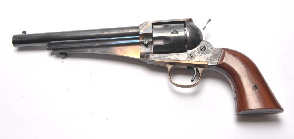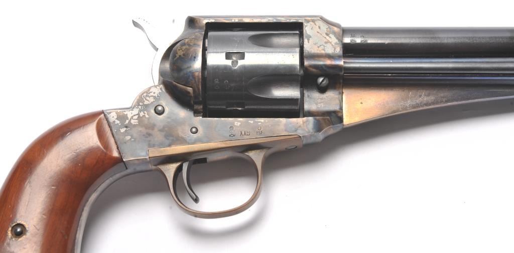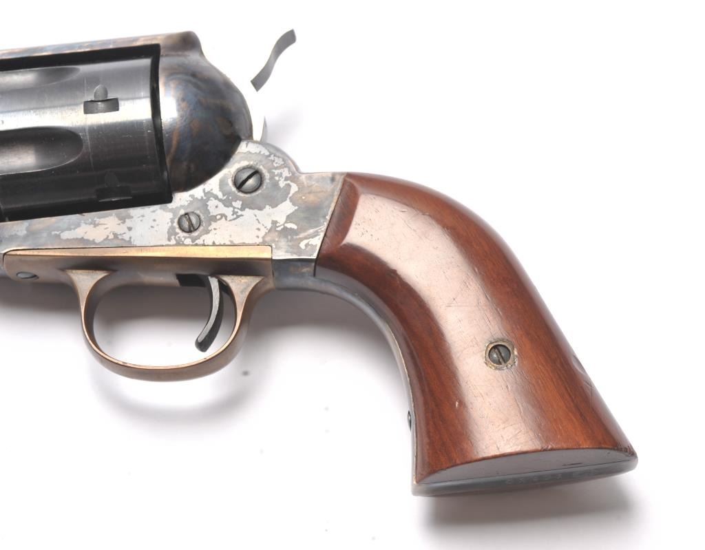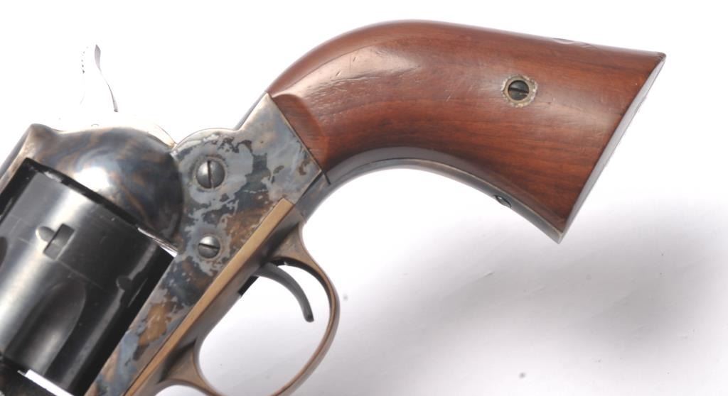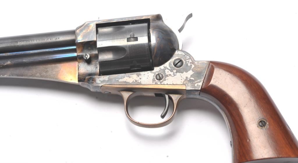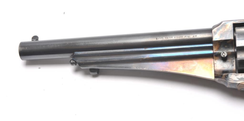 Uberti Model 1875 Remington SA Army revolver, .45 Colt caliber, Serial #01451. The pistol retains nearly all of the blue and case hardened finish with nice smooth wood grips showing little use. The bore is good, theaction is tight and the markings are crisp on this nice Italian reproduction. Est.: $300-$600. (Modern/PPT).