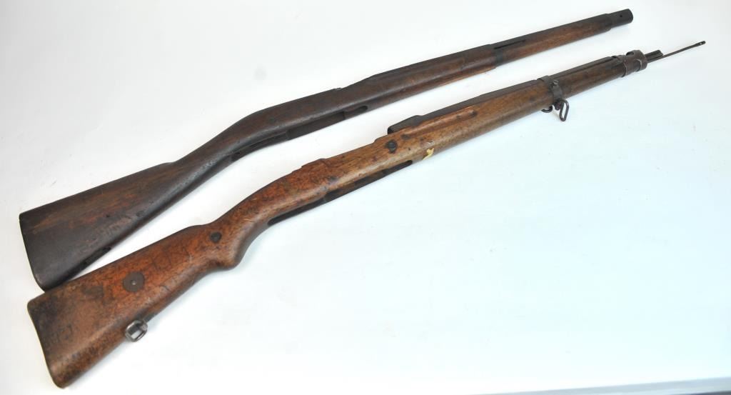Lot of three military rifle stocks. The lot includes a U.S. M1 carbine stock which has been lightly re-finished with a faint cartouche on the left side of the buttstock. The 2nd stock is a U.S. Model 1903 in faircondition with a lateral crack the length of the butt stock. The 3rd is a Czech BRNO VZ-24 with hand guard and ram rod in good condition. Est.: $150-$300.