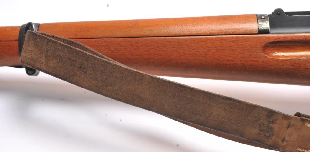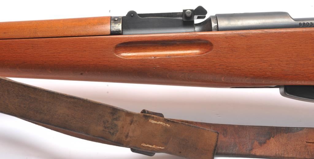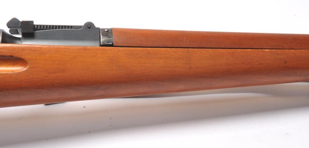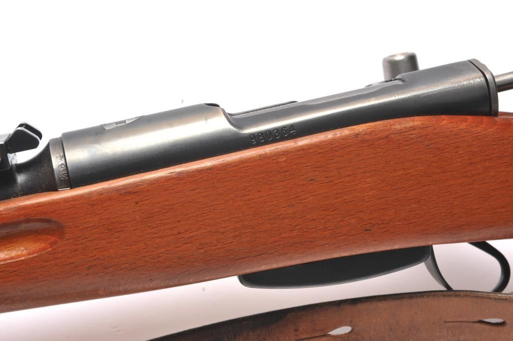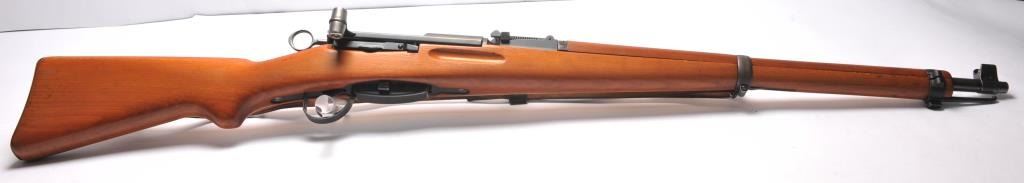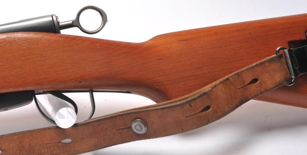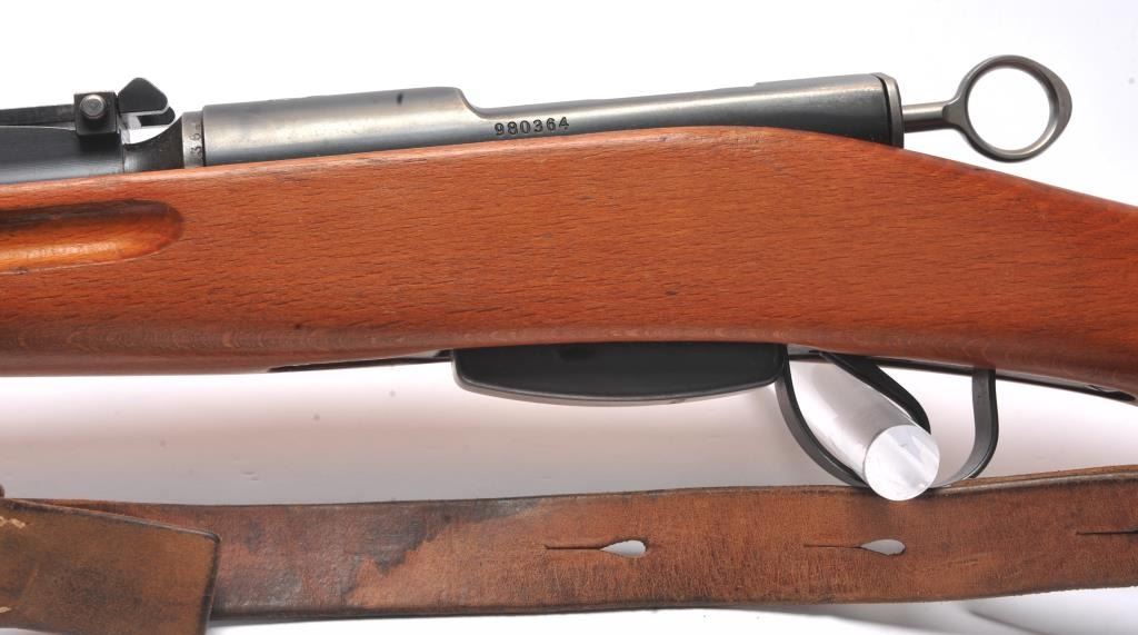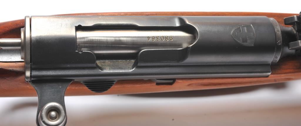 Schmidt-Rubin straight pull rifle, 7.5 x 55 caliber, Serial #980364. The rifle is in fine overall condition with a 26” barrel with a protected blade front and military tangent style rear sights. The rifle retains nearly all of the military finish with wear at the muzzle and storage marks. There are numerous proof and acceptance marks with all matching visible serial numbers. There is a crisp Swiss cross on the front ring. The smoothwood stock is in very good condition with integral sling mounts, swivels and a period leather sling. The bore is good, the action is crisp and the markings are sharp on this most acceptable Schmidt-Rubin. Est.:$300-$600. (C+R/PPT).