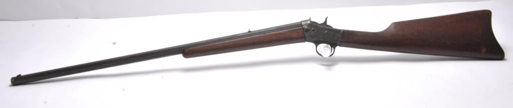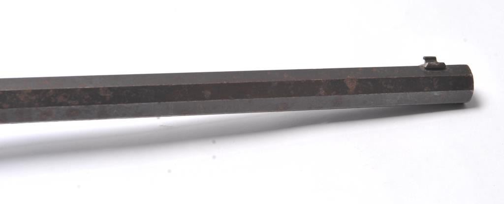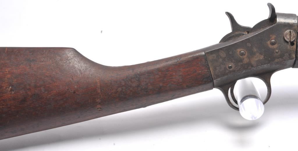 Remington No. 4 rolling block single shot rifle, .32 rimfire caliber, Serial #NSNV. The rifle is in fair overall condition with a 24” octagon barrel showing significant light to moderate surface rust on a barrel goingto plum patina. There is a crude repair to the barreled action that should be examined by a competent gunsmith before firing. The receiver is dark toned case hardening with areas of light surface rust. The smooth wood stock is in good condition but is loose at the wrist. The bore is dark but may clean to fair. Est.: $200-400 (Antique)