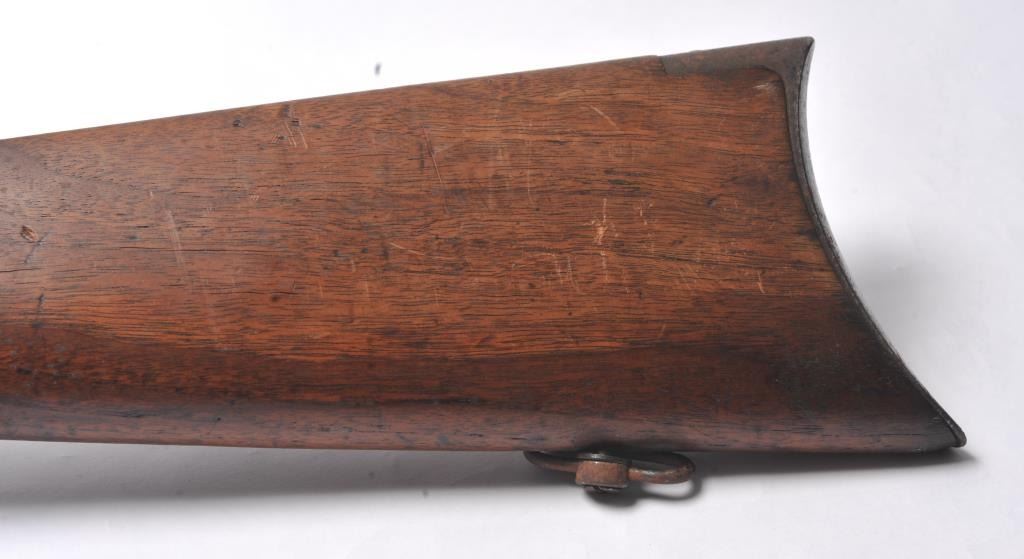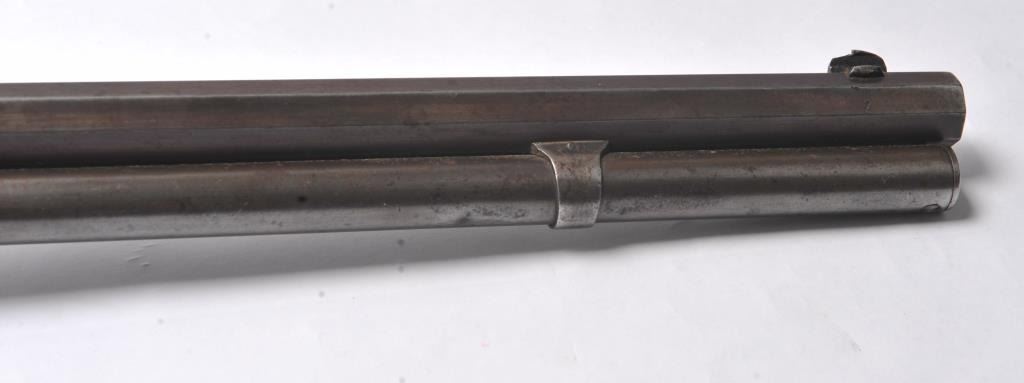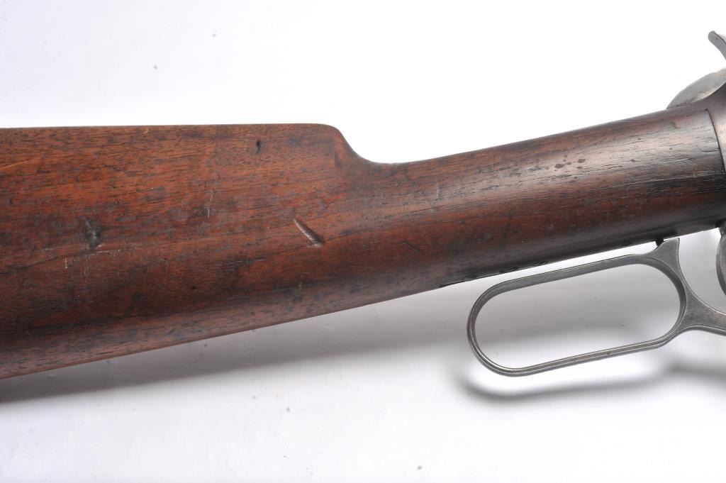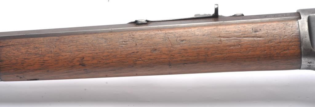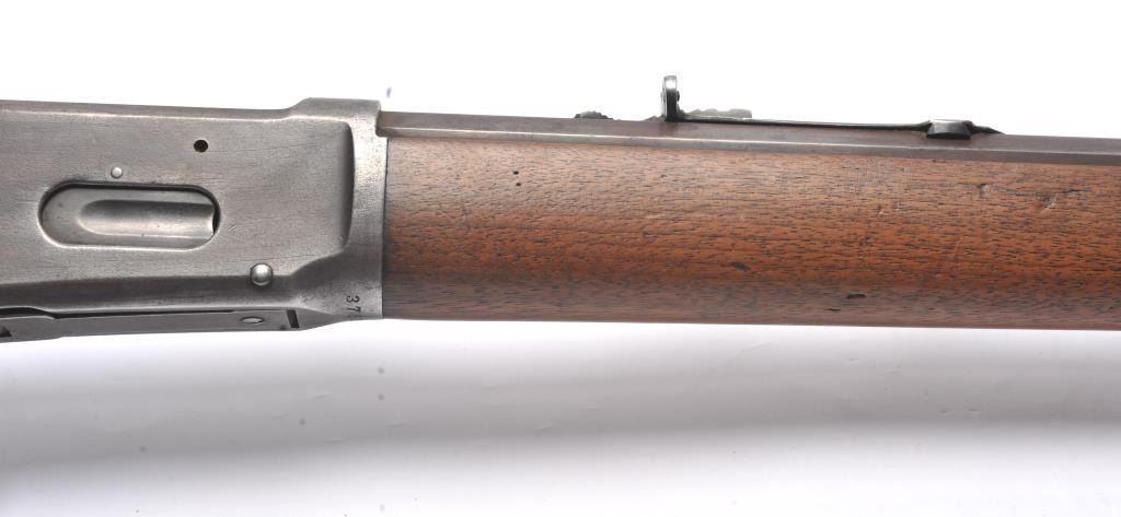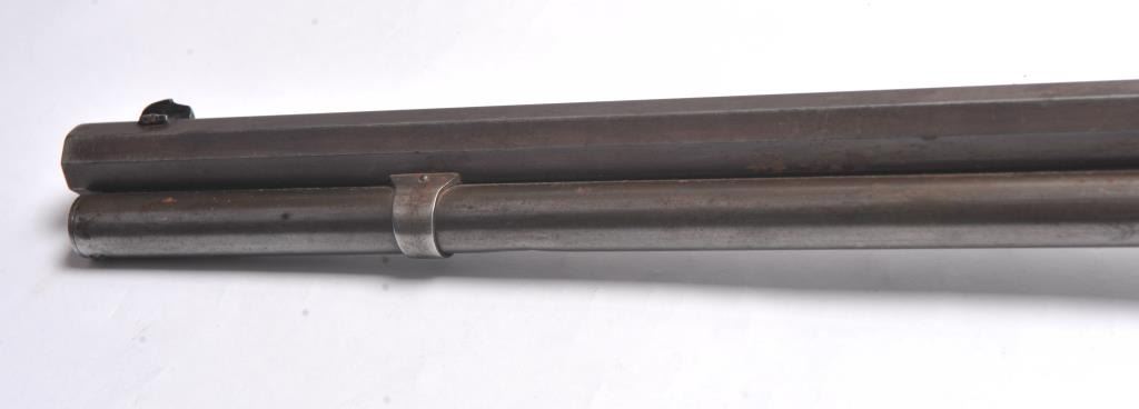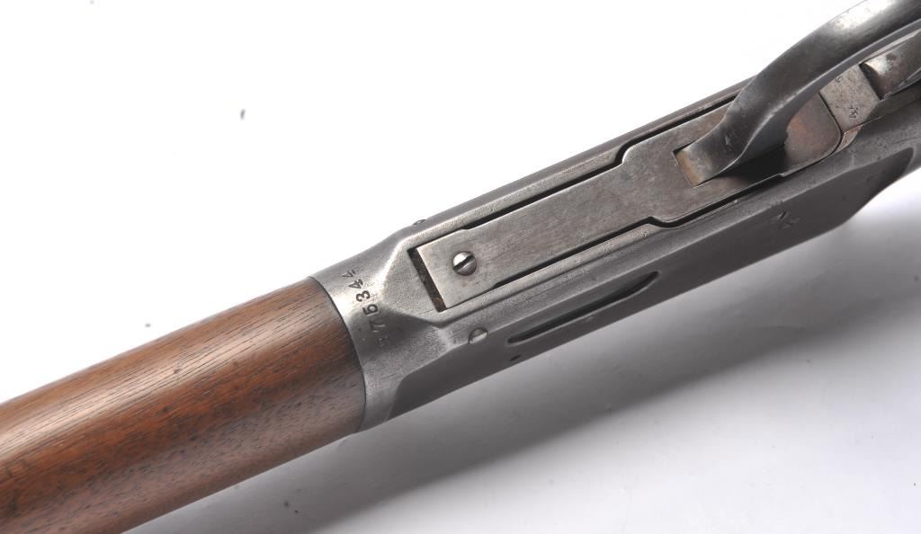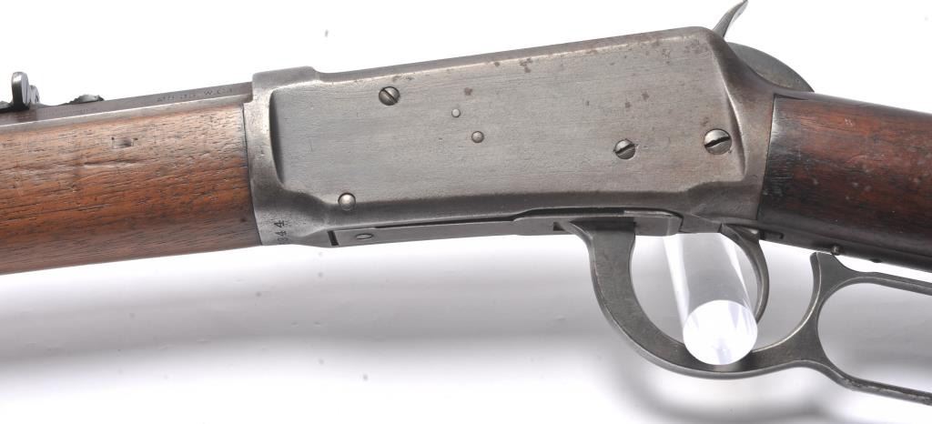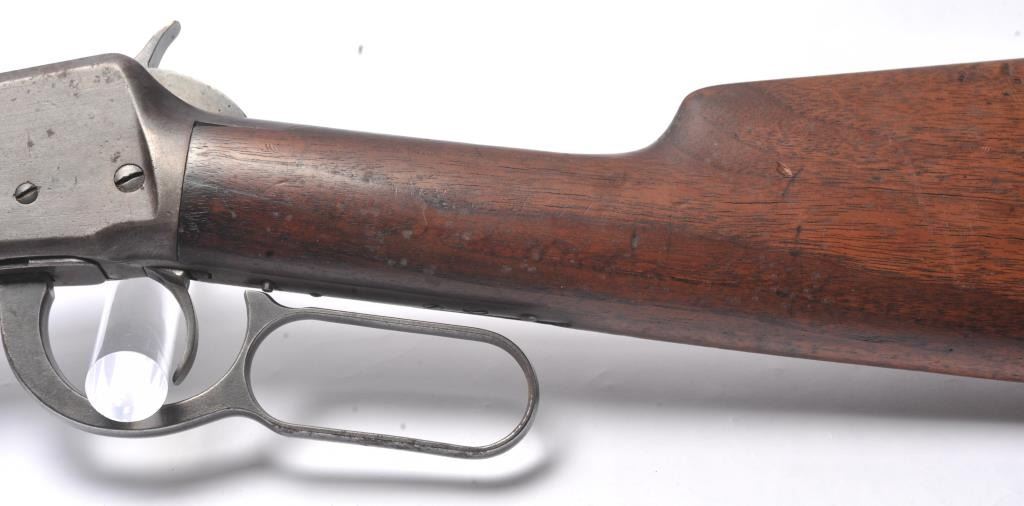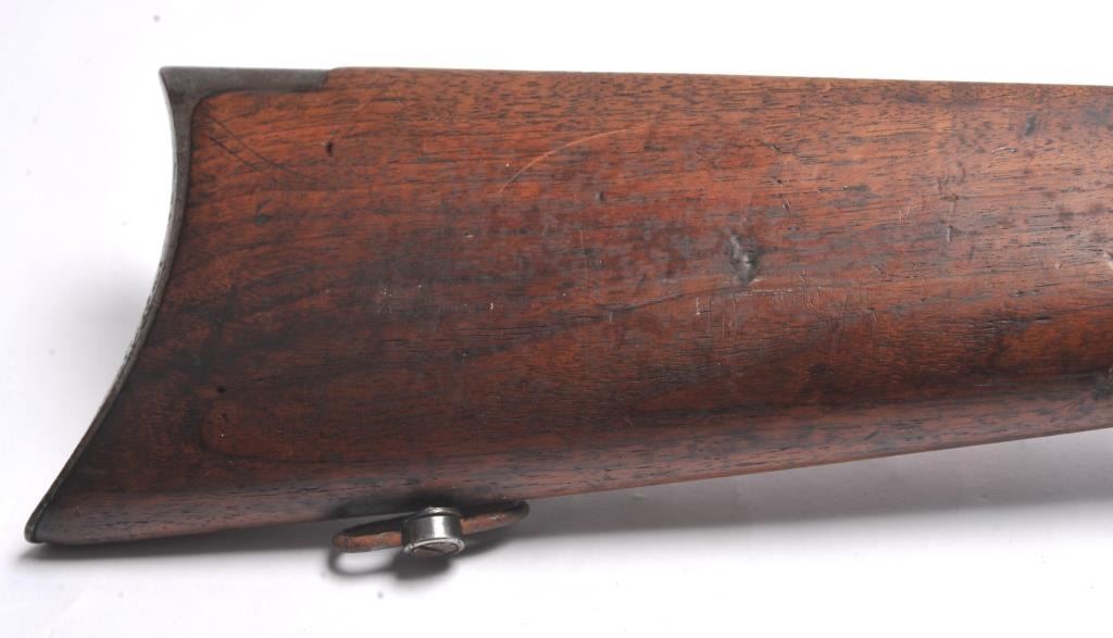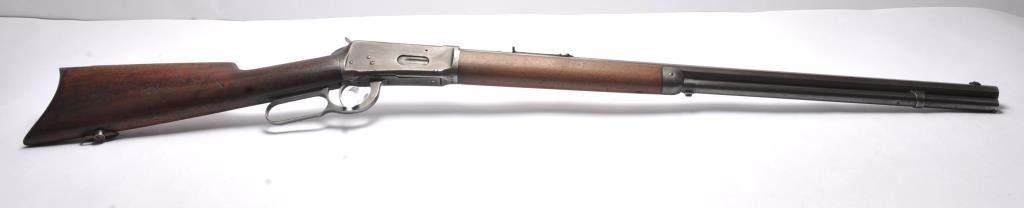 Winchester Model 1894 lever action rifle, .25-35 caliber, Serial #375344. The rifle is in good overall condition with a 26” octagon barrel with a full-length magazine. The front sight is a period Sheard knife bladeand the rear is a newer buckhorn style. The magazine is also a period replacement with a barrel band for swivel added. The metal surfaces have gone to grey patina with some muted blue in the protected areas of thereceiver and light surface rust at the muzzle. The markings are sharp and there is toned case hardening still evident on the hammer and lever. The smooth wood stocks are in good condition showing heavy use withdents and mars. The butt stock ends with a smooth steel crescent butt plate showing light surface rust. A sling swivel has been added at the butt. The bore is dark with moderate pitting and the action functions onthis Winchester circa 1906. This rifle would improve significantly with a little TLC. Est.: $600-$1,200. (C+R).
