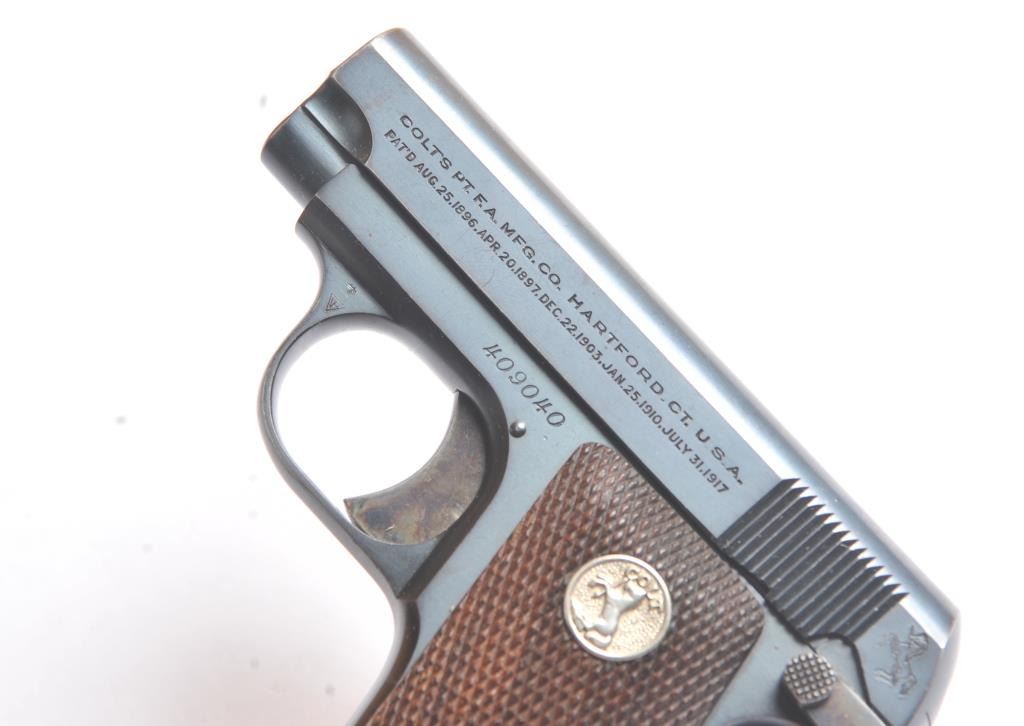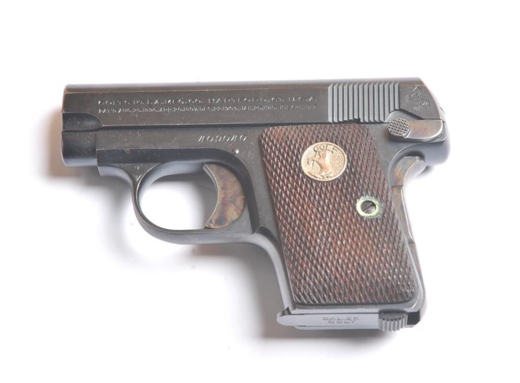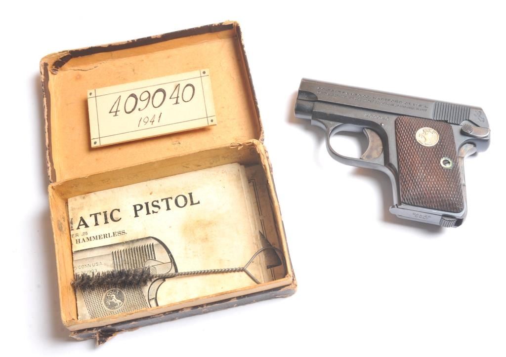 Colt 1908 Pocket Hammerless semi-automatic pistol, .25 ACP caliber, Serial #409040. The pistol is in fine overall condition with a 2” barrel. The metal surfaces retain approximately 90-95% of the toning bluefinish with high point edge wear at holster wear at the muzzle. The trigger, manual safety and grip safety show muted original case hardening. The markings are sharp with a crisp Rampant Colt at the left rear of theslide. The checkered wood Colt medallion grips are in very good condition. The pistol comes with the original factory cardboard box with the original owner’s manual and bore brush. The bore is good and the action iscrisp on this desirable Model 1908 circa 1941. Est.: $1,000-$2,000. (C+R/PPT).