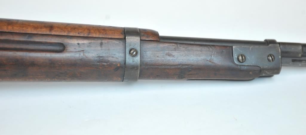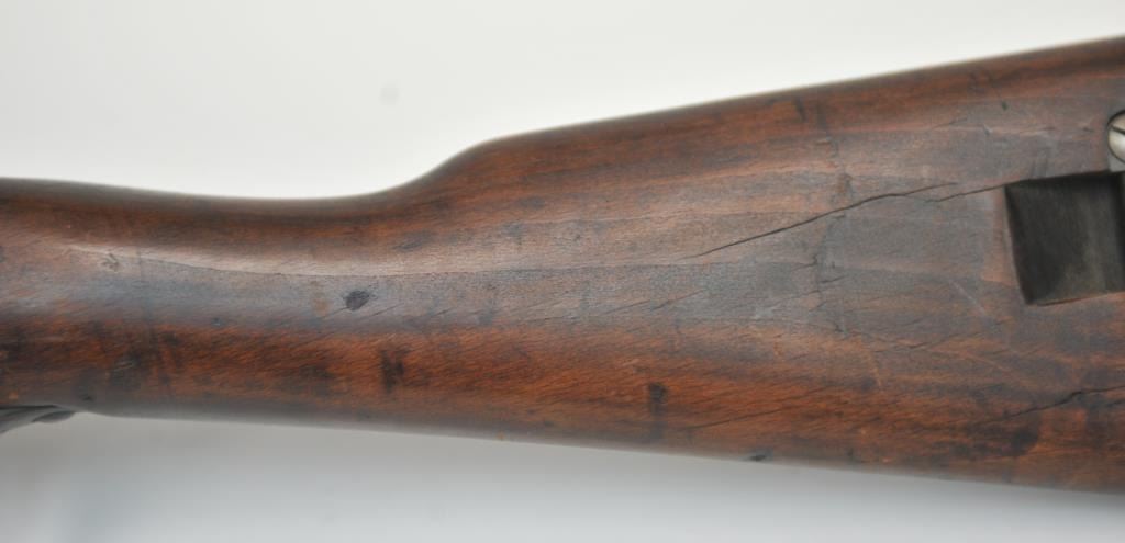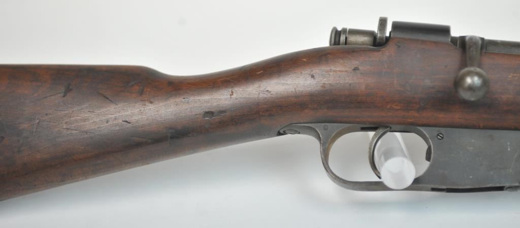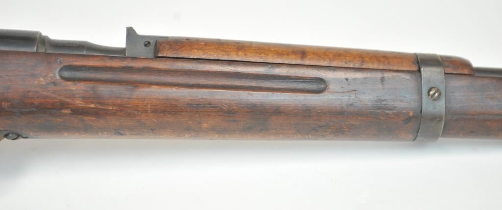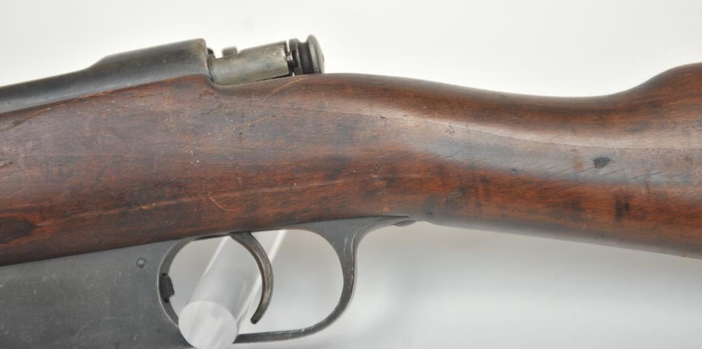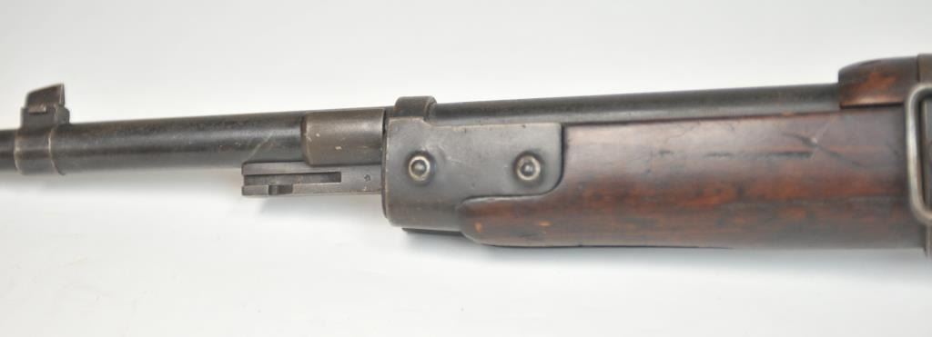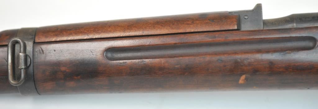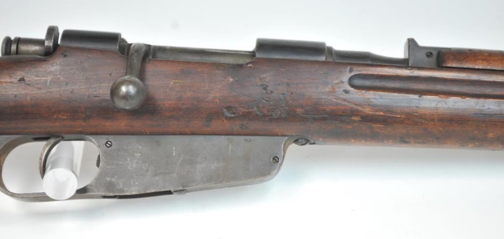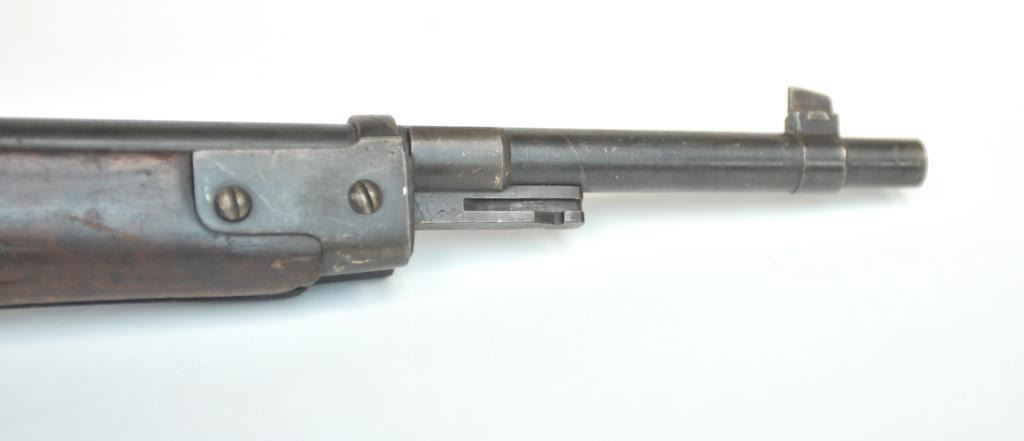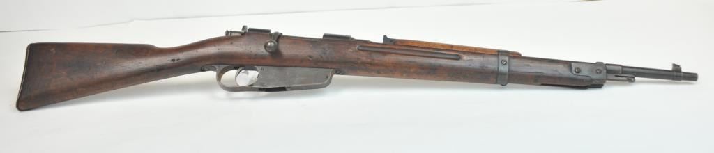 Italian Carcano M38 bolt action carbine, 7.35 caliber, Serial #R962. The carbine is in fair overall condition with a 21” barrel with a blade front and fixed rear sights. The metal surfaces show traces of military finish drifting to patina with light surface rust on the receiver. The rifle is dated 1939 with “R.E. TERNI” and a crown stamped in front of the breech. The smooth wood stock is in good condition showing moderate toheavy use with dents, mars and a non-matching serial number on the butt. The bore is fair and the action functions. Est.: $250-$500. (C+R/PPT).