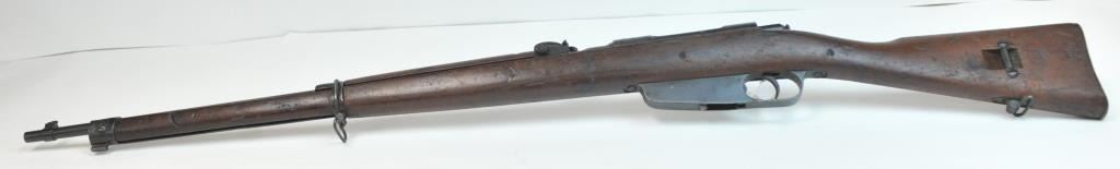 Italian Carcano M91/41 bolt action rifle, 6.5 x 52 caliber, Serial #AP1968. The rifle is in fair overall condition with a 27” import marked barrel with a blade front and a military tangent style rear sights. Themetal surfaces show traces of military finish drifting to patina with pitting along the barrel and light surface rust on the receiver. The rifle is marked with a crown, “FAT 43” in front of the breech. The smoothwood stock is in good condition showing moderate to heavy use with dents, mars and a non-matching serial number on the butt. The bore is fair and the action functions. Est.: $250-$500. (C+R/PPT).
