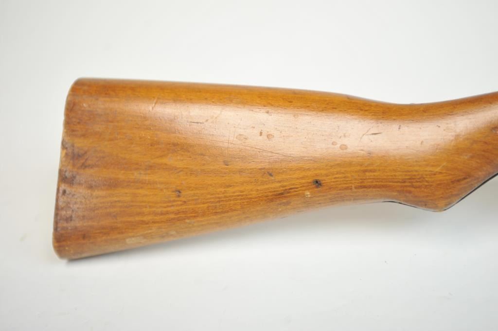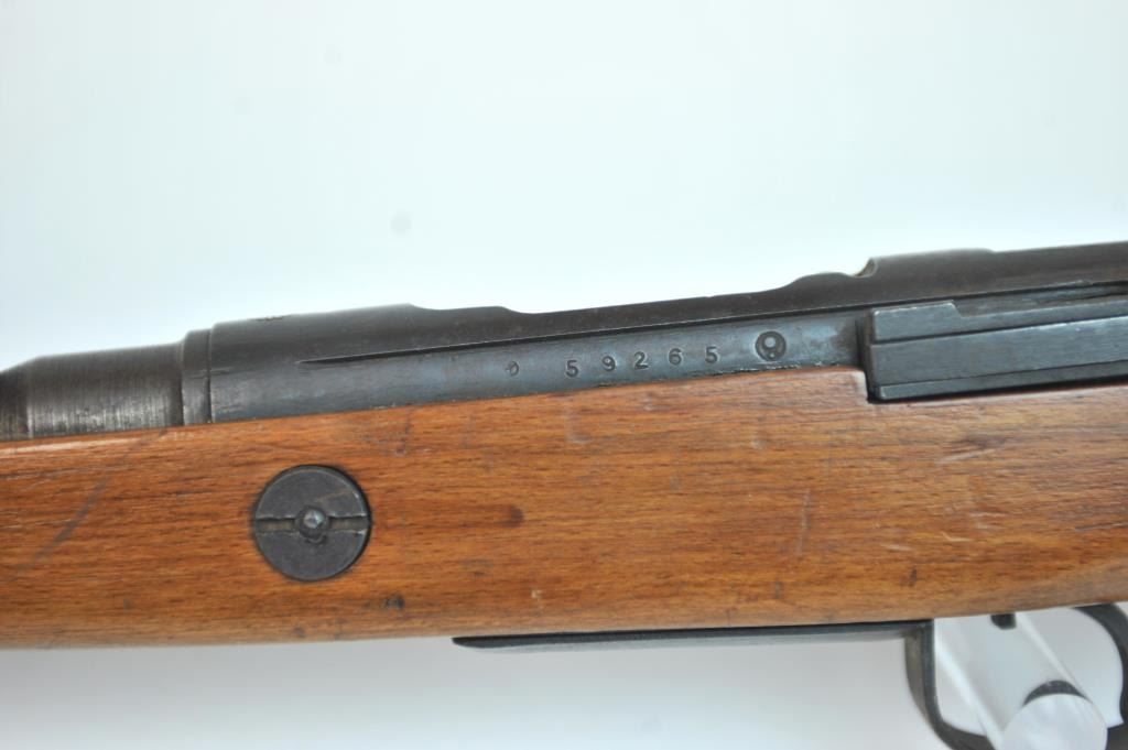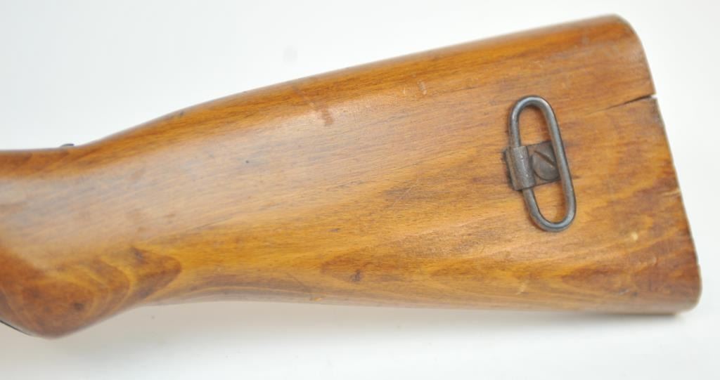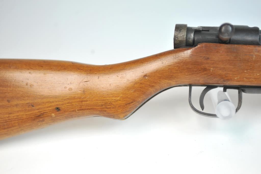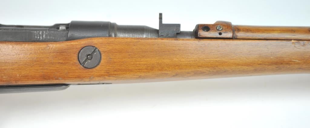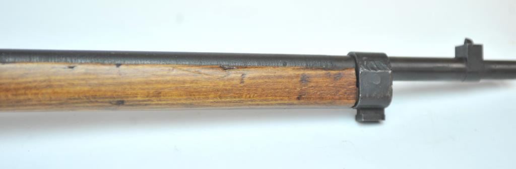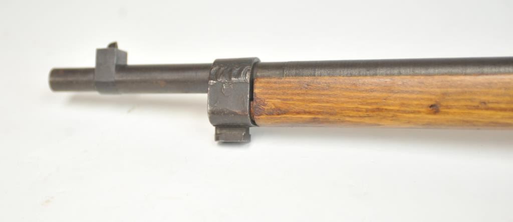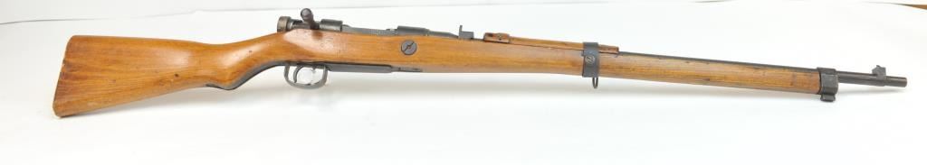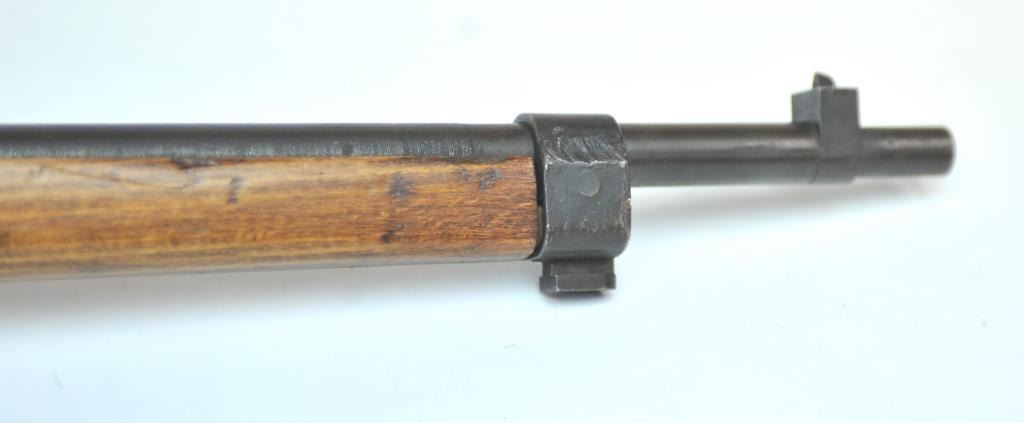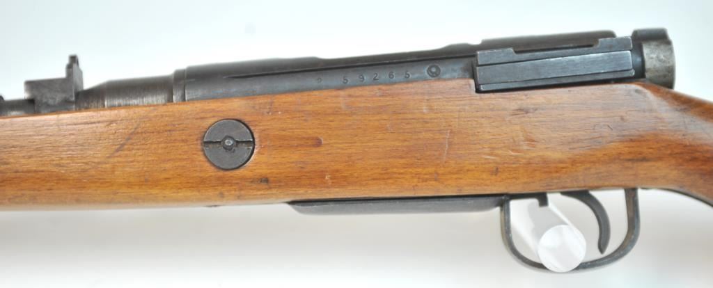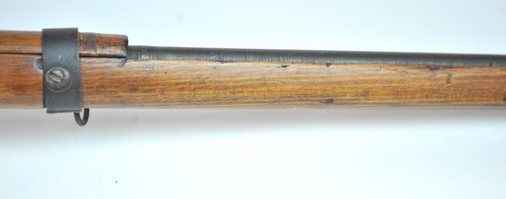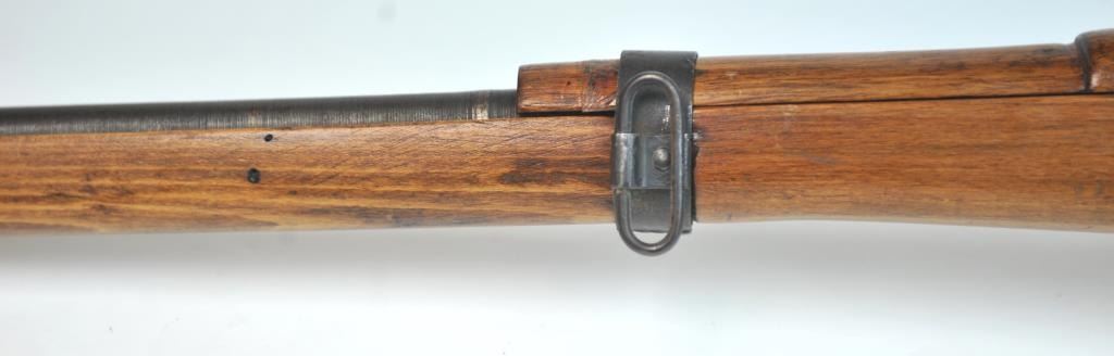 Japanese Arisaka Type 99 bolt action rifle, 7.7 Japanese caliber, Serial #59265. The Nagoya Arsenal rifle is in good overall condition with a 26” barrel with a protected blade front and a fixed rear sights. Therifle retains a significant amount of military finish going to patina with crisp markings and a nice Mum on the front ring. The sling swivels and bayonet lug are retained. The smooth wood stock is in verygood condition with mars and dents, the butt plate has been removed. The bore is fair with areas of light to moderate pitting evident and the action functions on this late production Arisaka with Nagoya Arsenalmarkings. Est.: $250-$500. (C+R/PPT).