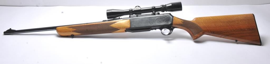 Browning BAR semi-automatic rifle, .270 Winchester caliber, Serial #23779M8. The rifle is in fine overall condition with a 22” barrel. The rifle retains approximately 90-95% of the blue finish with light handling marks consistent with field use. The receiver is lightly engraved. The checkered Walnut stock is in very good condition showing beautiful figure, nice fit and finish. The butt ends with a plasticBrowning marked butt plate. The rifle is topped with a Burris one-piece mount and rings with a Burris 3 x 9 variable power rifle scope. The bore is good but the action needs tuning, the bolt is sticky and shouldbe inspected by a competent gunsmith. Est.: $750-$1,500. (Modern/PPT).