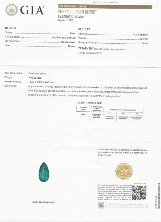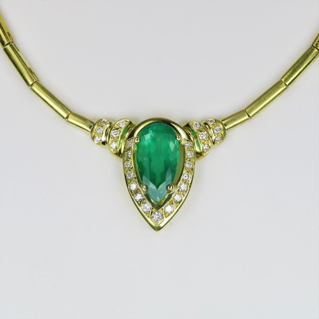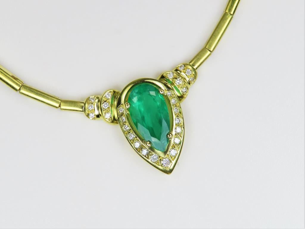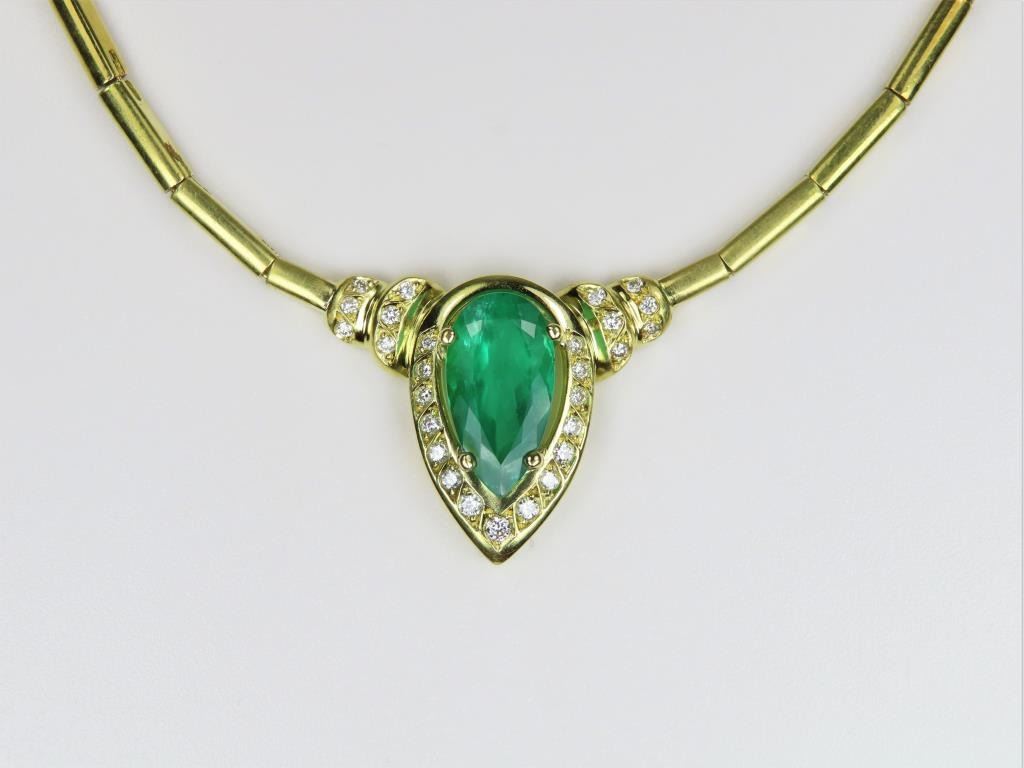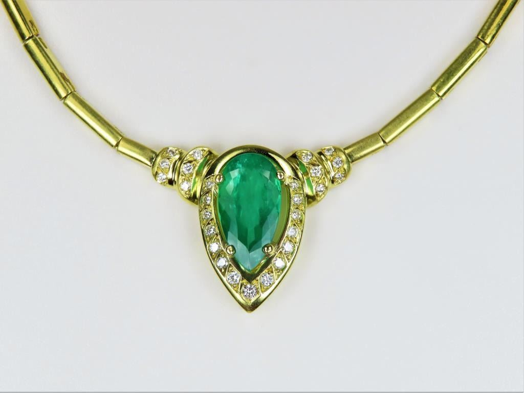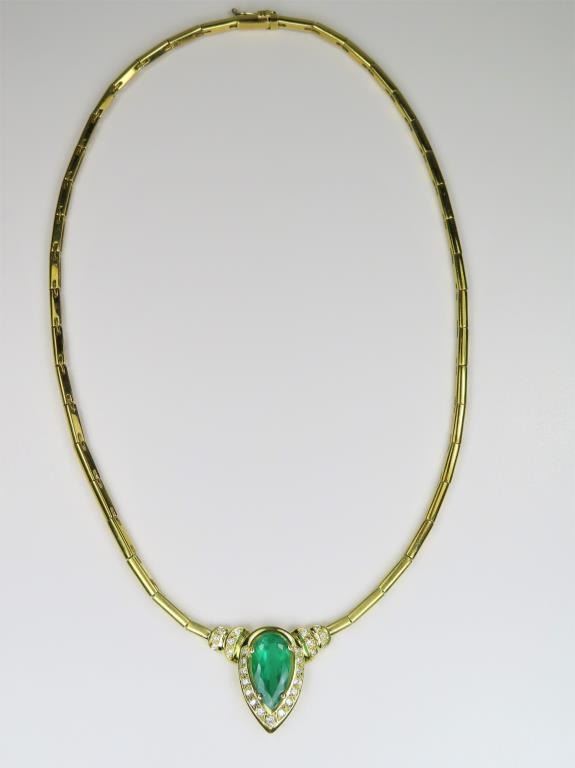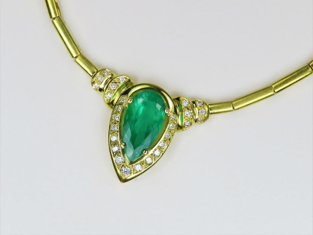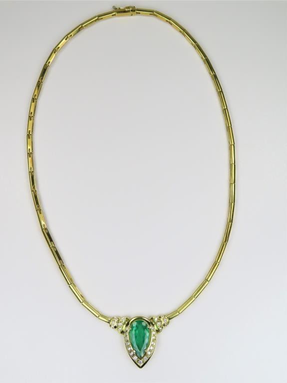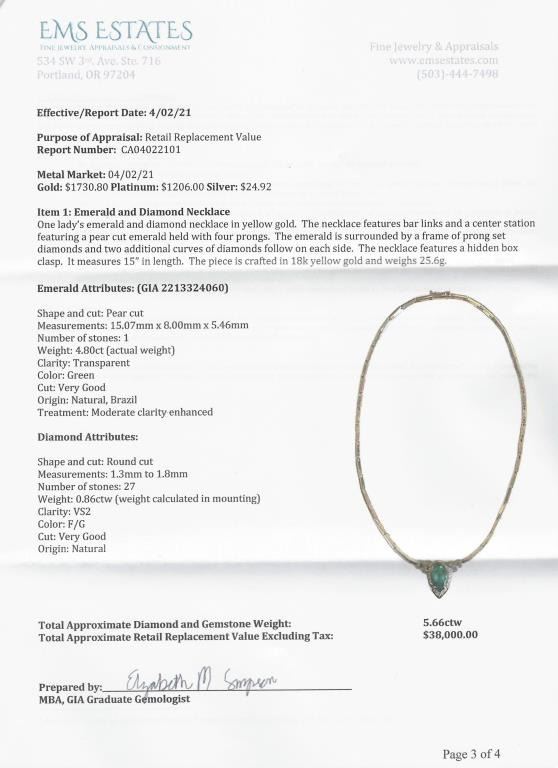 Magnificent Fine Emerald and Diamond Necklace featuring a G.I.A. Certified Natural pear shape Emerald weighing 3.82 carats and accented with 27 round cut Diamonds weighing approx. 0.86 carats with F-G colors and VSclarity set in a custom high quality 18 karat yellow gold design. Necklace has a bar link style chain, entire piece weighs 25.6 grams. Comes with Full Appraisal – Valued at $38,000.00 Estimates $15,000-$20,000