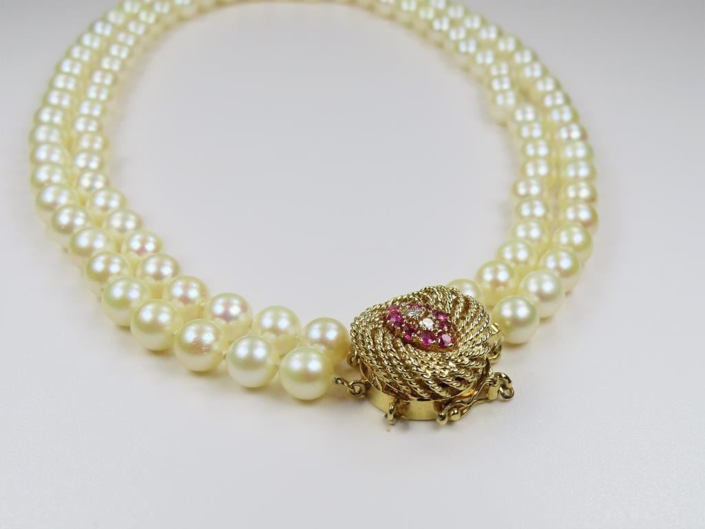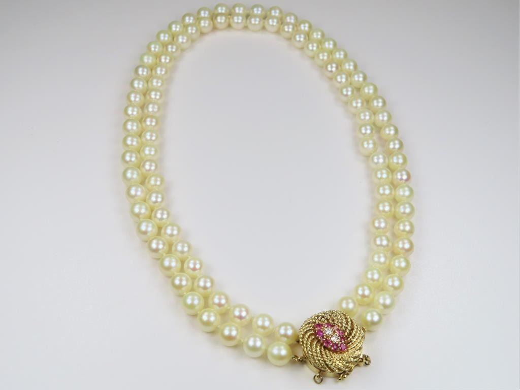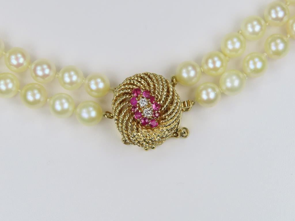 Sophisticated Double Strand of Pearls with Ruby and Diamond Clasp featuring Pearls measuring just under 7.00 MM on average with a length of 18” with luxury clasp of 14 karat yellow gold accented with 10 round cutRubies and 2 round Diamonds Estimates $1,500-$2,000
