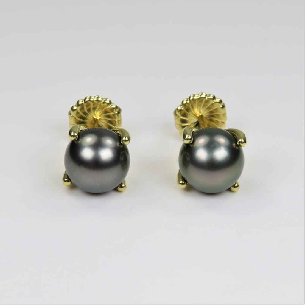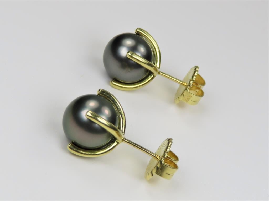 Beautiful Black Pearl Earrings measuring approx. 11.00 MM in diameters with rich luster with silver color overtones set in 18 karat yellow gold pierced earrings. Retail $3,000-$4,000 Estimates $1,500-$2,000