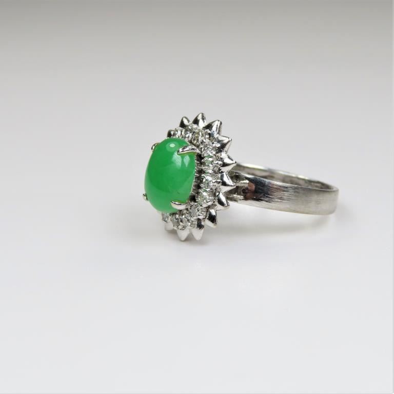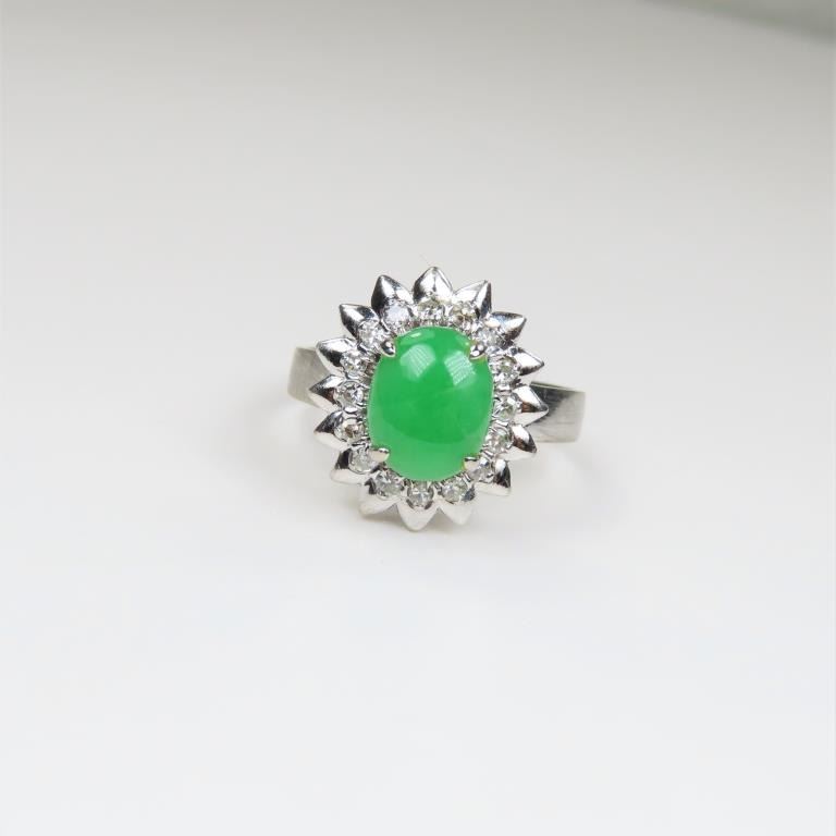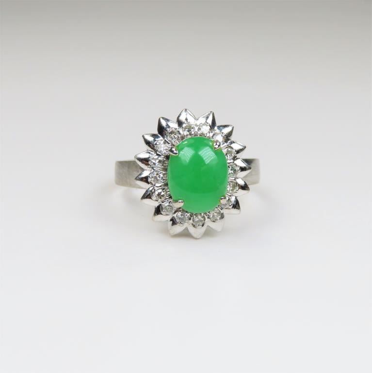Fine Jade and Diamond ring featuring an oval Green Jade and 16 round Diamonds set in 18 karat white gold setting. Retail $2,000-$3,000 Estimates $1,500-$2,000