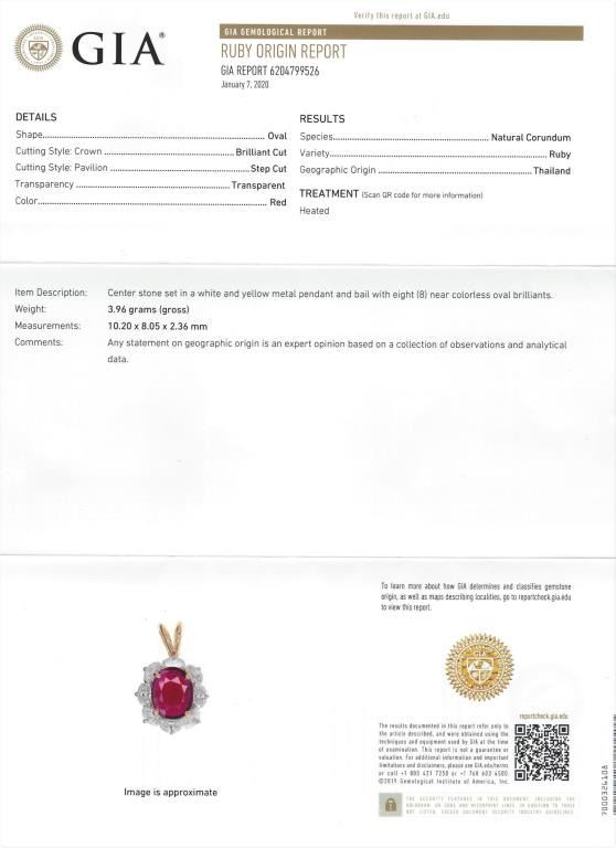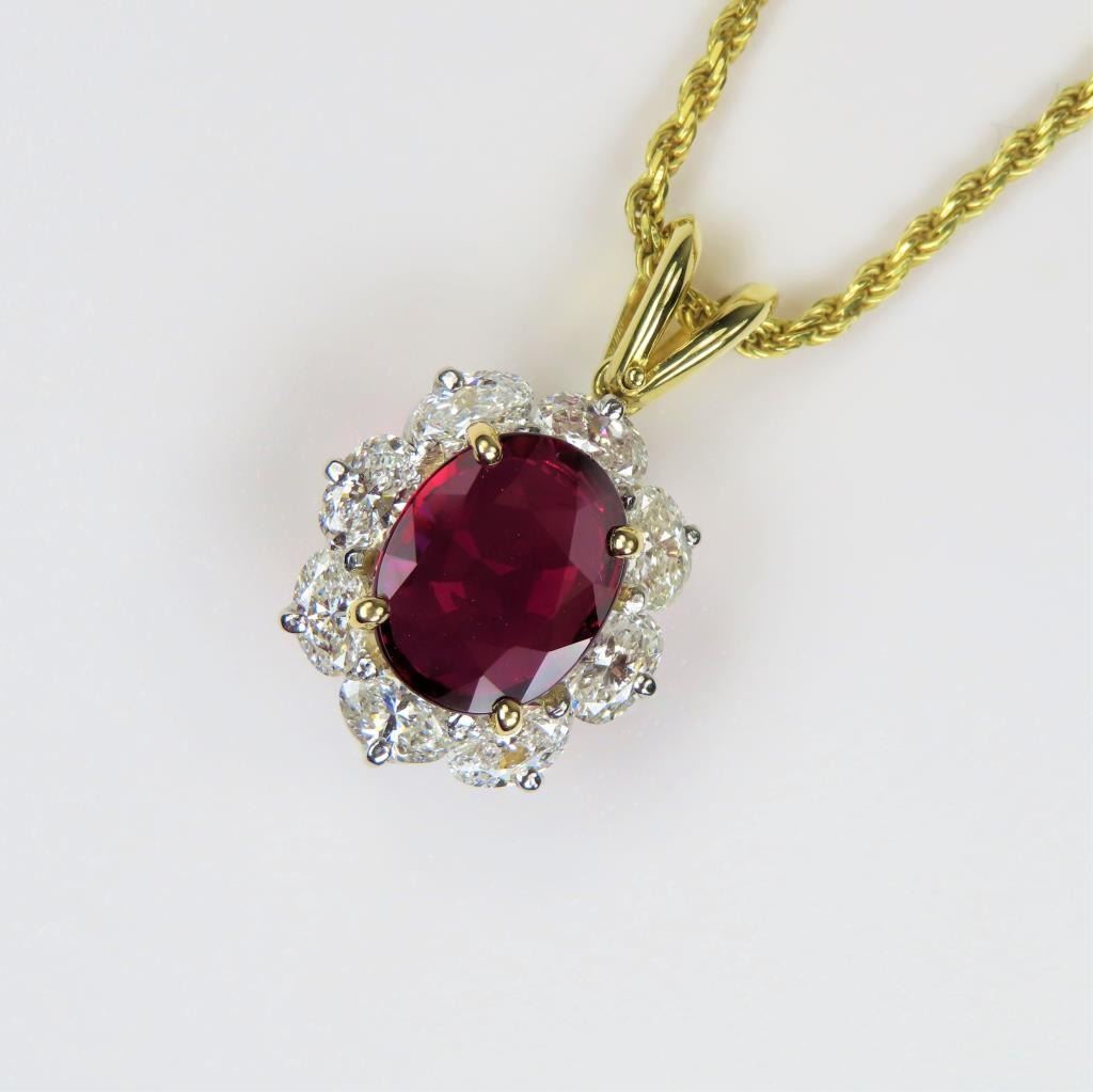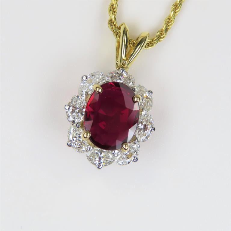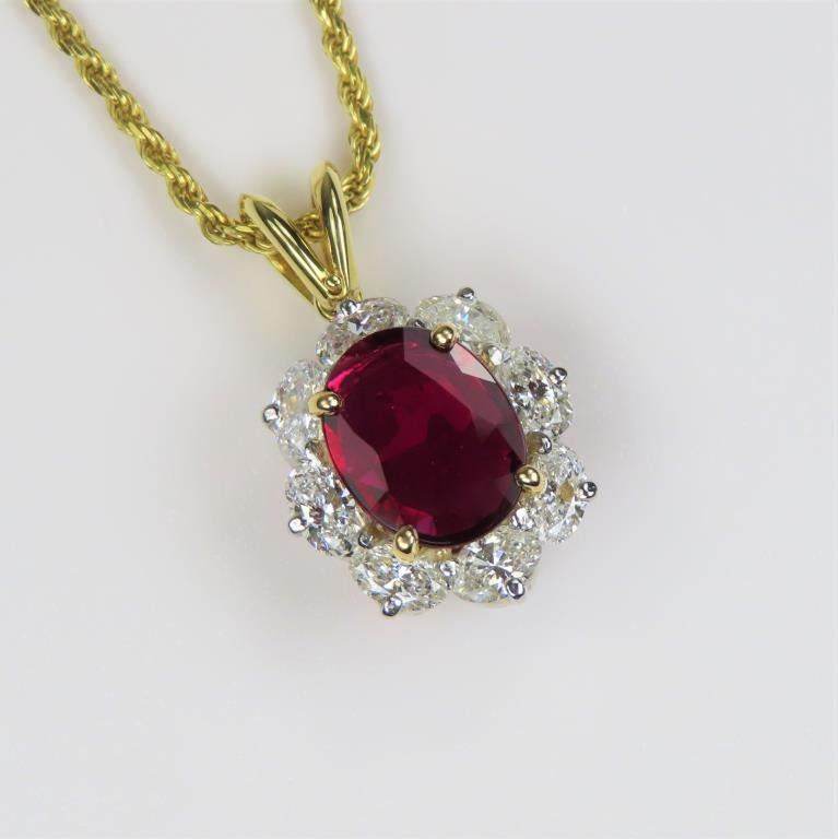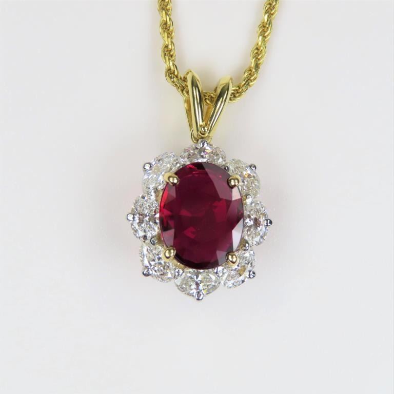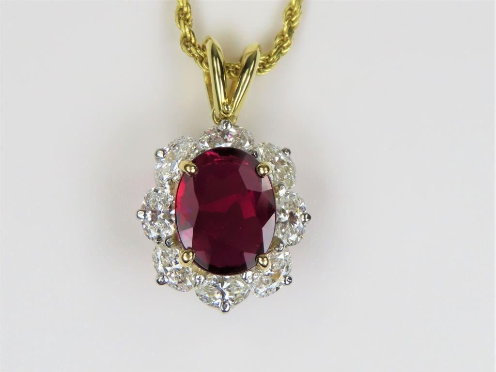 Spectacular Fine Quality Ruby and Diamond Pendant with G.I.A. Certified Natural oval cut Ruby with exceptionally vivid Red color weighing 2.06 carats beautifully framed with 8 oval cut Diamonds weighing 1.84 carats with F-G colors and SI clarity set in 14 karat yellow gold. Collection Piece. Comes with Full Appraisal – Valued at $24,500.00 Estimates $14,000-$18,000