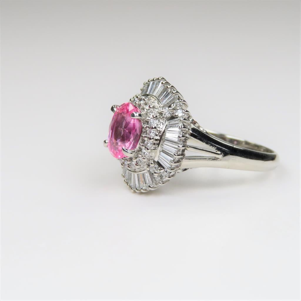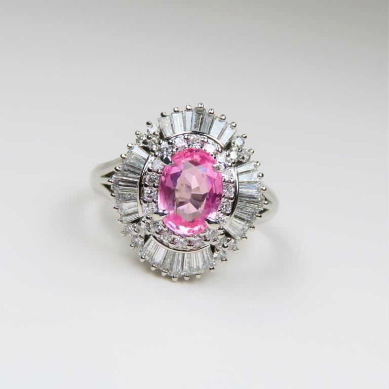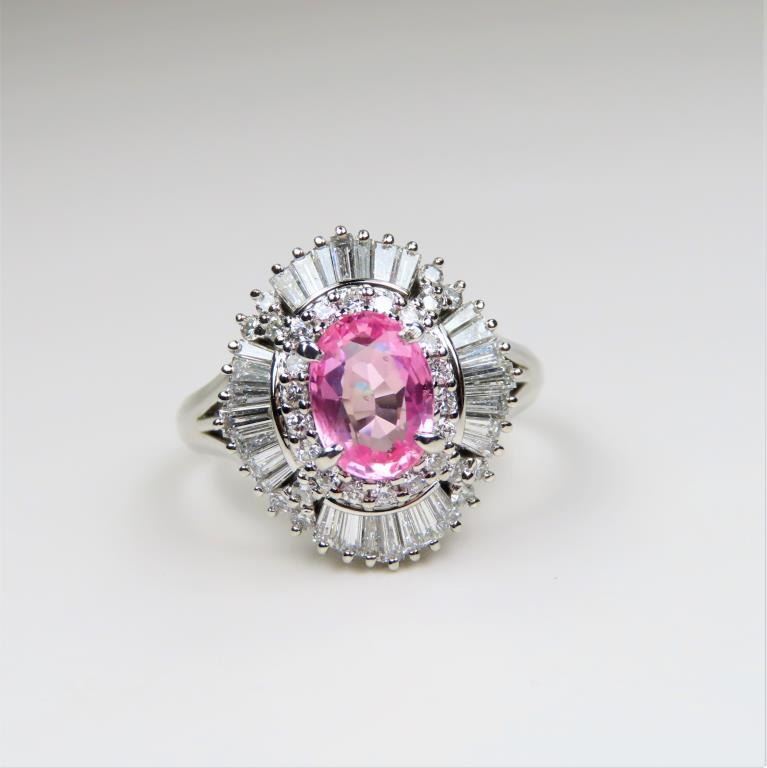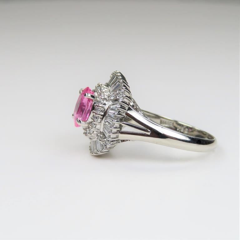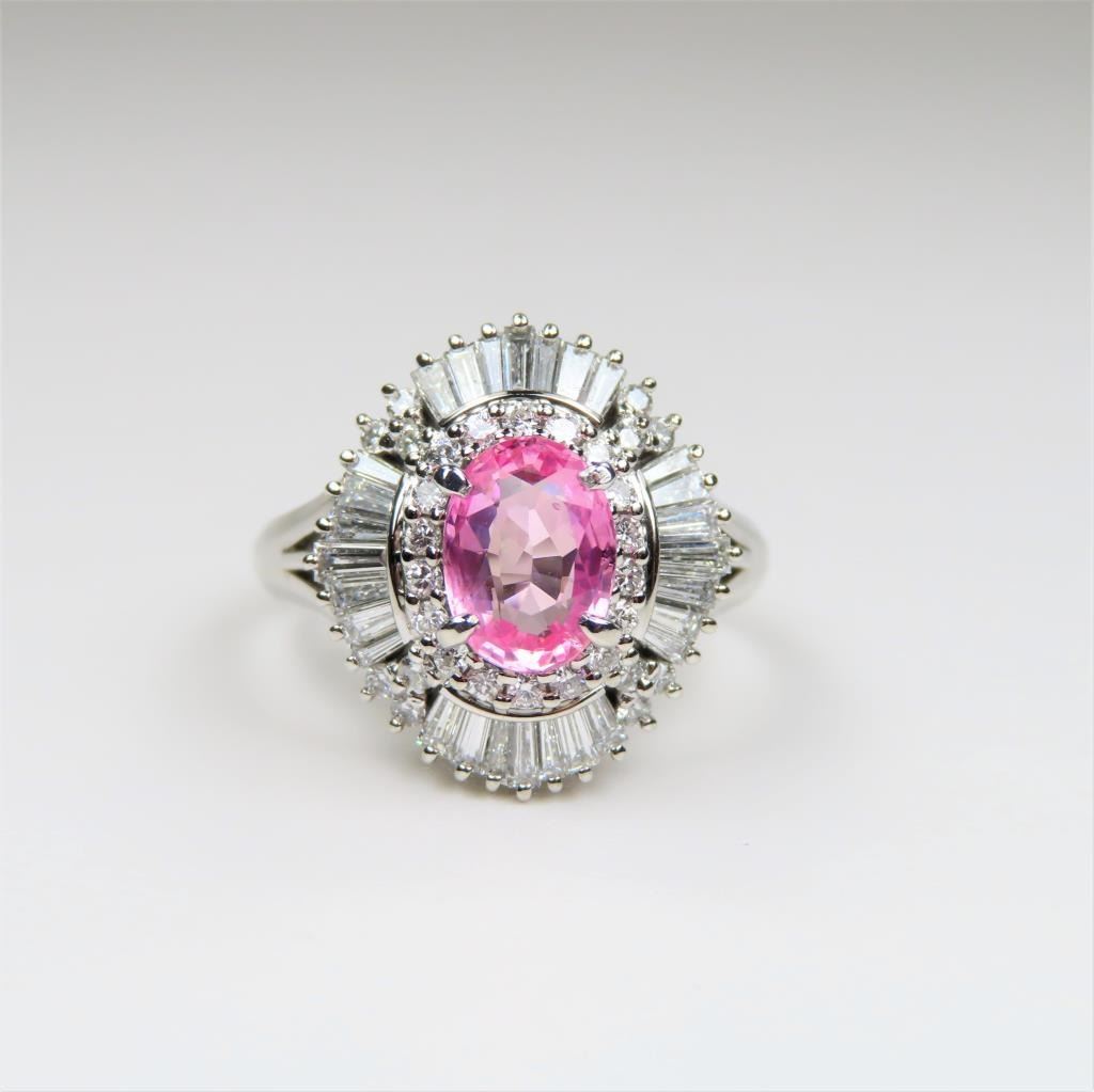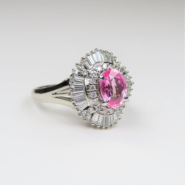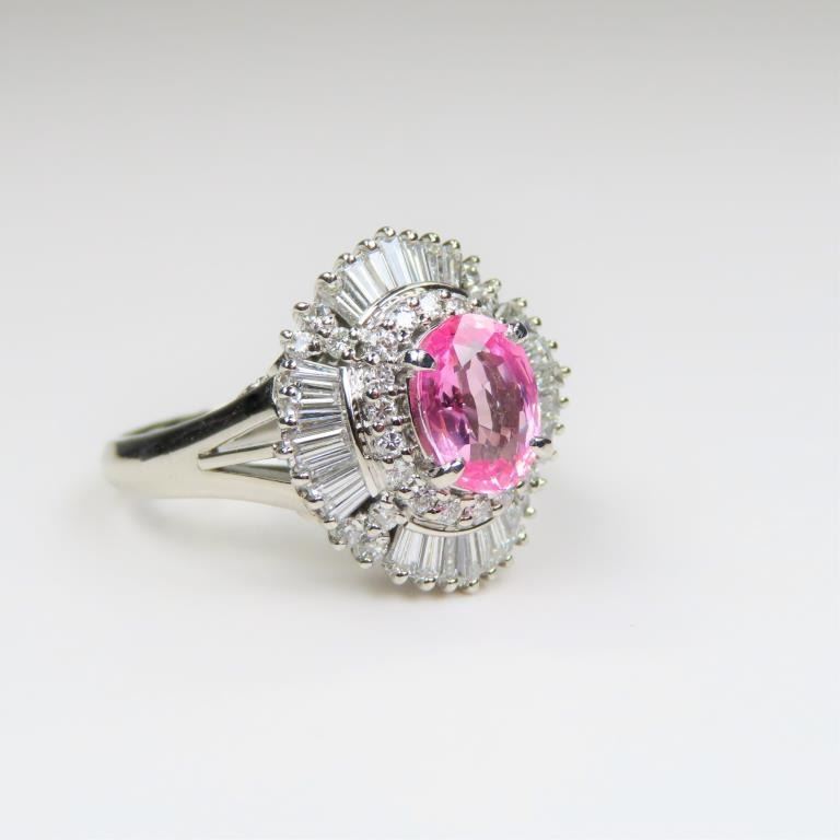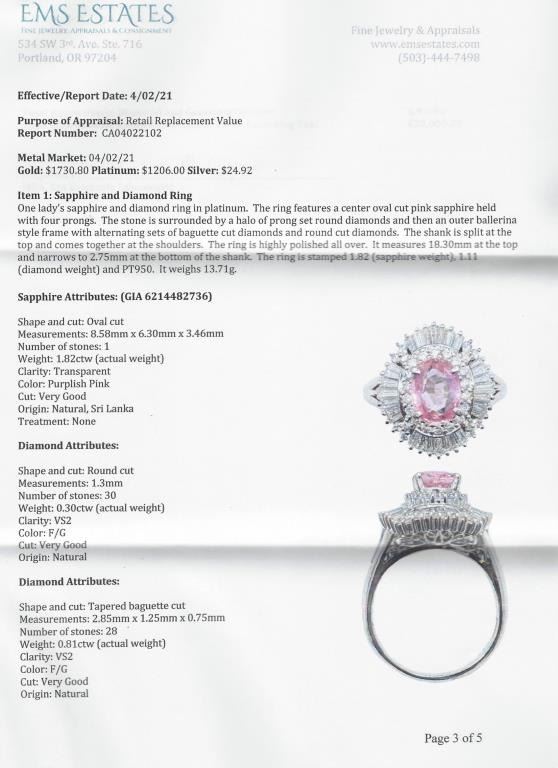 Exquisite 100% Natural Pink Sapphire and Diamond Platinum Ring G.I.A. Certified rare No Heat oval Pink Sapphire weighing 1.82 carats accented in a ballerina style setting with 28 baguette and 30 round Diamondsweighing 1.11 carats total with F-G colors and VS clarity set in heavy Platinum setting weighing 13.71 grams. Comes with Full Appraisal – Valued at $20,000.00 Estimates $8,000-$10,000
