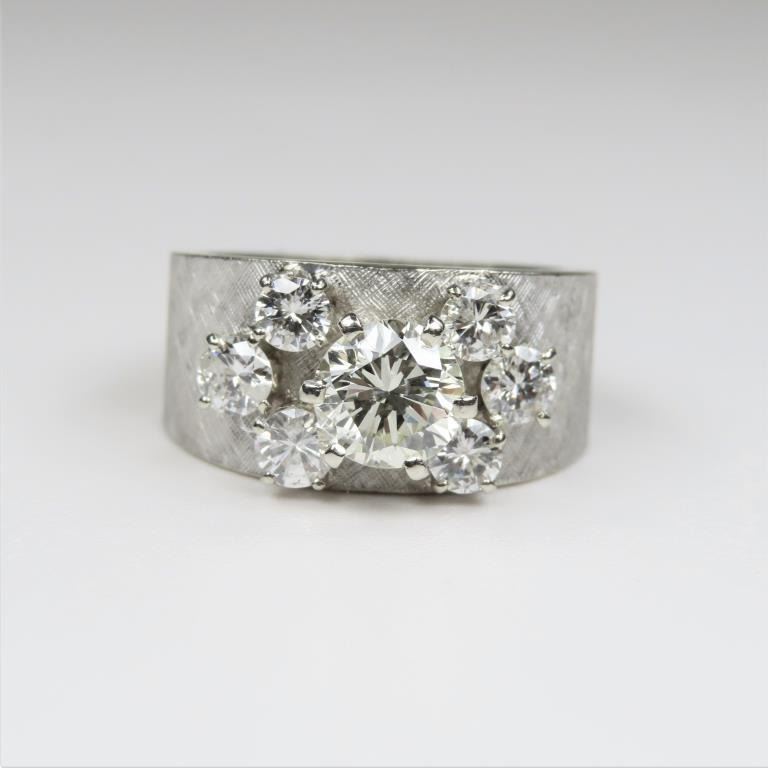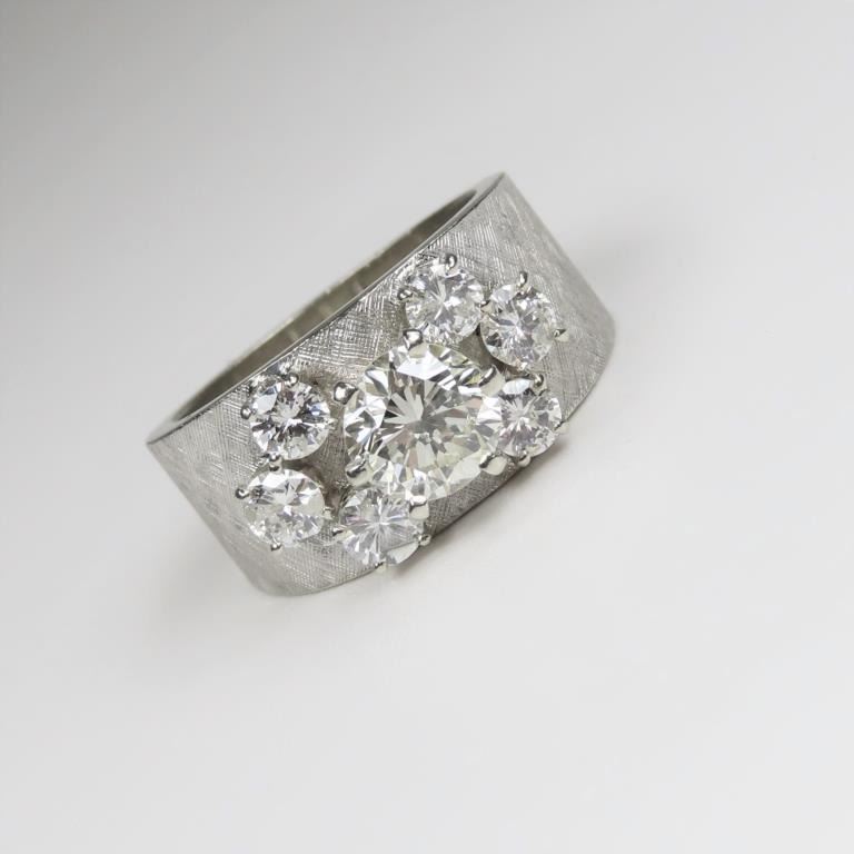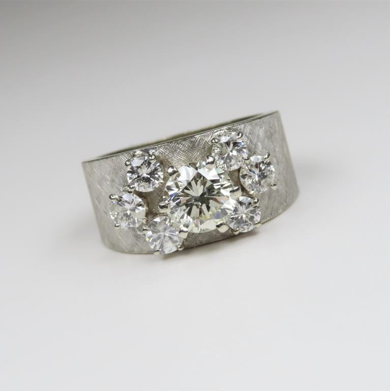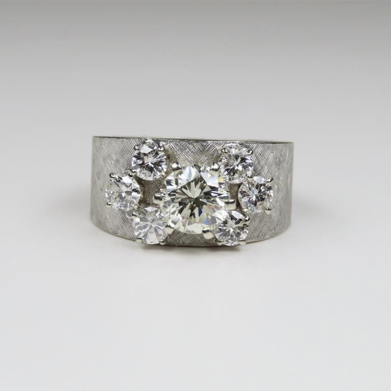 Brilliant Contemporary Diamond Ring featuring a round center Diamond weighing approx. 1.05 carats with I-J-K color and SI clarity with 6 side Diamonds set in 14 karat white gold design with brushed band. Retail$$5,000-$7,000 Estimates $4,000-$6,000