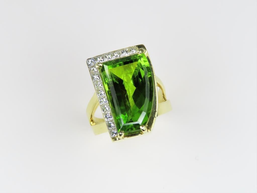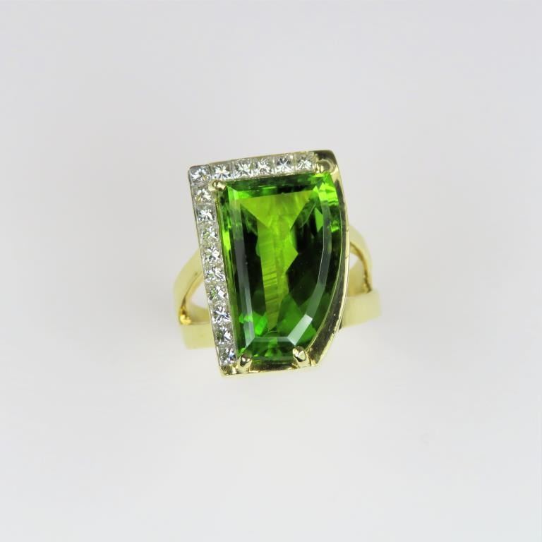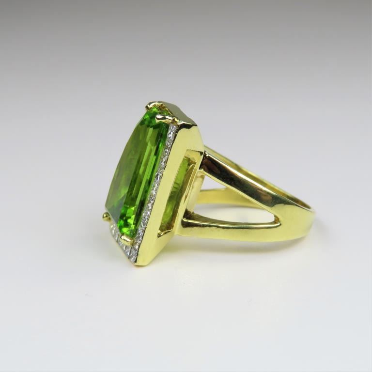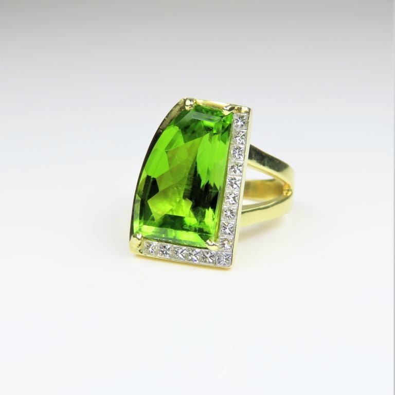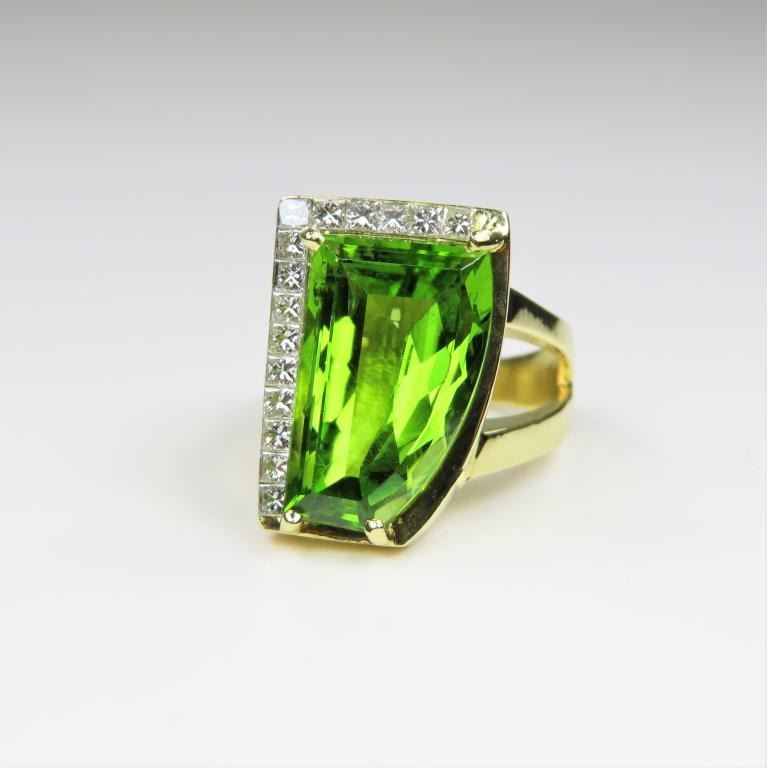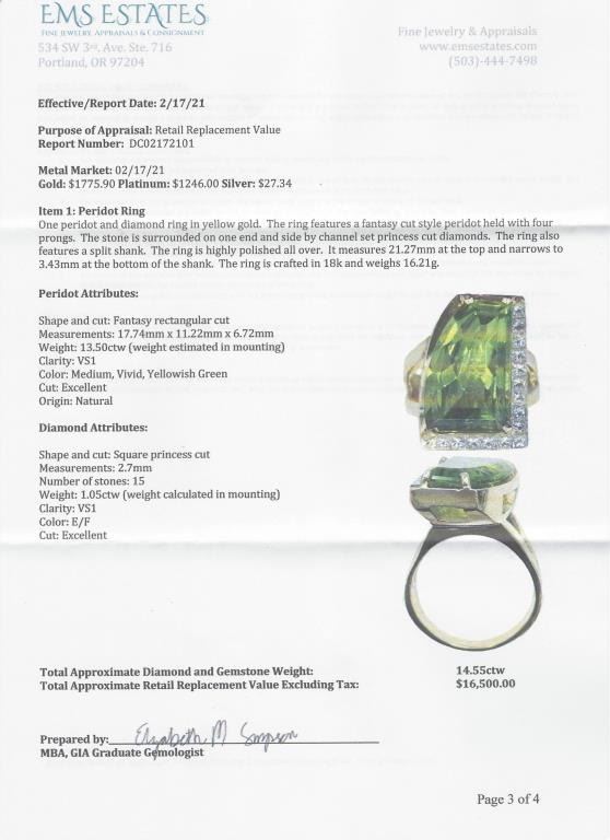 Sensational Fine Fantasy cut Peridot and Diamond Ring featuring an approx. 13.50 carat Peridot with vivid green color and VS clarity accented with 15 invisible set Princess cut Diamonds weighing approx. 1.05carats with E-F colors and VS clarity set in a dramatic designer 18 karat yellow gold setting weighing 16.21 grams. Comes with Full Appraisal- Valued at $16,500.00 Estimates $7,000-$9,000