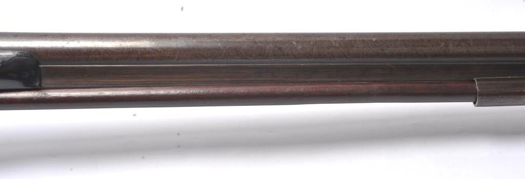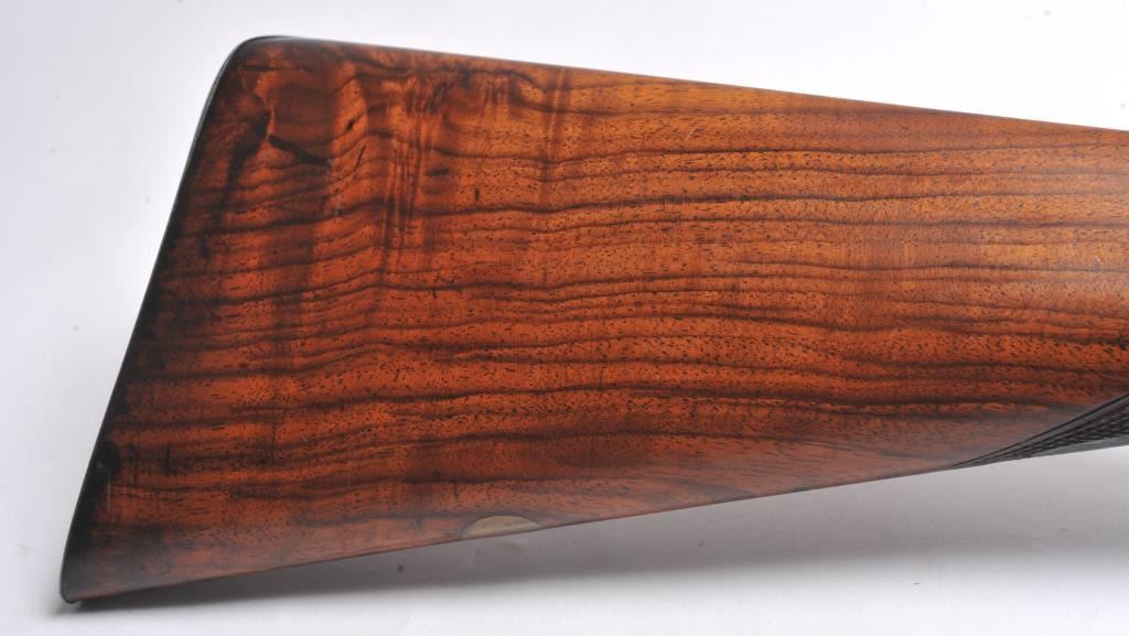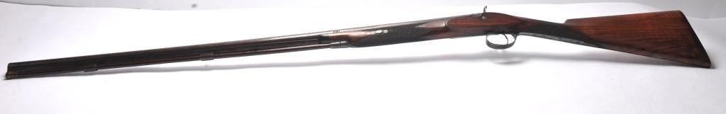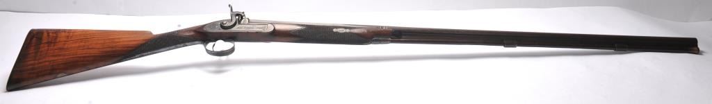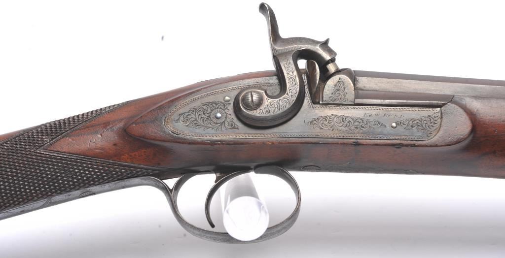 Original English E & W Bond quarter stocked percussion fowler, 20 gauge with a 36” octagon to round Damascus steel barrel marked, “HOOPER SQUARE LONDON”. The shotgun is in fine overall condition with the barrelhaving turned an even brown patina with a full-length wooden brass tipped ram rod. The lock, tang, hammer and trigger guard are beautifully engraved and case hardened. The finely checkered delicate wood stock is invery good condition with sharp checkering, a blank escutcheon plate in the butt, engraved cross pin and ends with a smooth steel butt plate which retains significant blue finish. The action is crisp on this beautiful London shotgun. E & W Bond was a noted London gunsmith, located at the Hooper Square address from 1845-1861. Est.: $1,250-$2,500. (Antique).