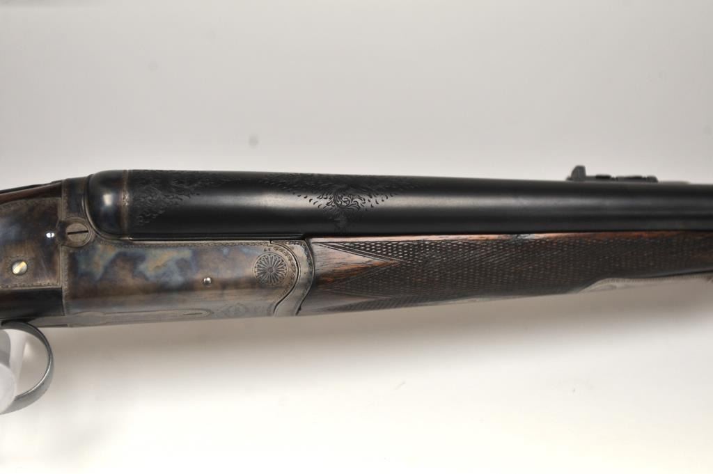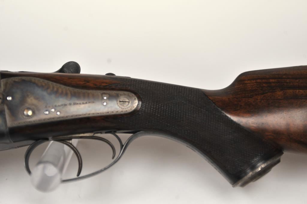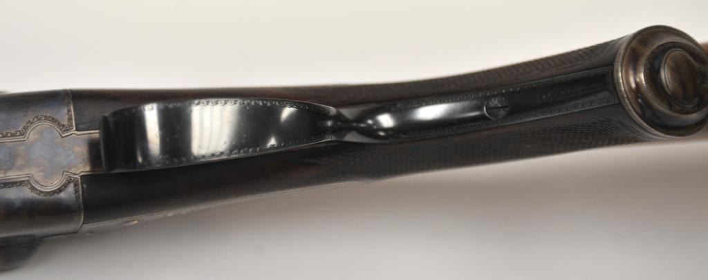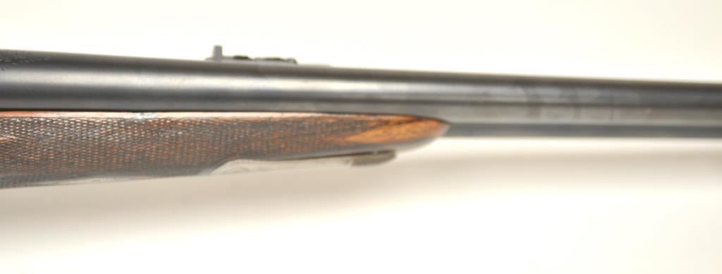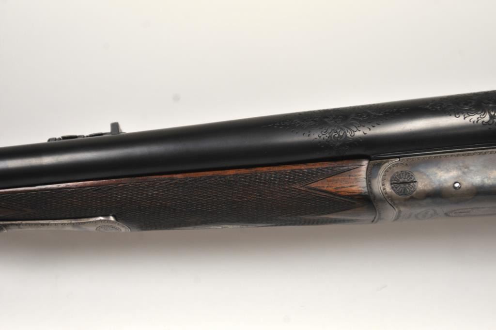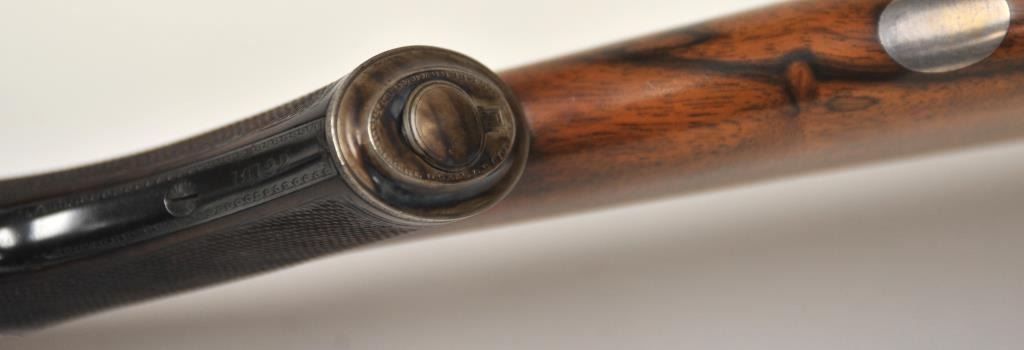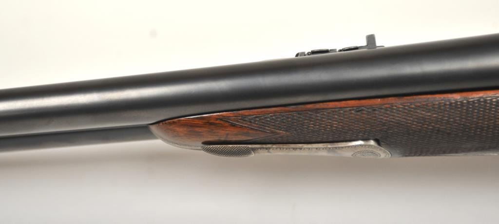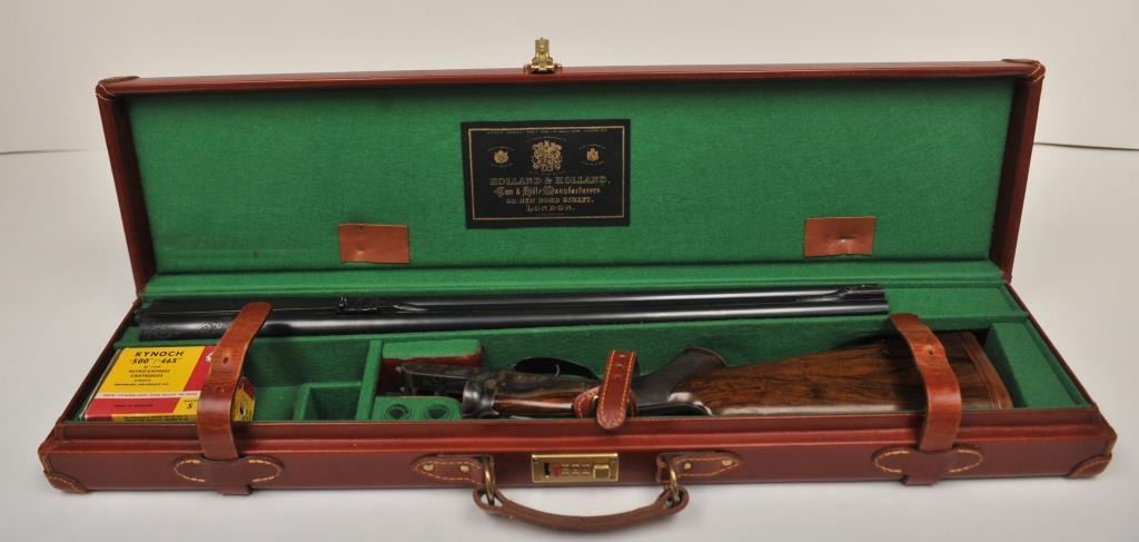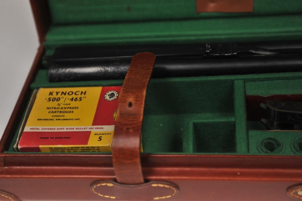 The rifle shows border engraving around the locks, with fancy scroll at the rear of the barrels and breech. The rifle features a three-leaf express rear sight and a flip-up front “Moon” sight. The action has scalloped fences at the rear of the action and an extended tang. The rifle is in fine to excellent overall condition as professionally refinished with mirror bright and crisp bores. The rifle is mechanically excellent, is on face and locks up tight. Proofed for 75 grains of cordite and a 480 grain bullet with disc set strikers. The stock is also near fine condition. The rifle comes with a luggage case with a Holland & Holland label in the lid, two full boxes of Kynoch .500-.465 caliber loaded ammunition (5 count) and one additional box of brass. A superior double rifle with an interesting history. Est.: $15,000-$30,000. (C+R).