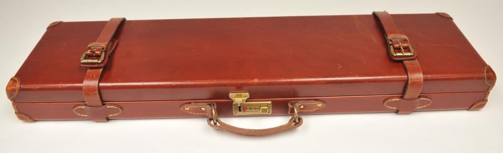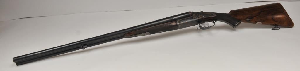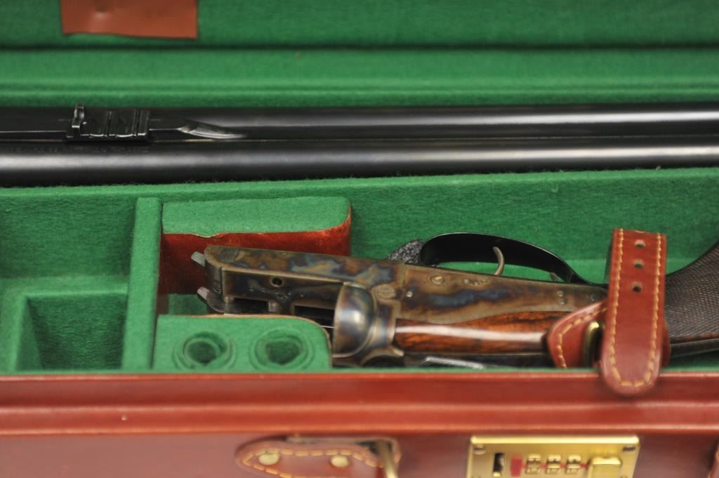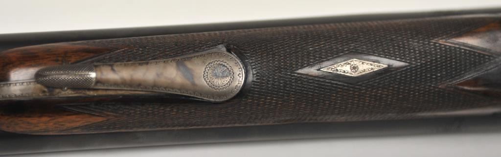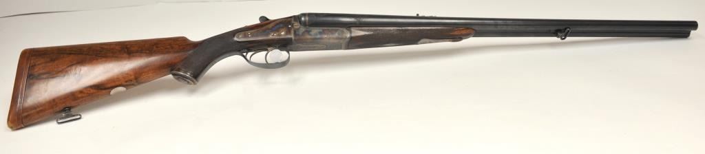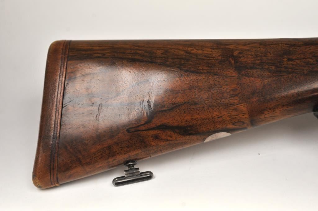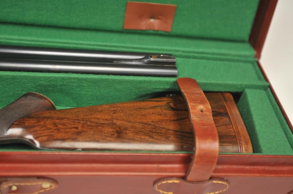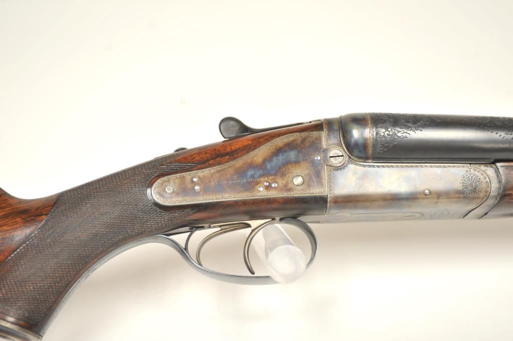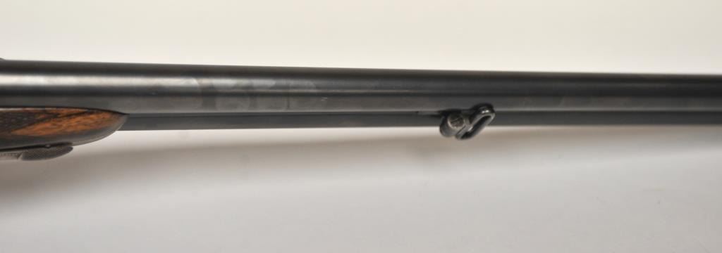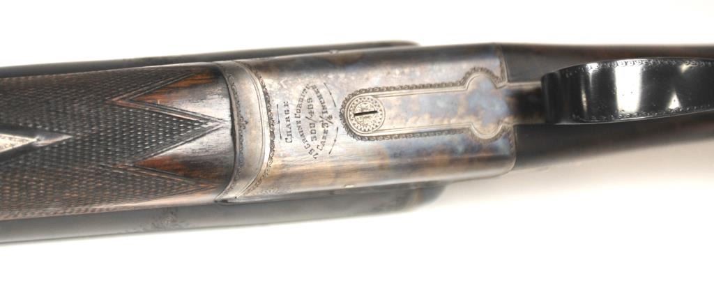 The rifle shows border engraving around the locks, with fancy scroll at the rear of the barrels and breech. The rifle features a three-leaf express rear sight and a flip-up front “Moon” sight. The action has scalloped fences at the rear of the action and an extended tang. The rifle is in fine to excellent overall condition as professionally refinished with mirror bright and crisp bores. The rifle is mechanically excellent, is on face and locks up tight. Proofed for 75 grains of cordite and a 480 grain bullet with disc set strikers. The stock is also near fine condition. The rifle comes with a luggage case with a Holland & Holland label in the lid, two full boxes of Kynoch .500-.465 caliber loaded ammunition (5 count) and one additional box of brass. A superior double rifle with an interesting history. Est.: $15,000-$30,000. (C+R).