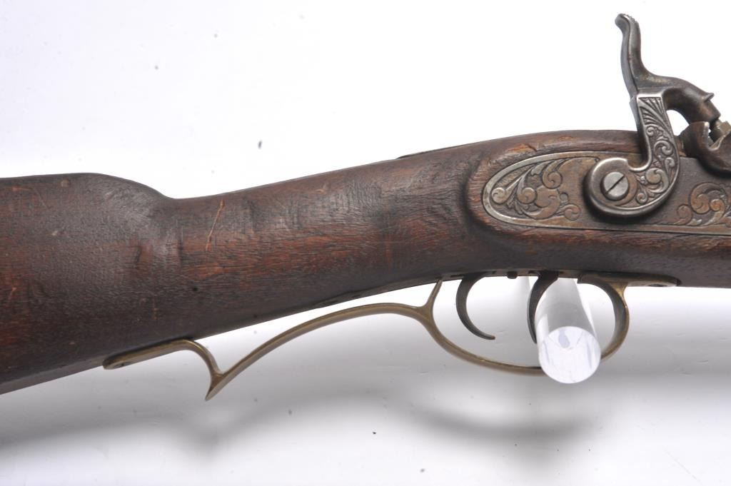 Half stock percussion .50 caliber plains type rifle antiqued and decorated by movie studio’s for iconic movie “The Mountain Men” as used by Charlton Heston who starred in the film (1979). Stembridge tag penned byhistorian Walter O’Conner identifies on the front and has location #RP00190 on the back. Last sold by Little Johns at the auction of the Stembridge Arsenal Collection Lot 103 in 2007. Further documented by stills of Hestonholding it. 1 of 3 known to have been used by “Our President” and the other on display at N.R.A. museum also from the Stembridge Arsenal collection. The rifle is a Thompson Center Hawken style repro that gunsmithsaged, tacked, wore down and appear like an authentic mountain man gun of the 1850s. Est.: $2500-$5000